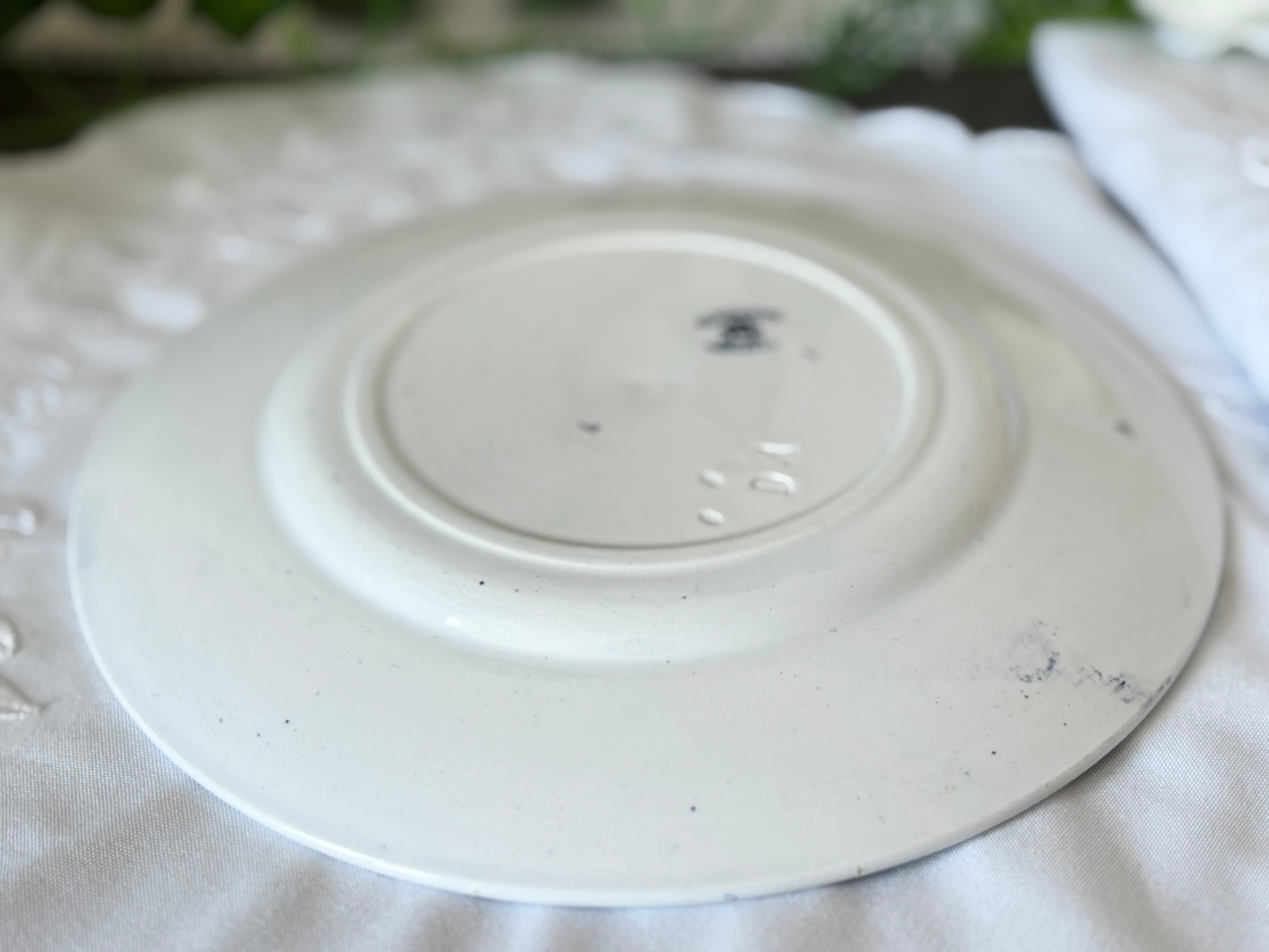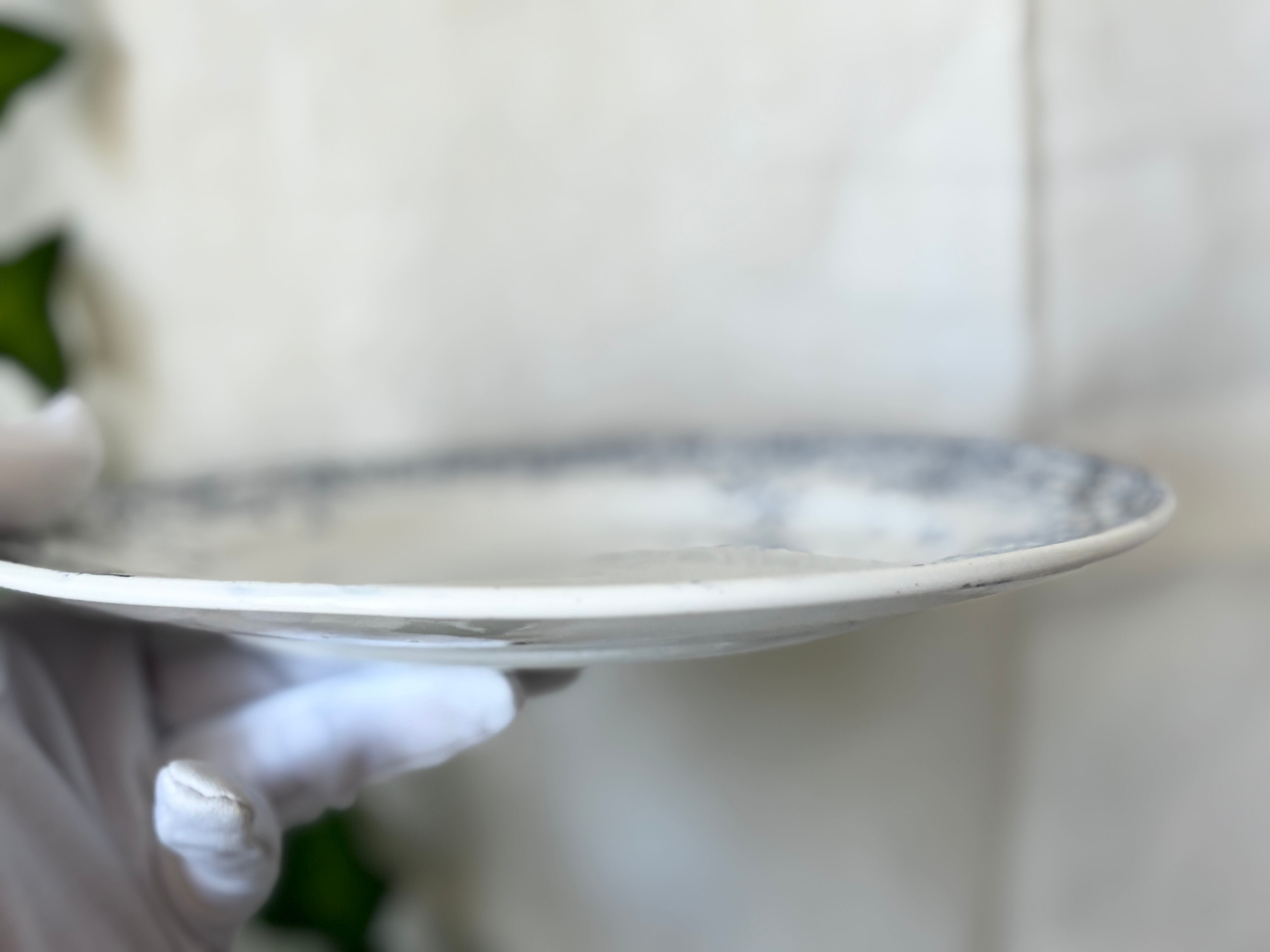 アイテムのコンディションとして、表面は、絵柄に掠れた部分が多くあり、色飛びとカトラリー跡と小傷がございます。リムに小さなV字状のヒビがございます。また、お皿の中央エリアに一箇所ポツリと凹んだ傷がございます。横から見ると色飛びとエナメルのムラがございます。裏側には色飛びが多く、リムを中心に制作時に出来たと思われる、ライン状の筋が何本もございます。また、エナメルのムラによる、段差も数箇所ございます。掠れ、滲みはありますが、裏に刻印がございます。