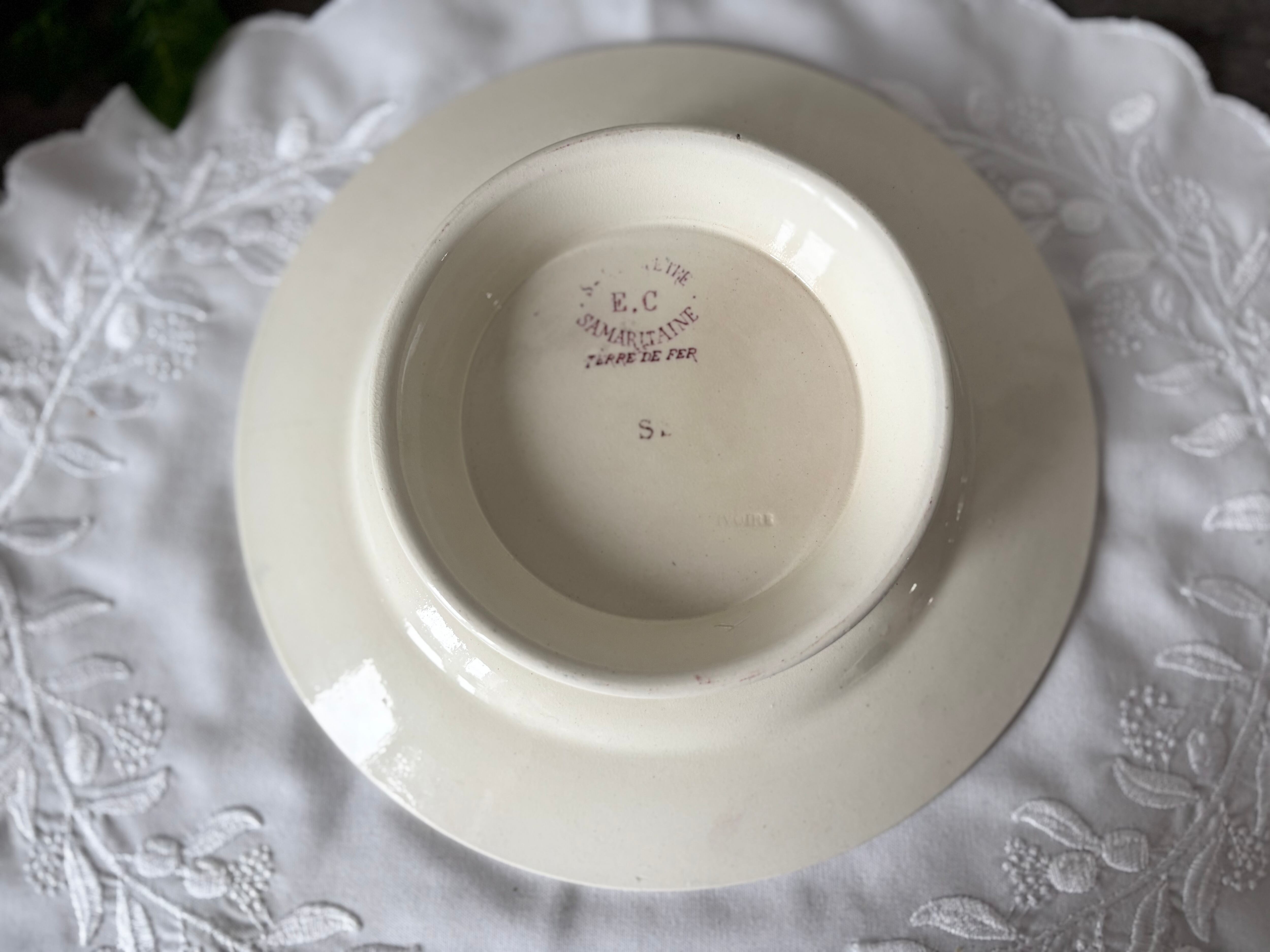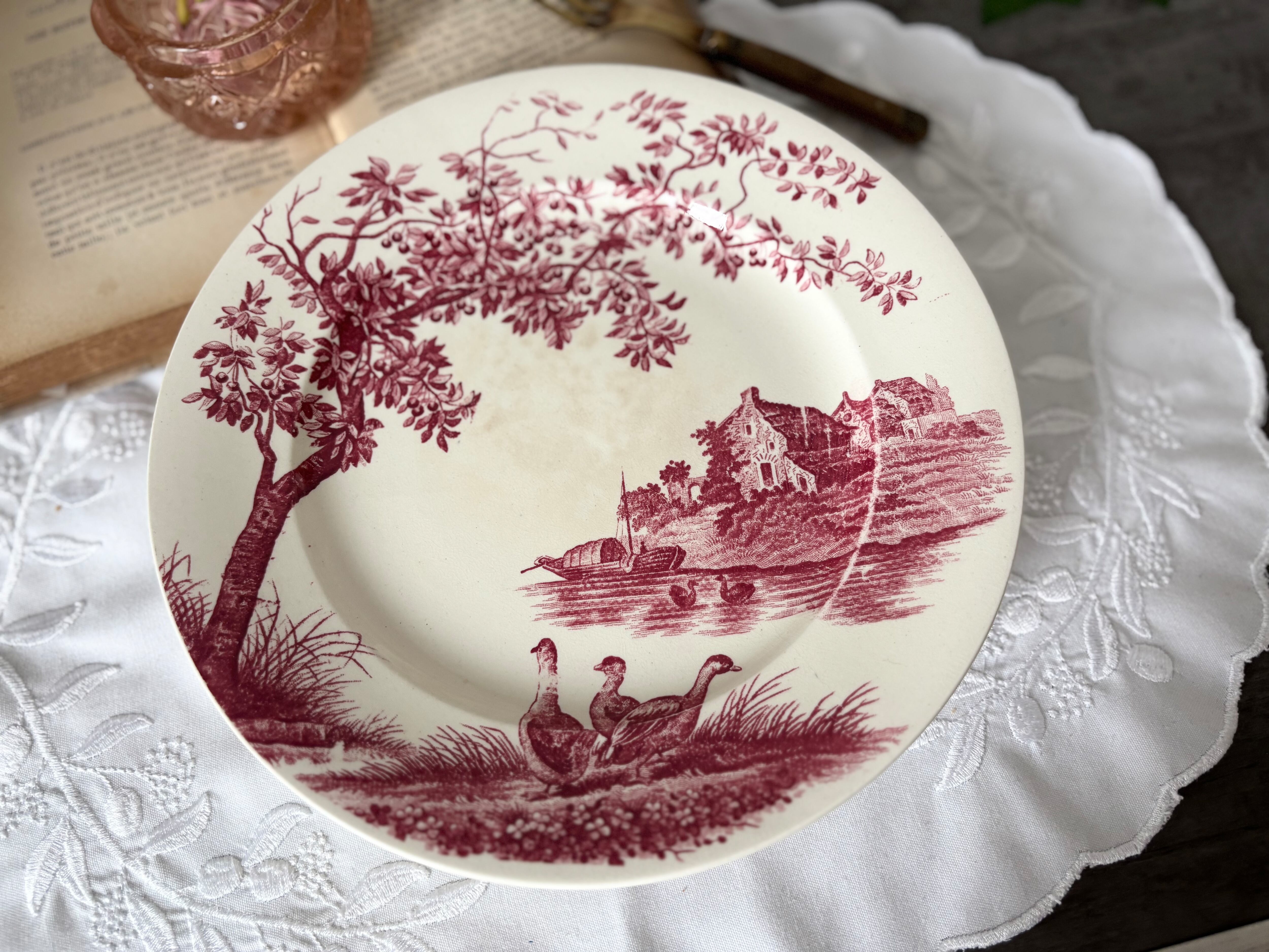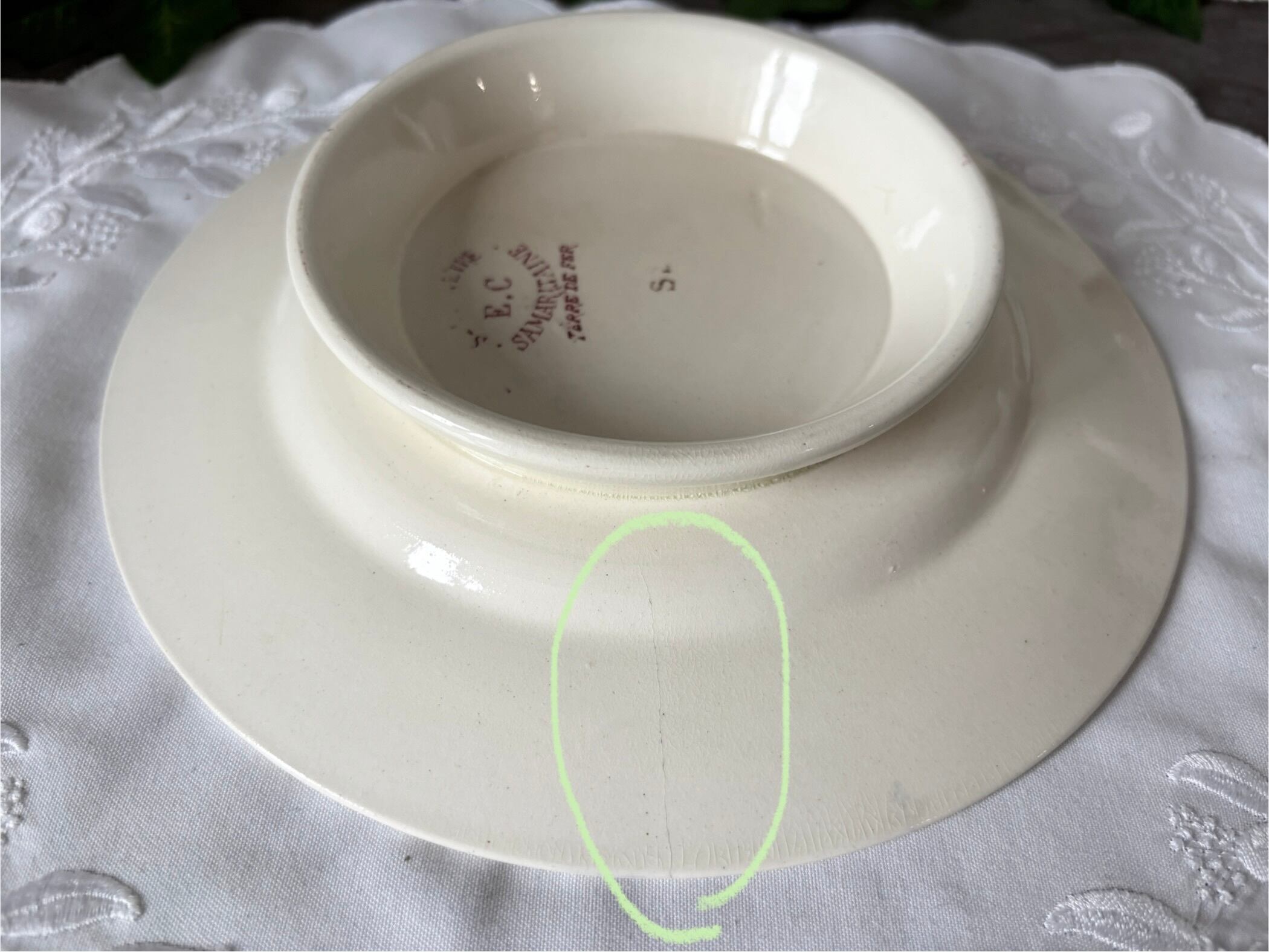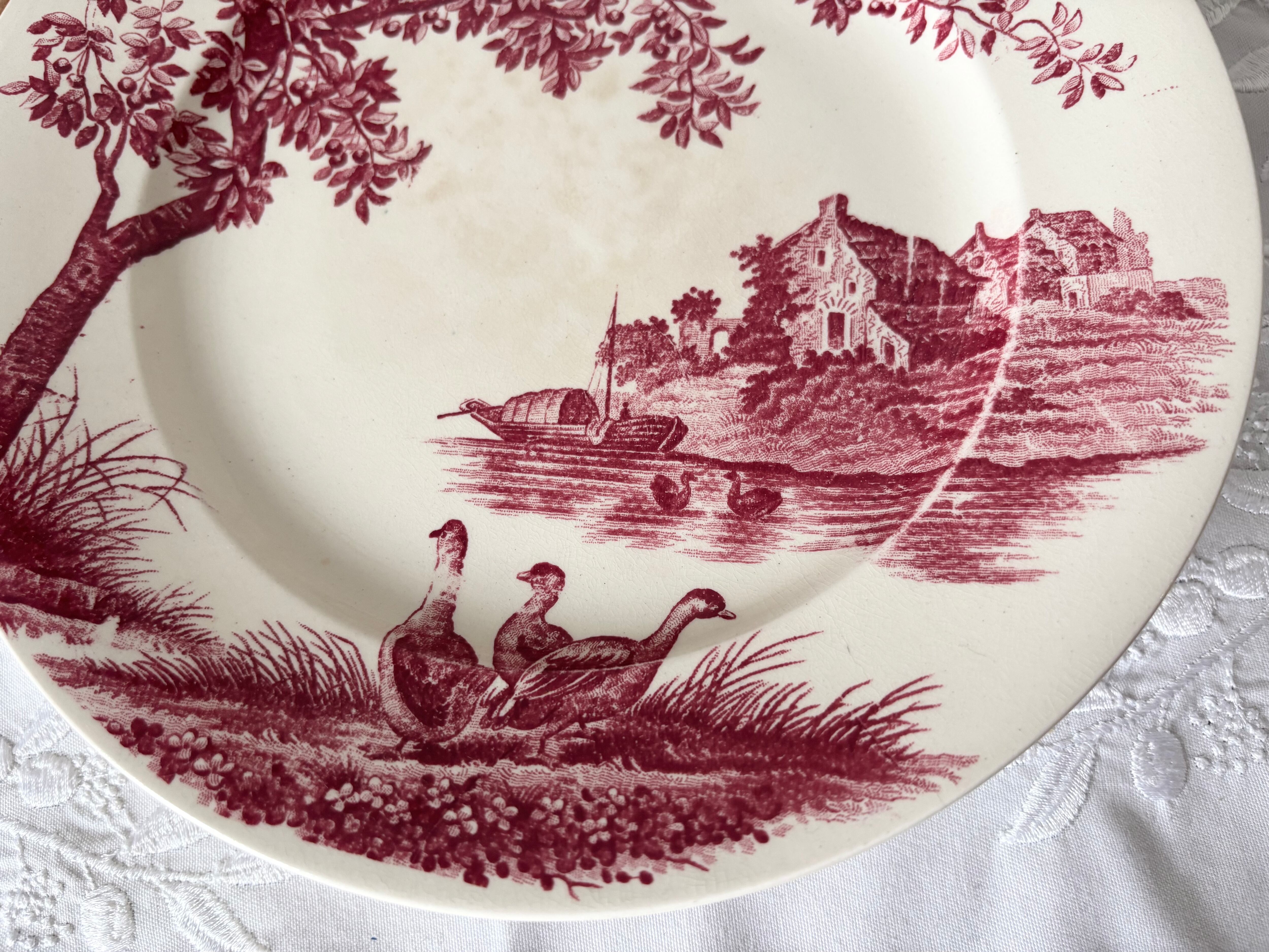 アイテムのコンディションとして、器全体に経年劣化の色褪せが広がっています。お皿の中央付近にブラウンのシミが広がっています、絵柄と刻印に、掠れ、若しくは途切れがあります。リムに一箇所(鴨3羽の右側)ひび割れがあり、これは裏まで貫通しています。裏側に赤い色飛びが数カ所と小傷がございます。掠れてはいますが、テールドフェールの押印もあり、大変艶やかで、アンティークとして、良い状態のお品です。