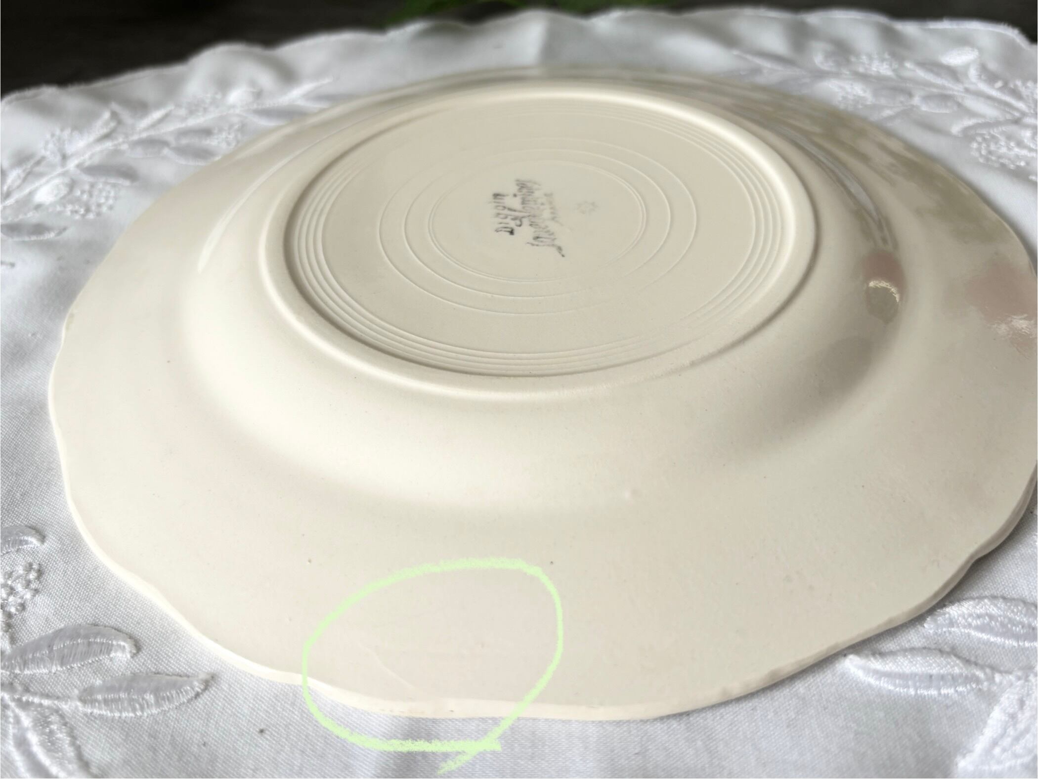 アイテムのコンディションとして、カトラリー傷が多少あり、その他に小傷が多少ございます。また、リムの端に貫入があり、横から見るとリムに僅かに擦れた様な傷がいくつかございます。裏にエナメルの不均一による高低差がある部分が認められます。掠れてはいますが、裏に刻印がございます。