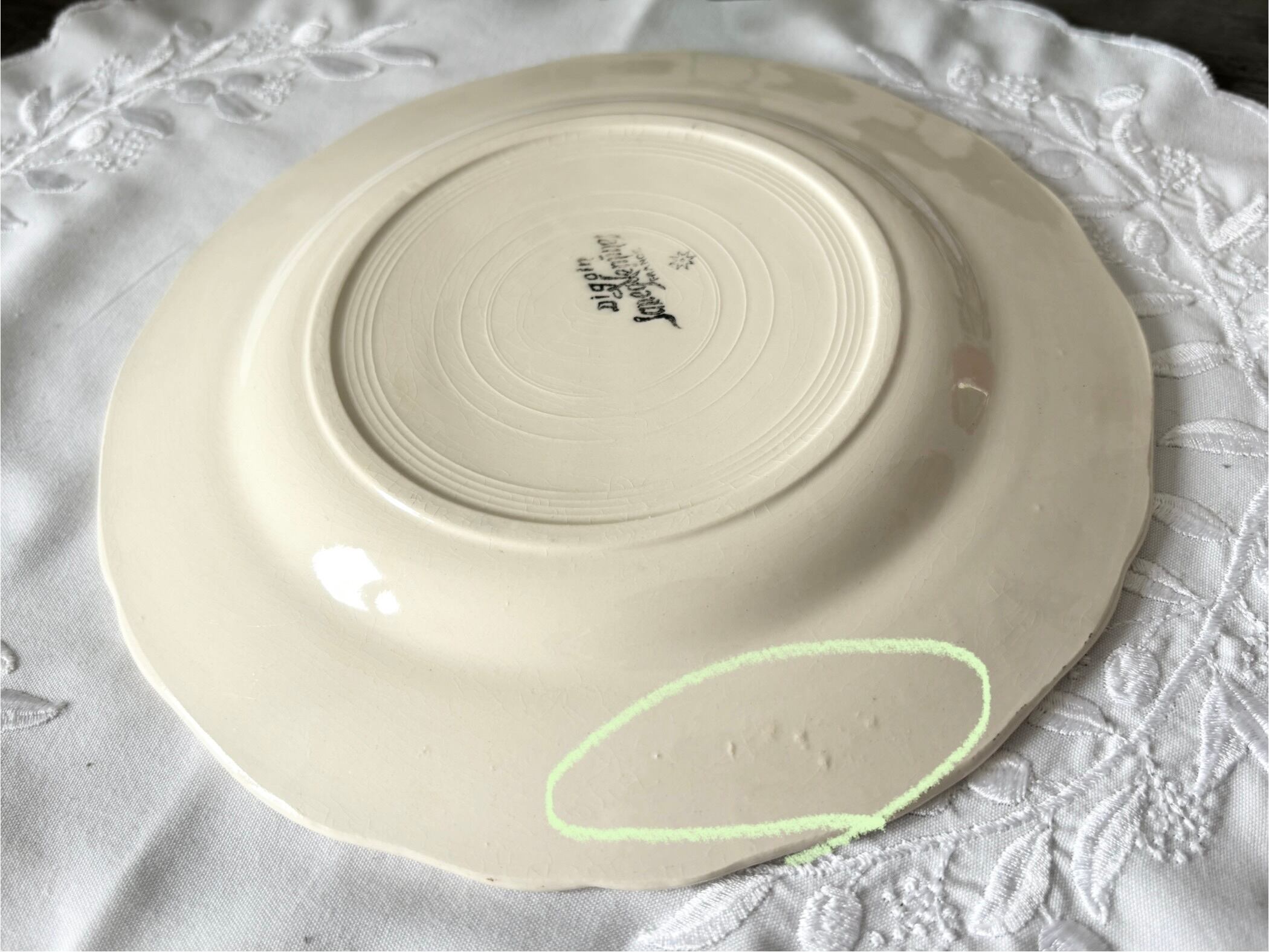 アイテムのコンディションとして、全体に貫入があり、表面にカトラリー傷が多少ございます。表面に、エナメルの不均一で膨らんだ箇所がございます。また、リムの端に貫入があり、横から見るとリムに僅かに擦れた様な傷がいくつかございます。裏にエナメルの不均一による高低差が点々とございます。掠れてはいますが、裏に刻印がございます。