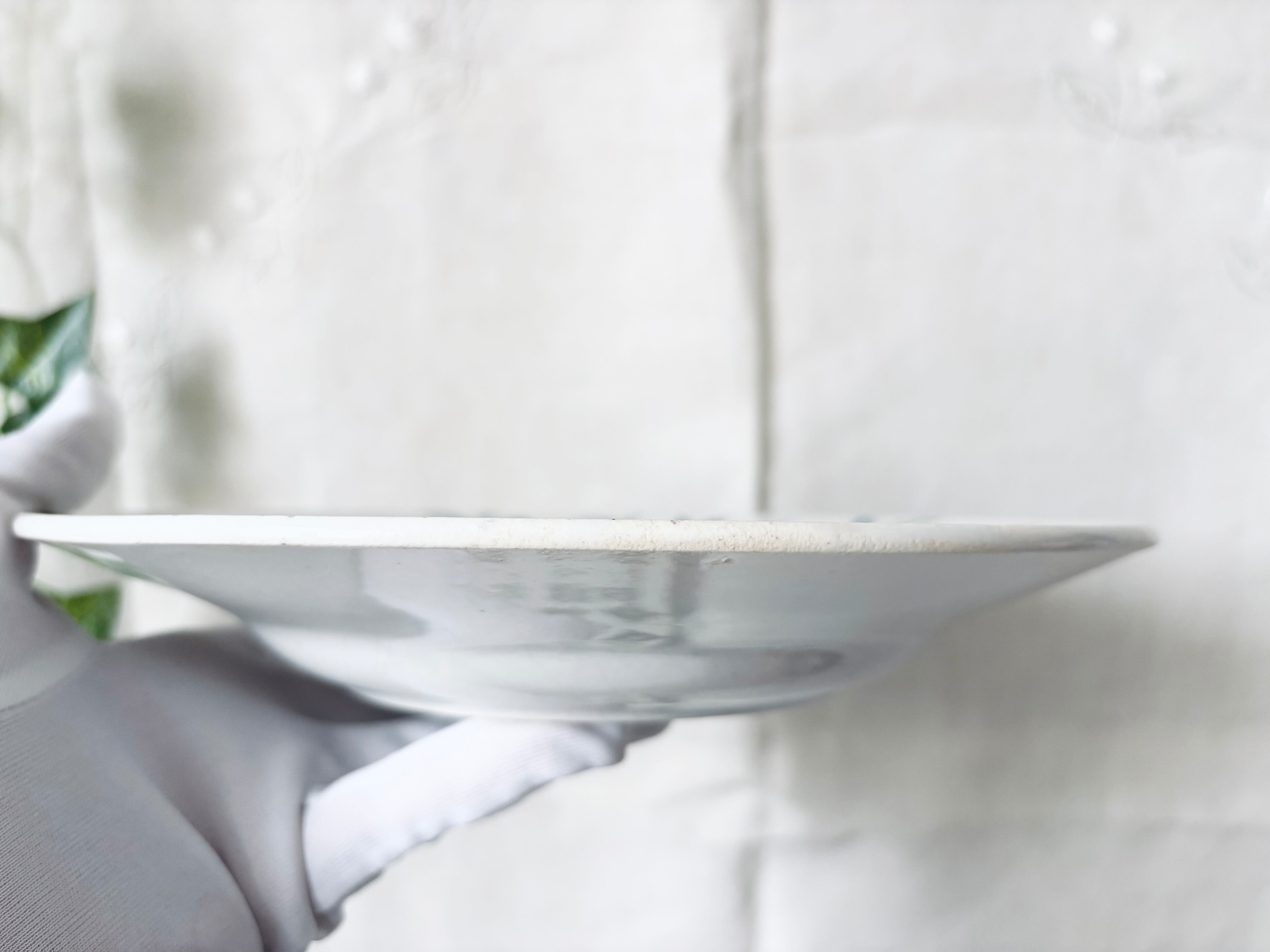 アイテムのコンディションとして、細かなクレイジングが器全体に広がり、その一部が変色しています。特に、器のくぼみとリムの境に幾つか茶色みを帯びた変色と、色飛びもございます。お皿を横から見ると、小さな傷やざらつき、エナメルの不均一により、でこぼこした箇所がございます。裏側もクレイジングが広がり、色飛びもございます。エナメルの不均一で、一箇所写真に印した部分にざらつきがございます。絵柄と刻印に掠れや途切れもございますが、大変艶やかで、良い状態のお品といえます。