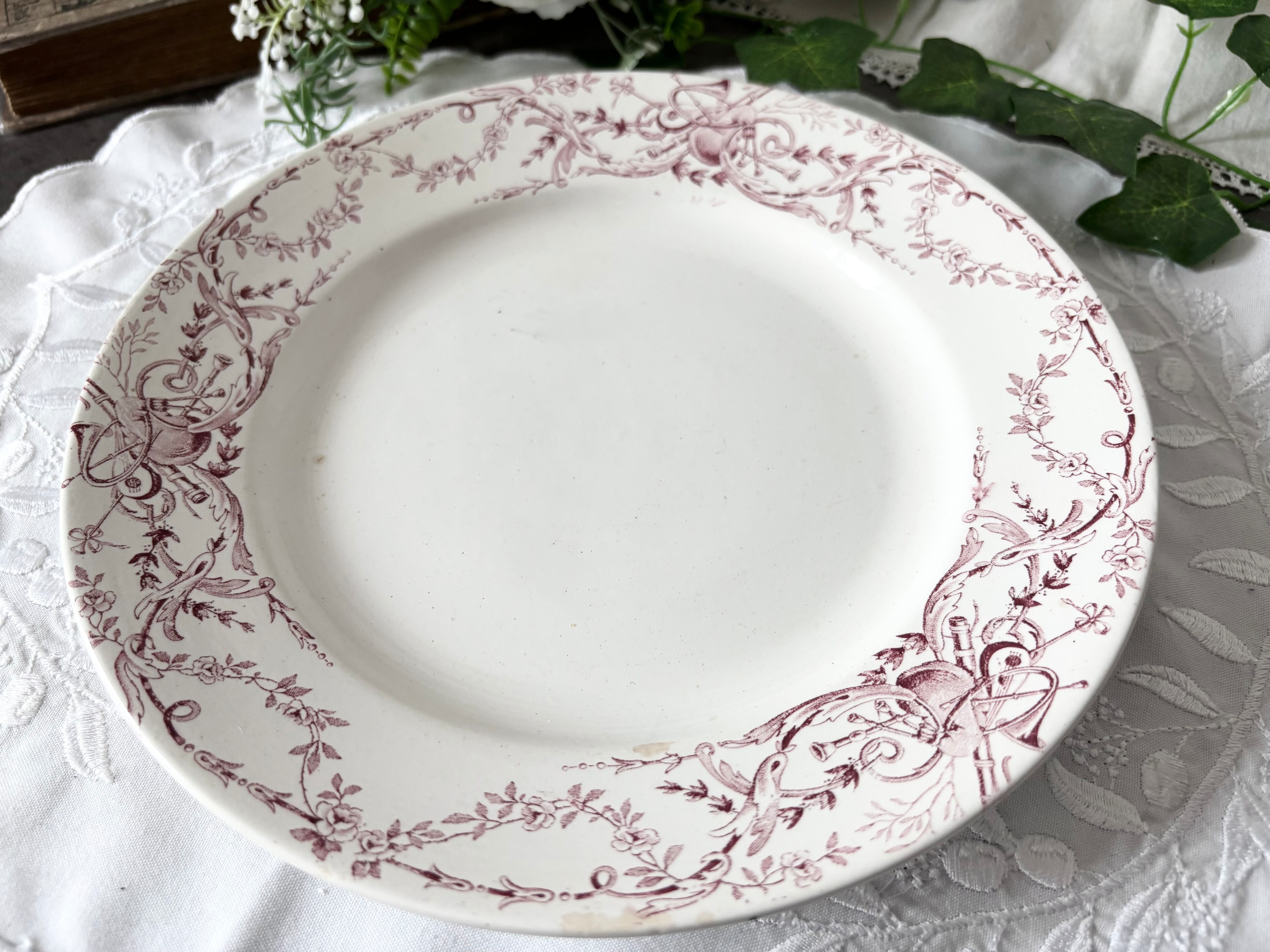 落ち着いたボルドーカラーの転写式印刷で、楽器をモチーフに、薔薇のガーランドが、華やかに、軽やかに広がっています。