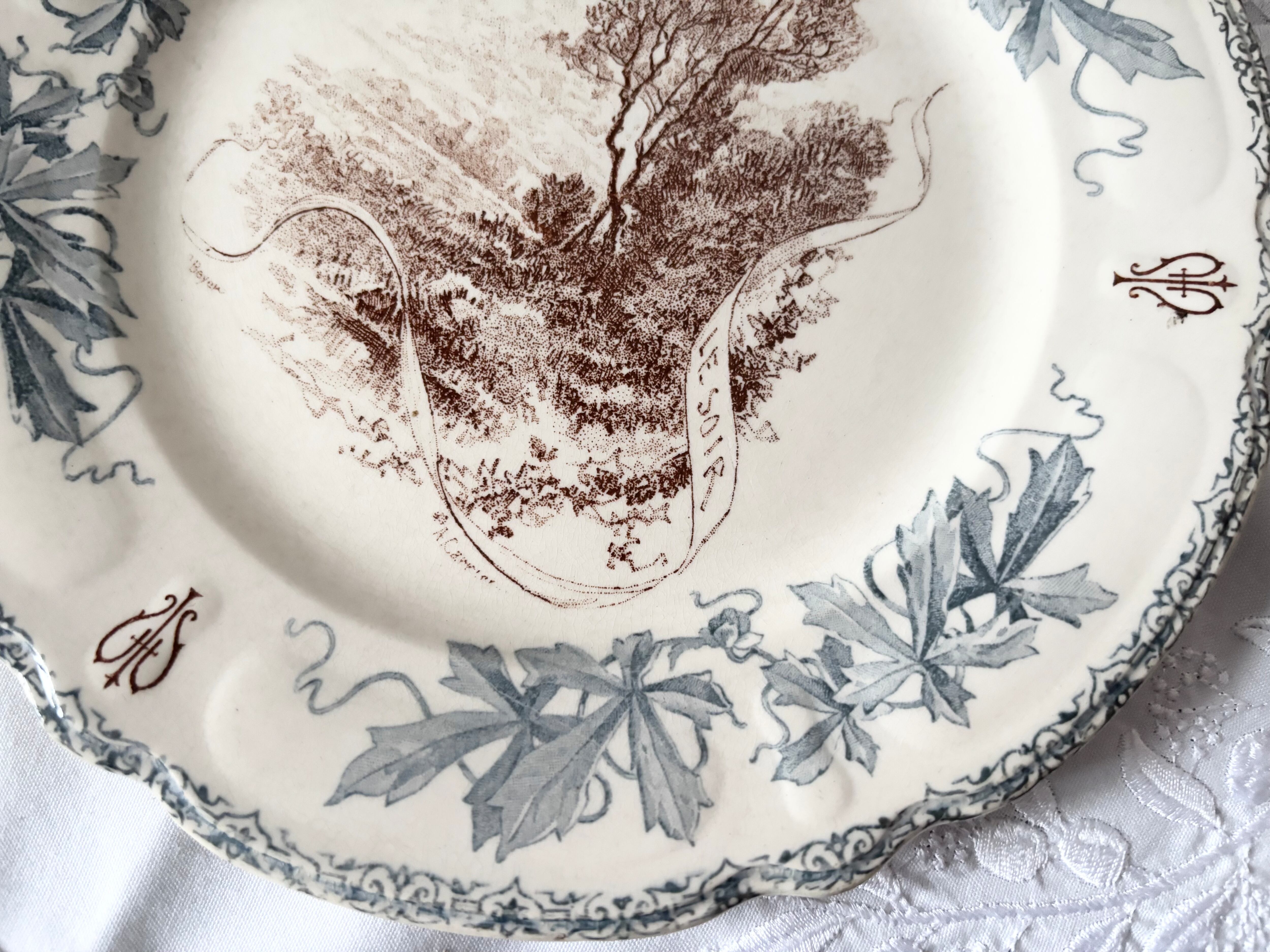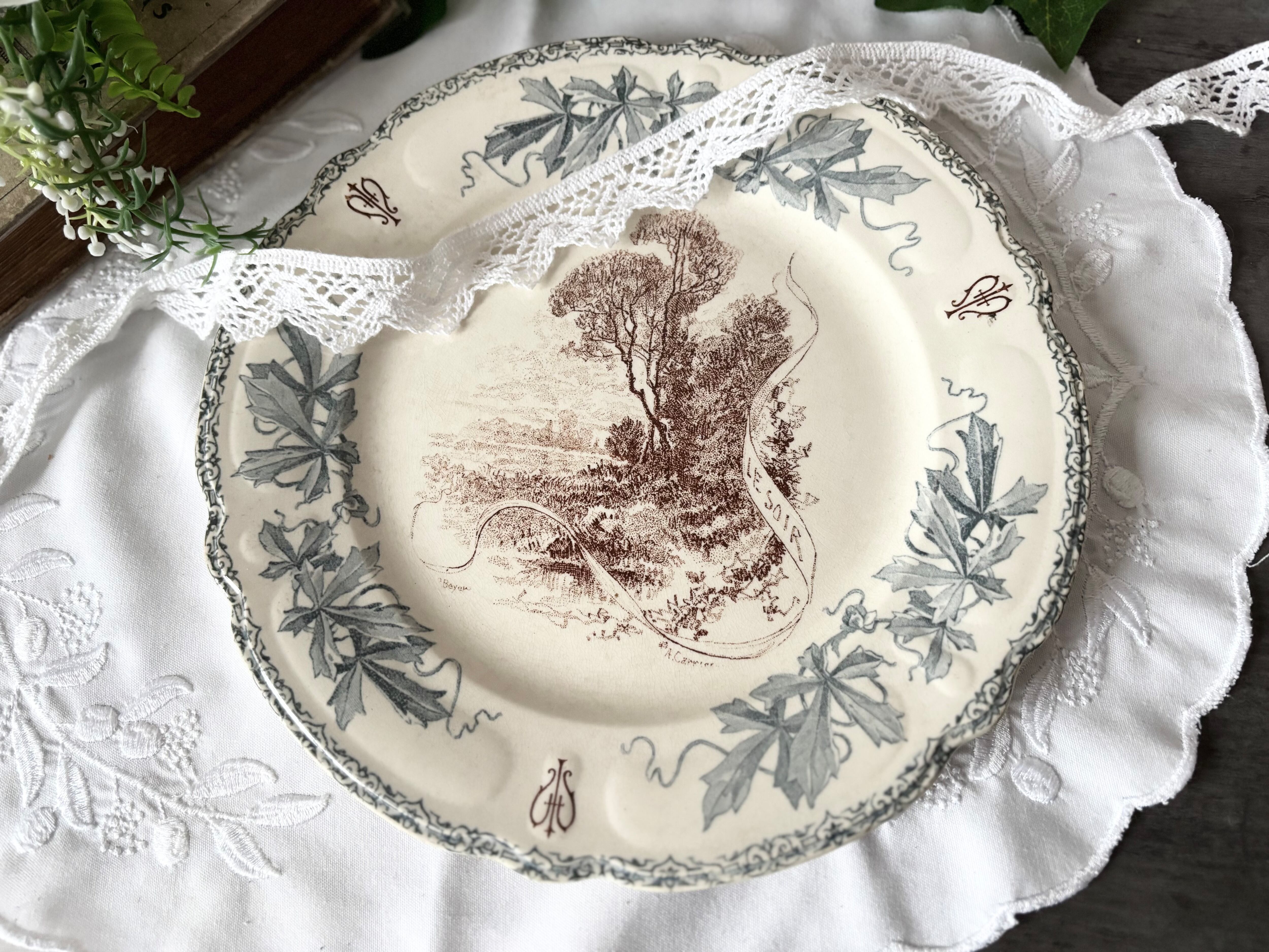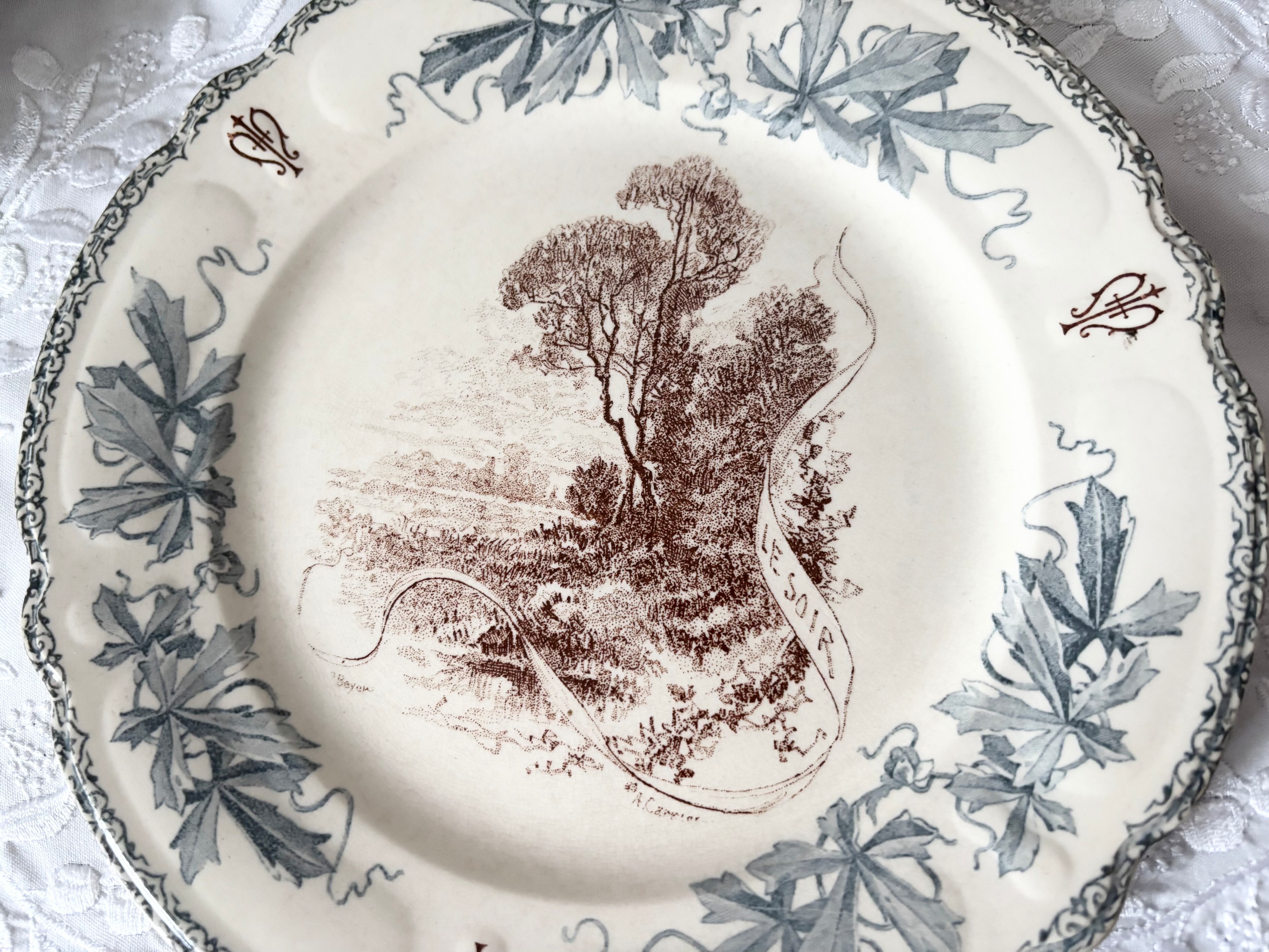 ブドウの葉や蔦模様のガーランドの奥に、銅版画風のトランスファープリントで描かれた、夕刻の森の水辺。遥か遠くに建物がぼんやりと見えるこの場所は、静かで、リボンの様に緩やかな時が流れています。