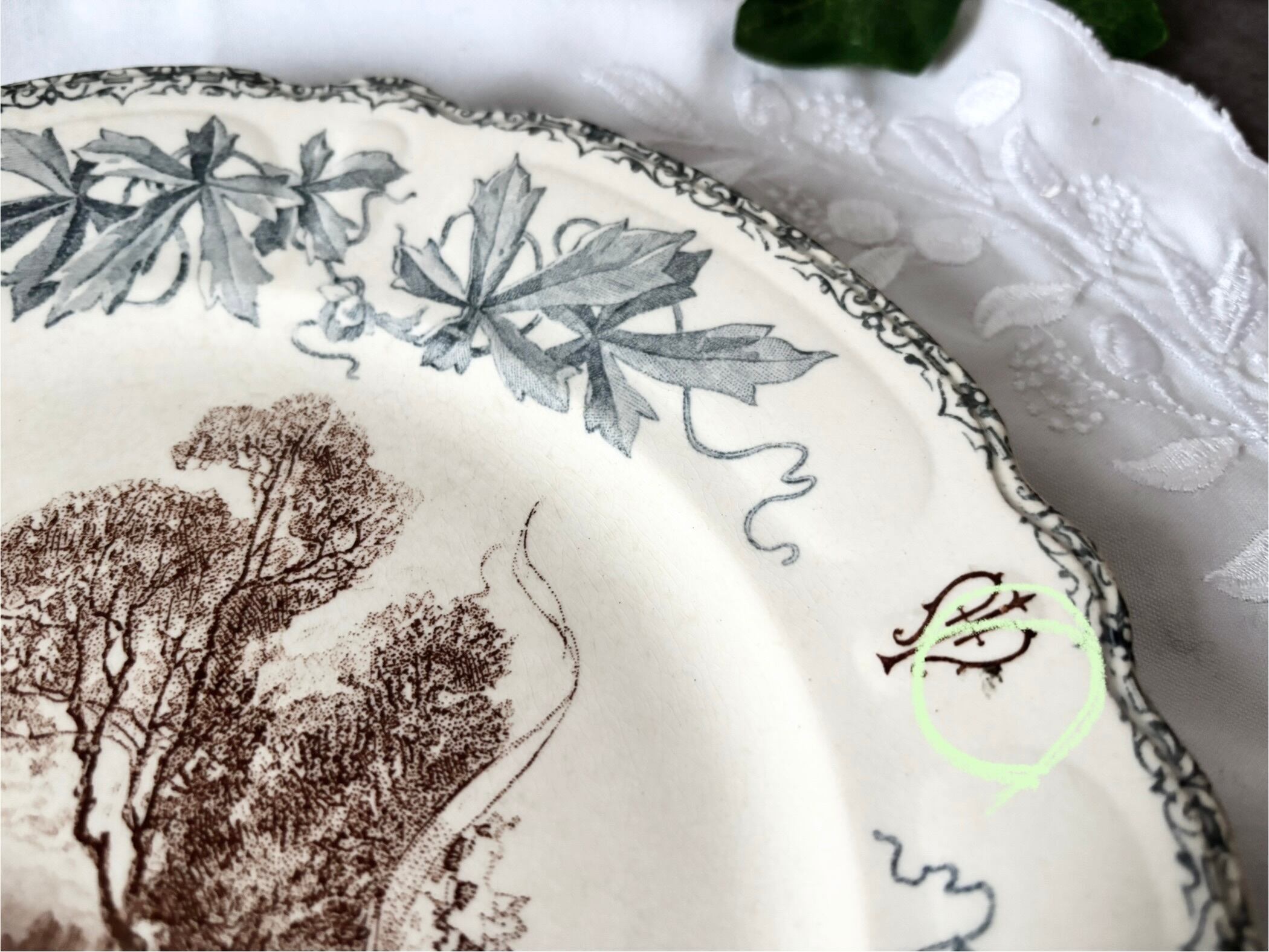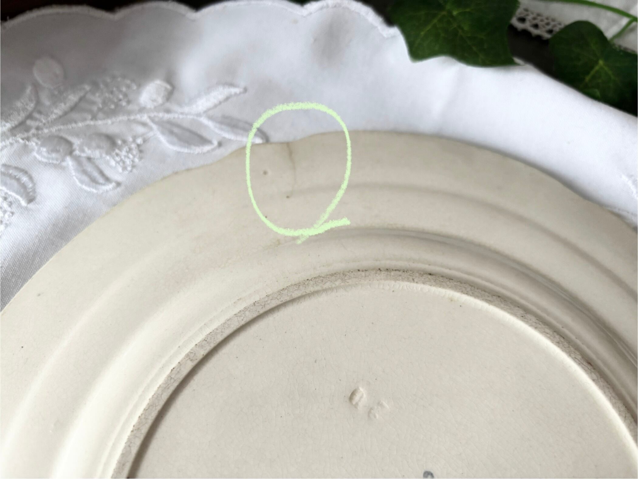 アイテムのコンディションとして、お皿全体にクレイジングが美しく広がり、経年劣化の色褪せと、まだら状の薄いシミが広がっています。カトラリー跡と、縁のエンブレムの一つに小さな黒っぽい傷がございます。横から見ると、変色を伴った小傷がいくつかリムにございます。裏のリムに一箇所ヒビがあり、これは表面のリムの彫刻まで貫通しています。裏側のエッジに、灰色や薄茶の変色が見られ、わずかなシミもございます。絵柄と刻印に掠れ、途切れ、もございますが、艶やかで、アンティーク感たっぷりの良い状態のお品物です。