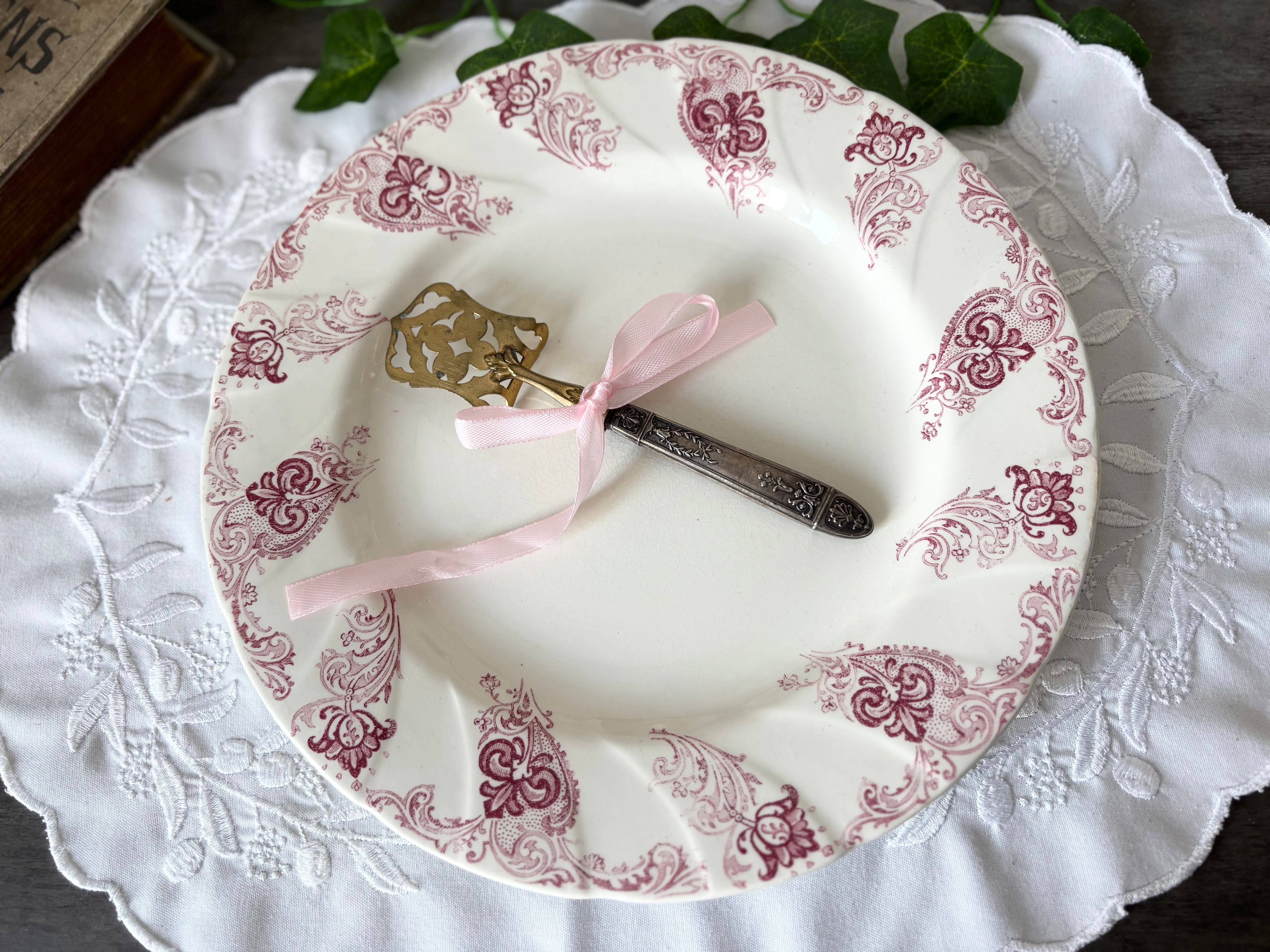 流れる様な彫刻を施されたリムに、転写式印刷で、ロココ調のガーランドがキラキラと輝く、エレガントな逸品。
