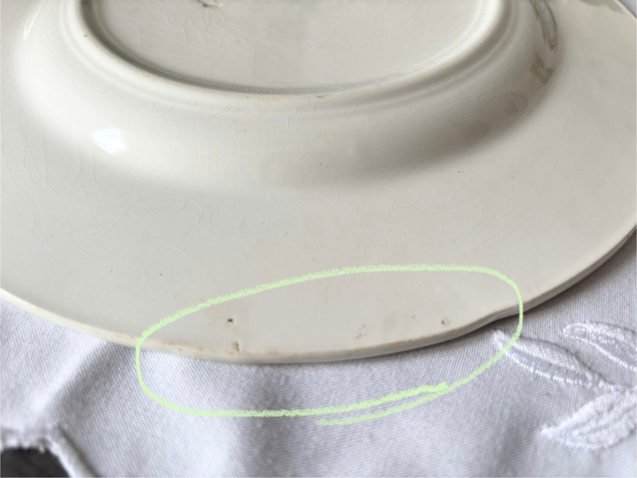 アイテムのコンディションとして、お皿の表面に美しくクレイジングが広がり、カトラリー跡と、裏側にも貫入がございます。横から見ると僅かな突起や極小さな小傷、制作時にできた突起状の傷がございます。裏側のリムに小さな傷と突起がございます。この様に、極小さな色飛びとシミ、絵柄と刻印の掠れはございますが、大変艶やかで、アンティークとして、非常に良い状態のお品といえます。