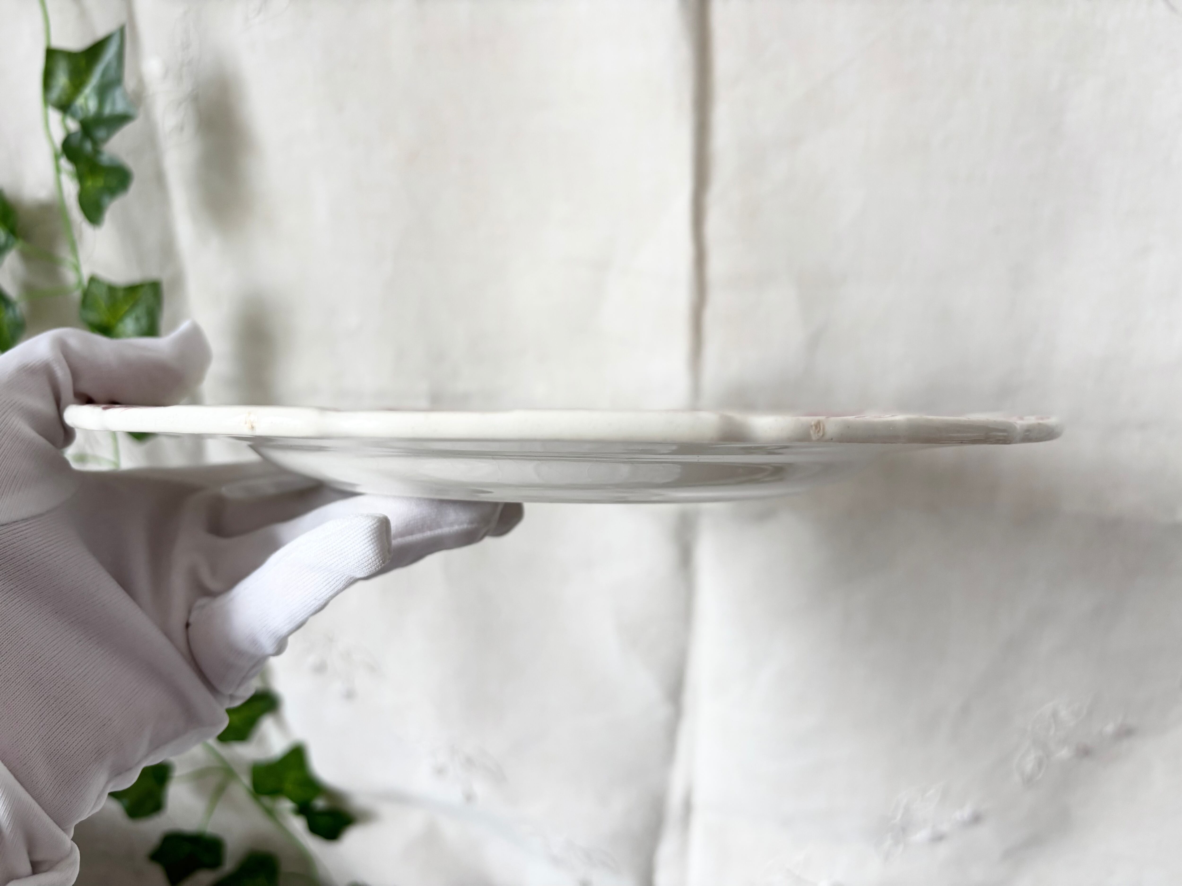 アイテムのコンディションとして、お皿の表面に美しくクレイジングが広がり、その一部が僅かに変色しています。カトラリー跡と、裏側にも貫入がございます。横から見ると僅かな突起や極小さな小傷、制作時にできた突起状の傷がございます。裏側に制作時に出来たと思われる、エナメルのライン状の突起や窪みと小さなシミが縁に数カ所ございます。この様に、極小さな色飛びとシミ、絵柄と刻印の掠れはございますが、大変艶やかで、アンティークとして、非常に良い状態のお品といえます。