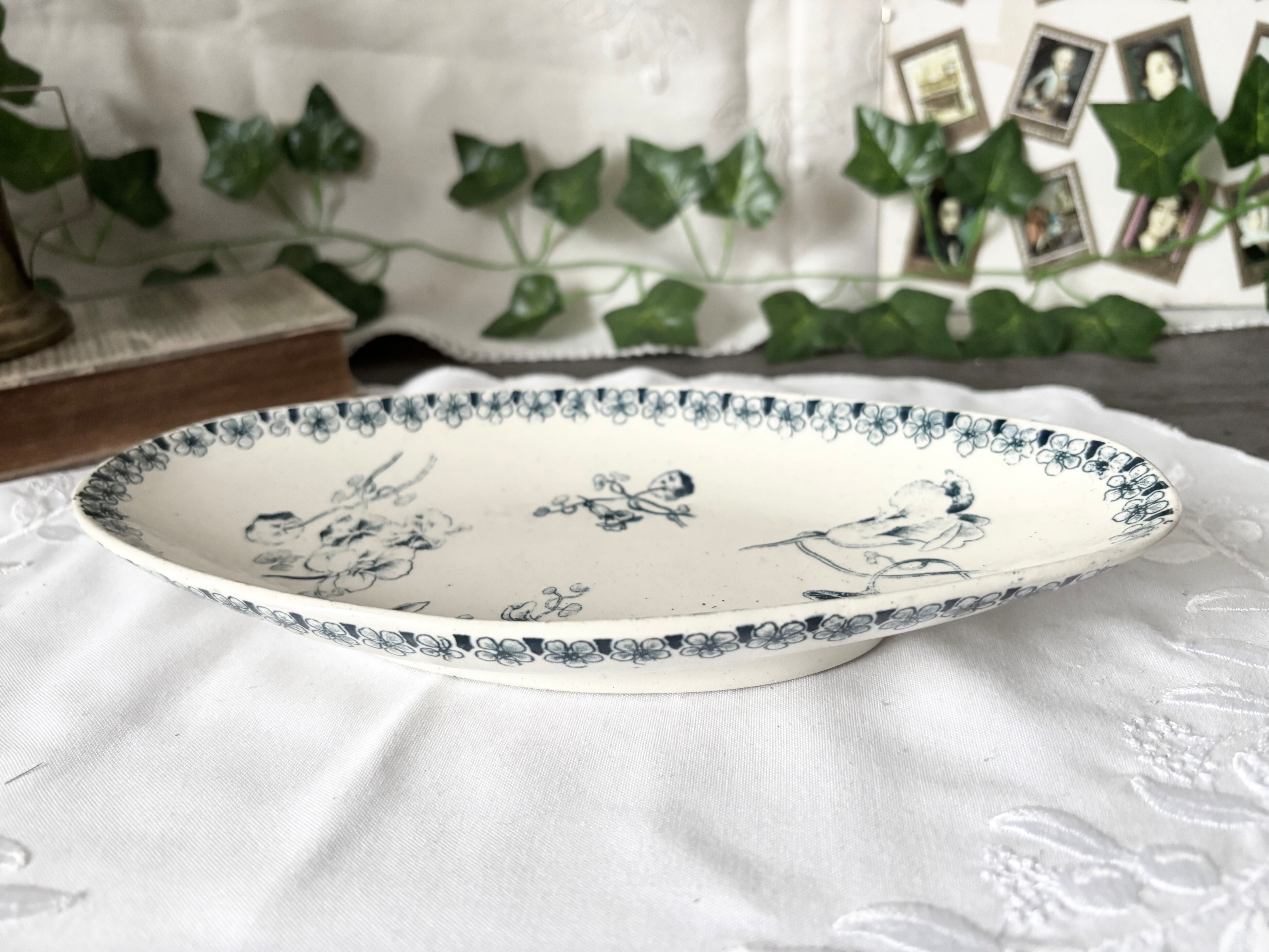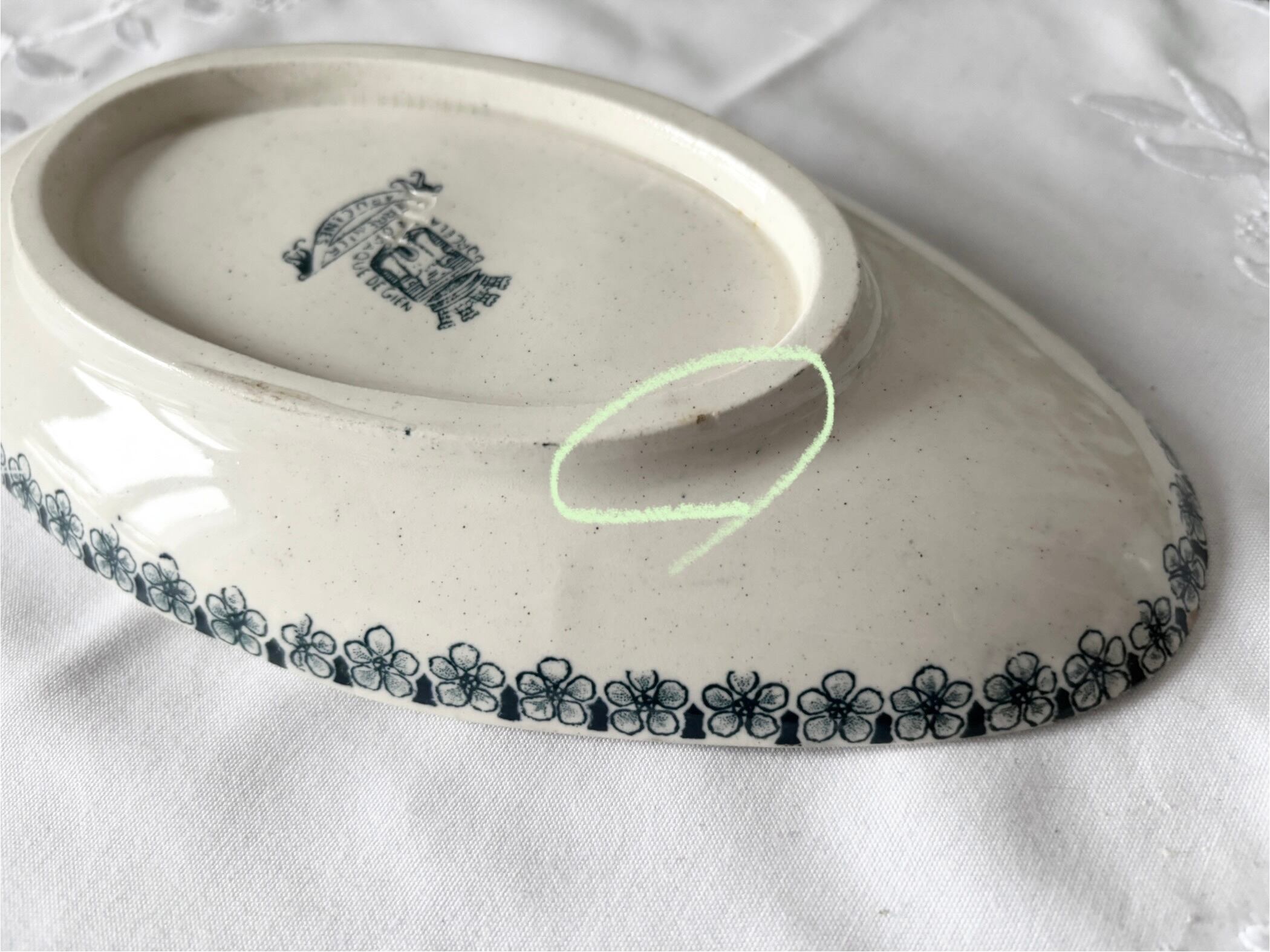 アイテムのコンディションとして、極僅かなカトラリー跡と、鉄粉の様な点々が広がり、温かみを感じる風合いがあります。器を横から見ると、端に一箇所小さなかけがございます。足の裏に小傷と、エナメルの不均一で若干ライン状に盛り上がった部分がございます。絵柄と刻印に掠れがございますが、大変艶やかで、アンティークとして、良い状態のお品です。