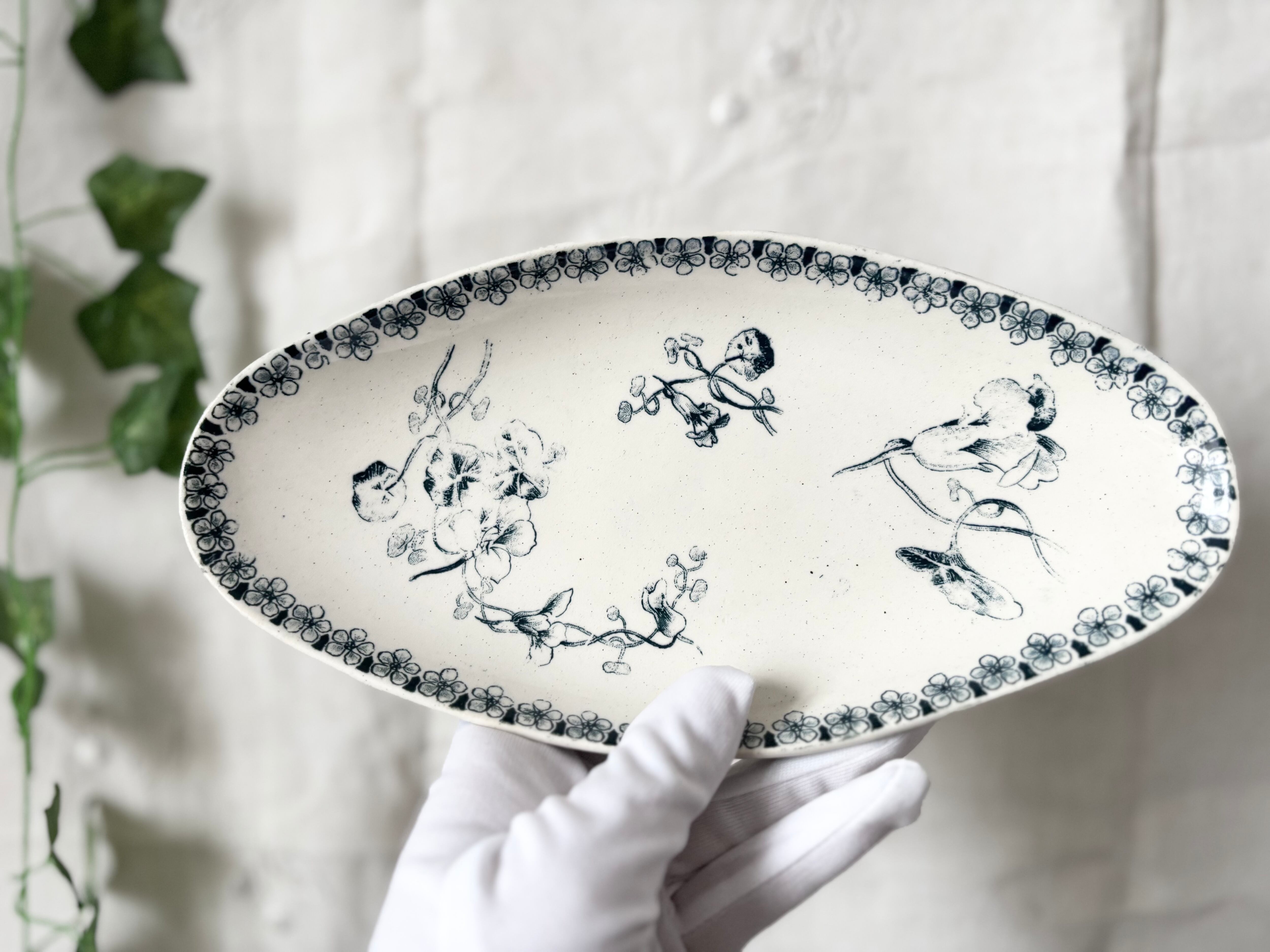 艶やかなテールドフェールの表面に、青いキンレンカの模様が濃く、淡く、踊る様に描かれています。