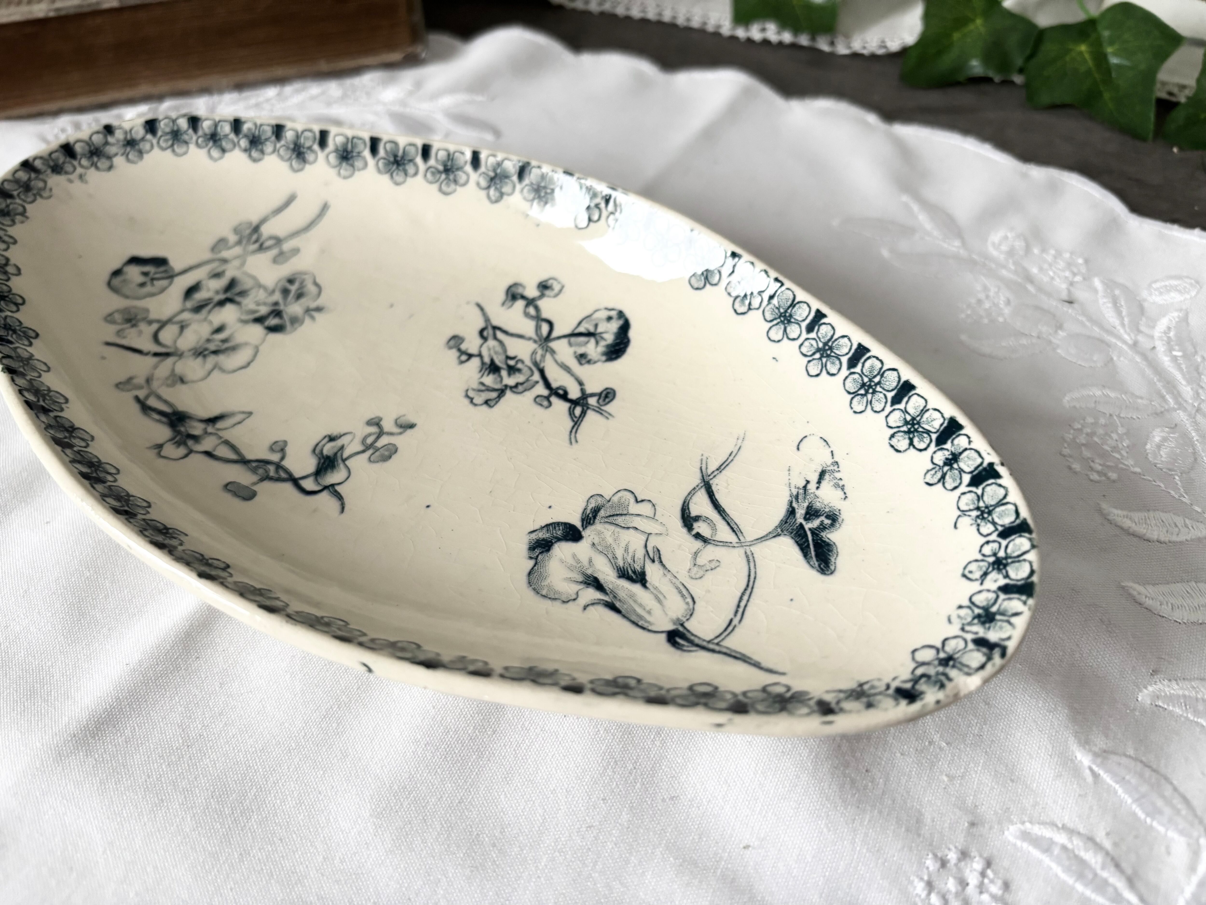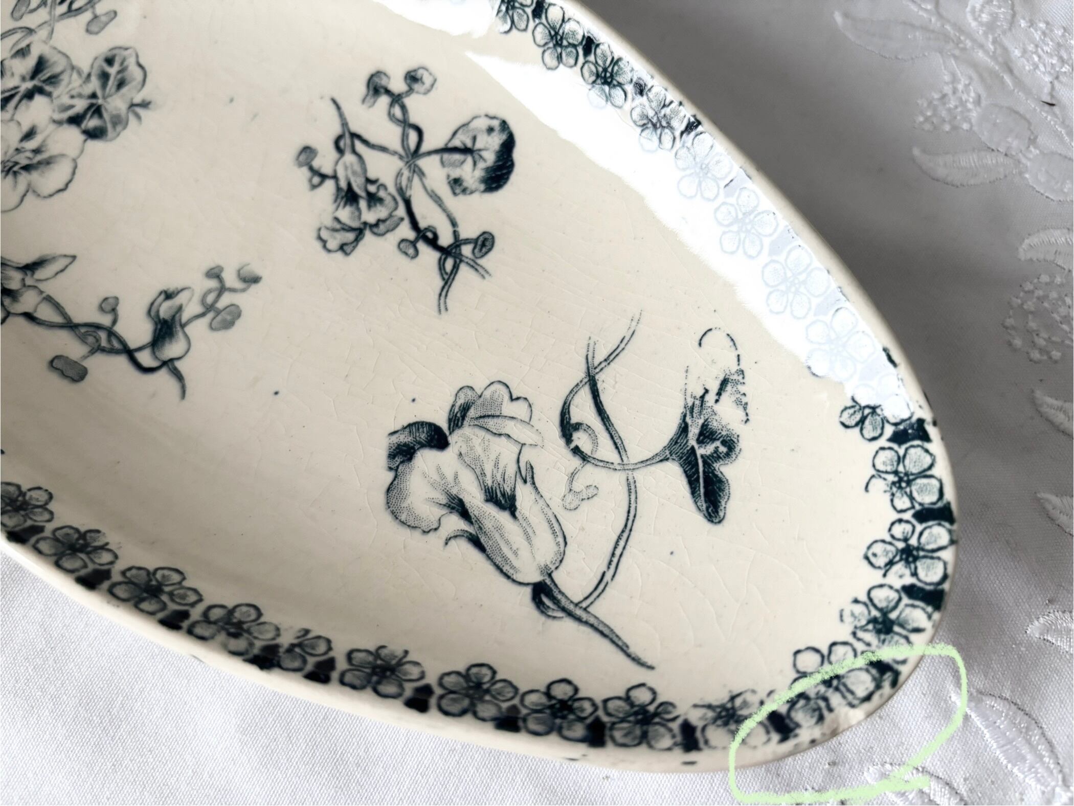 アイテムのコンディションとして、経年劣化の色褪せが全体に広がり、貫入があります。器の縁に一箇所かけがあり、所々にざらつきがございます。僅かなカトラリー跡と色飛びも確認できます。裏側の足に一箇所かけがございます。絵柄と刻印に掠れがございますが、大変艶やかで、アンティークとして、良い状態のお品です。
