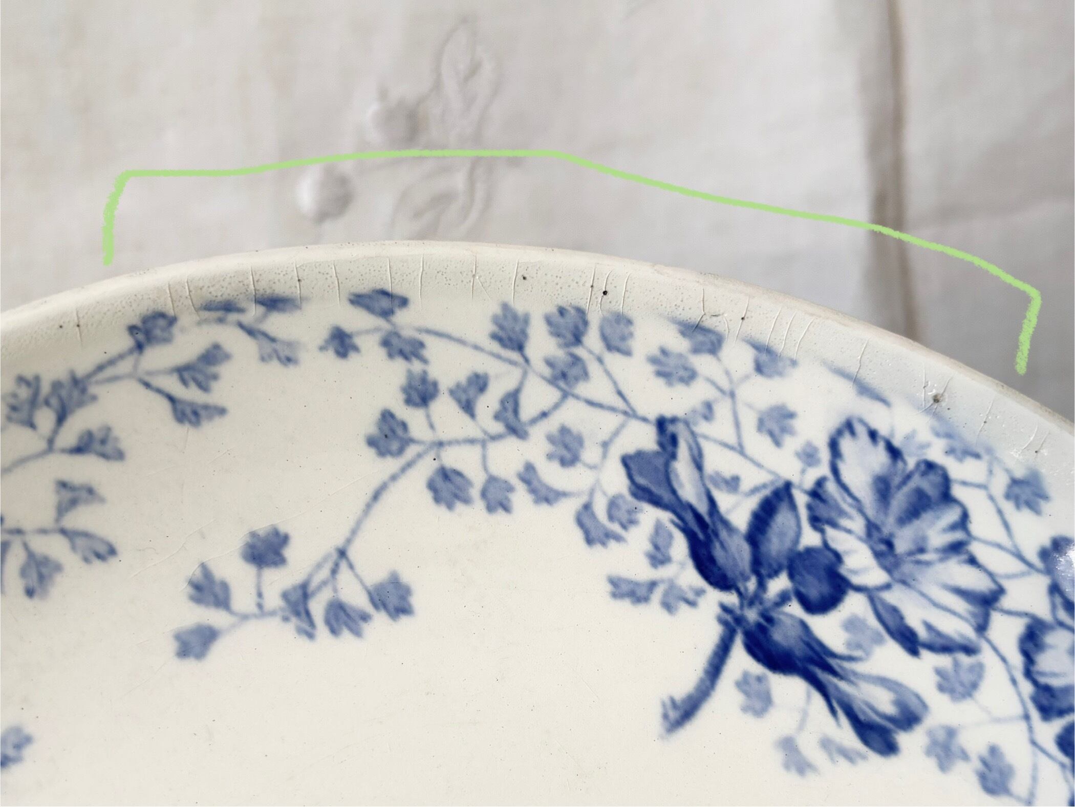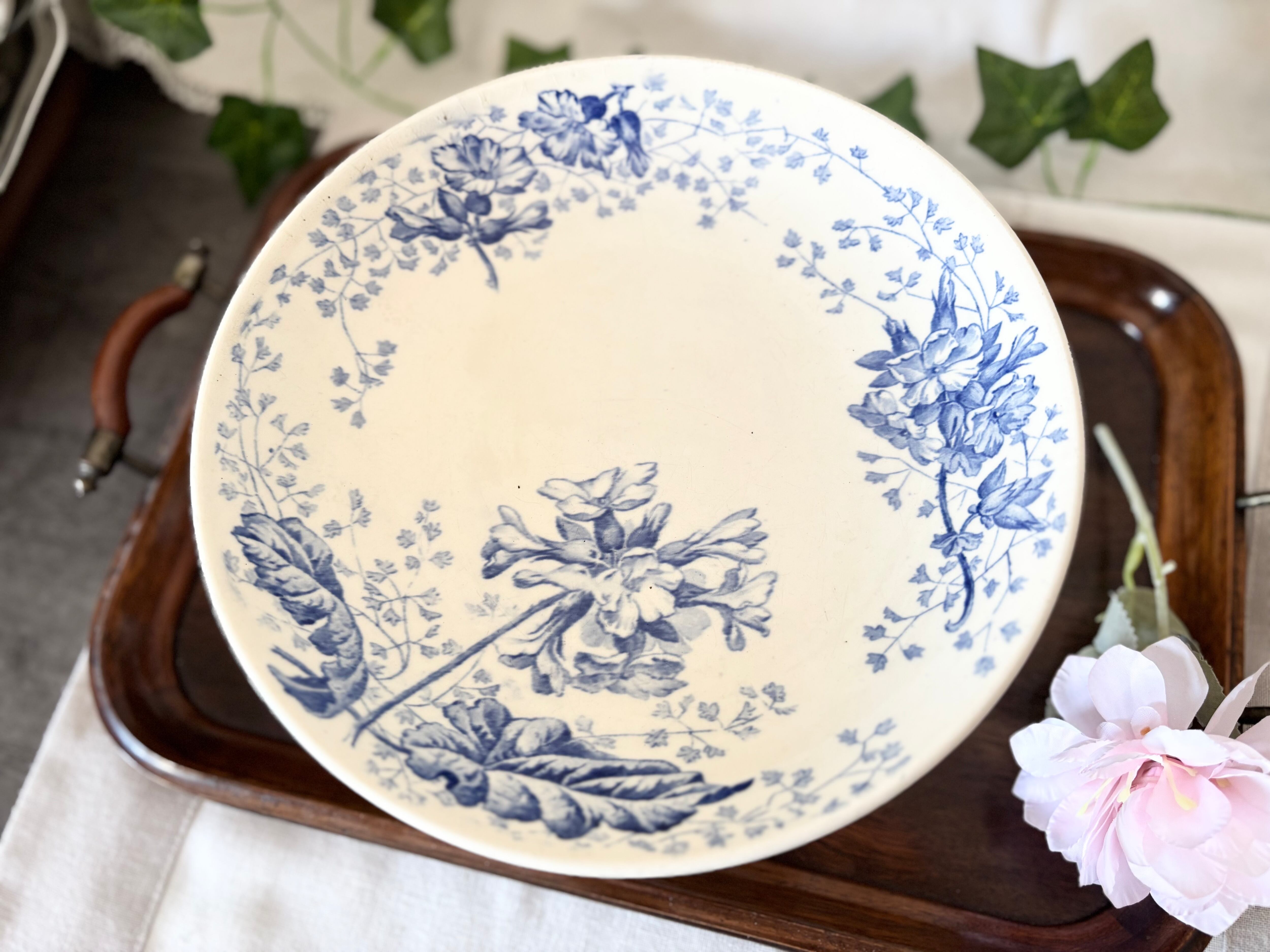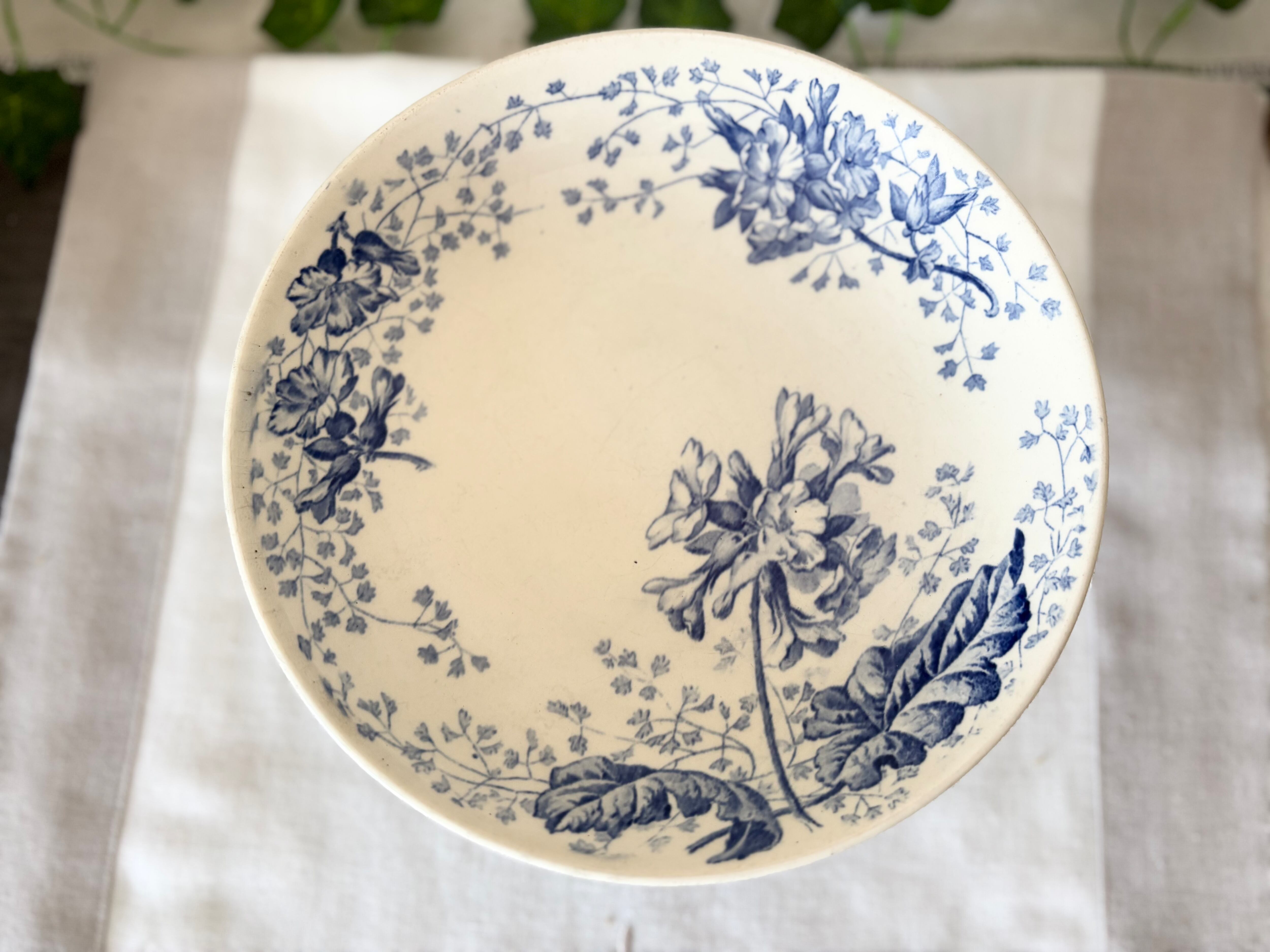 ブルーのトランスファープリント(転写技法)で施されたデザインは、19世紀後半のフランスの陶器らしいエレガンスを感じさせます。