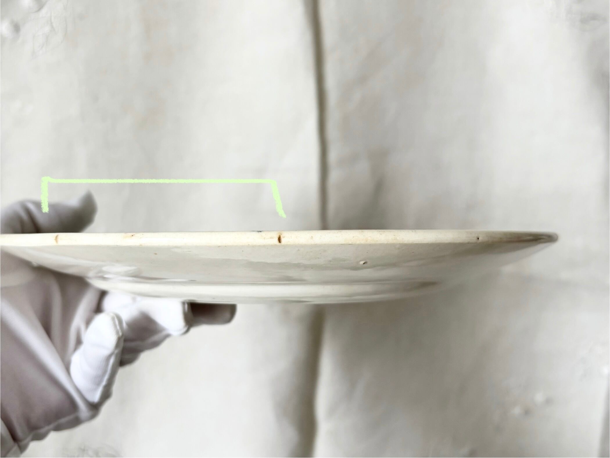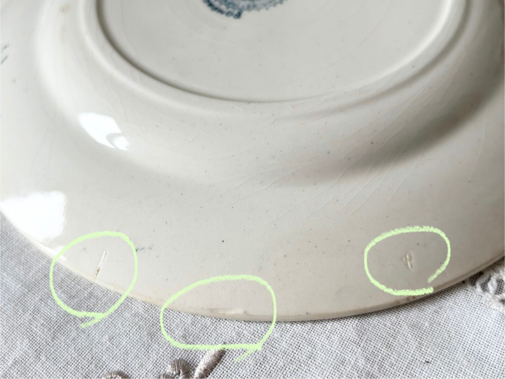 アイテムのコンディションとして、軽いカトラリー跡と、お皿全体に貫入があります。リムがエナメルの不均一により、多少波打っている部分があります。横から見ると変色した小傷がいくつかございます。裏側にはリムに小傷がいくつかと、ブラウンのシミがあり、色飛びが多くございます。絵柄に掠れや滲み、色飛びもあります。刻印がかなり滲んで掠れていますが、艶やかで、アンティークとして良い状態のお品といえます。