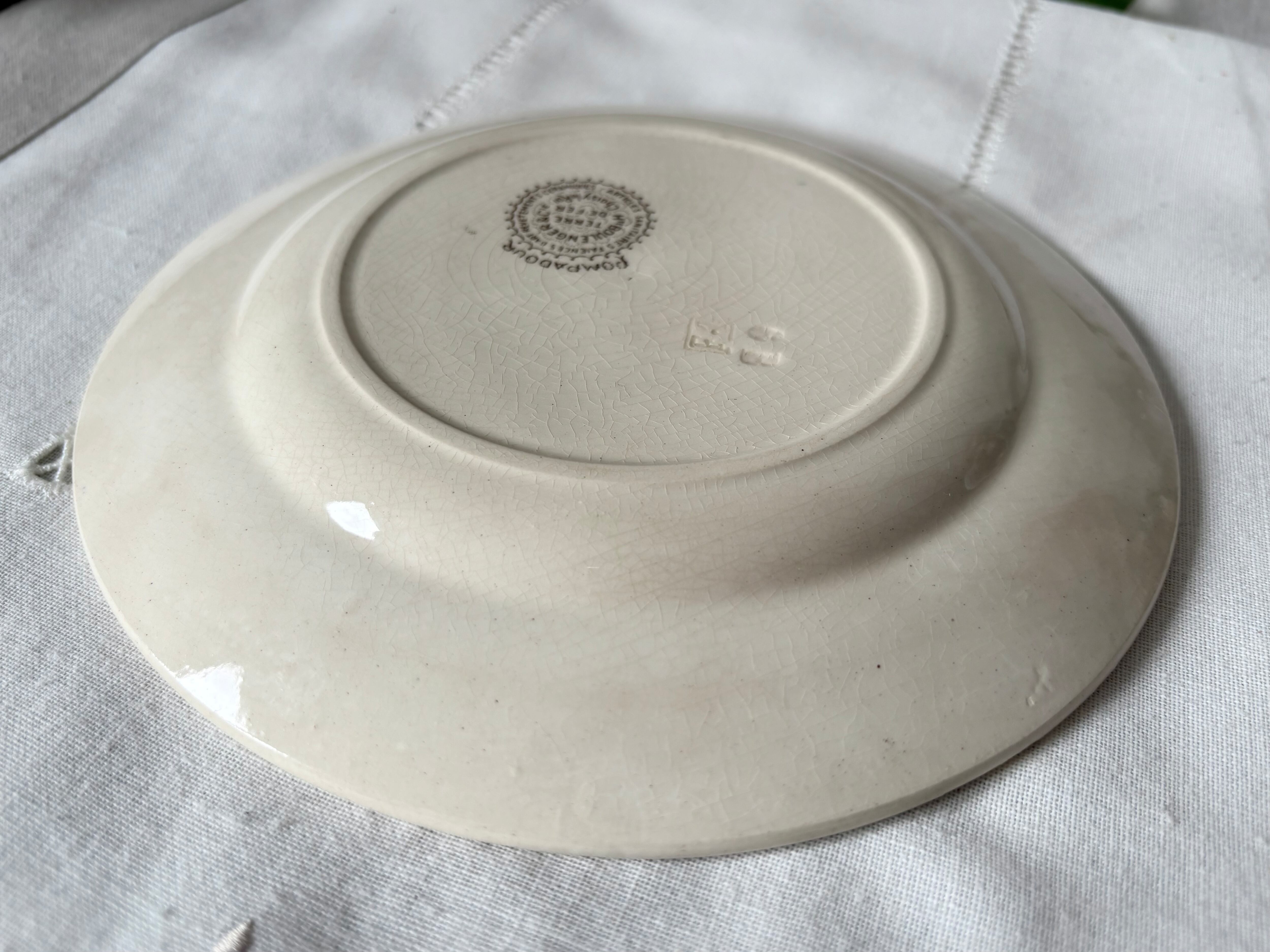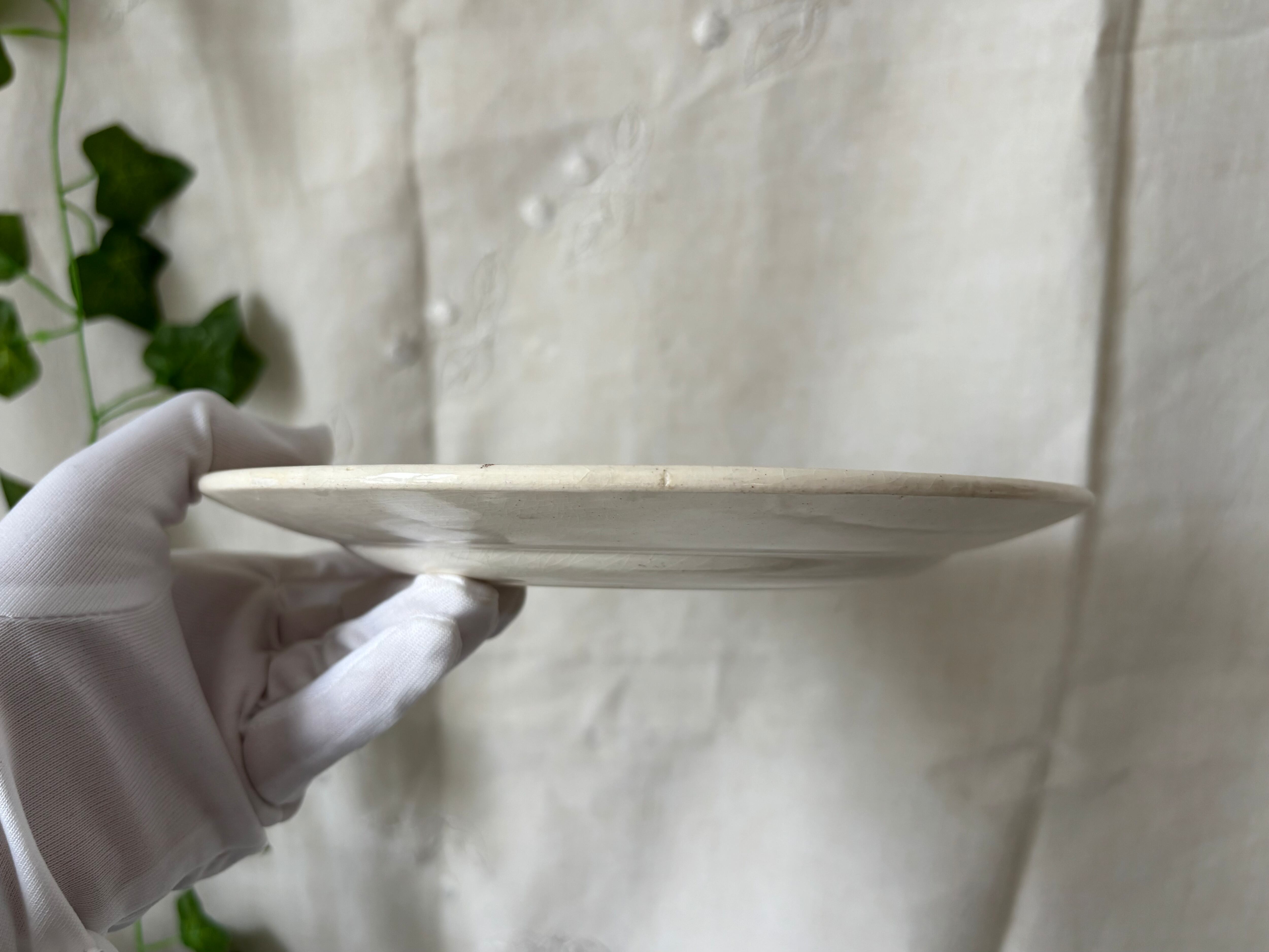 お皿全体にクレイジングが広がり、その一部が薄く変色しています。表面にカトラリー跡と縁を中心に、エナメルの不均一により、若干の高低差がございます。横から見ると、リムに小さな欠け、膨らみ、小傷がございます。裏側には制作時にできたと思われる膨らみや凹みがございます。絵柄、刻印共にわずかな掠れはございますが、くっきりとしていて、艶やかで、アンティークとして良い状態といえます。