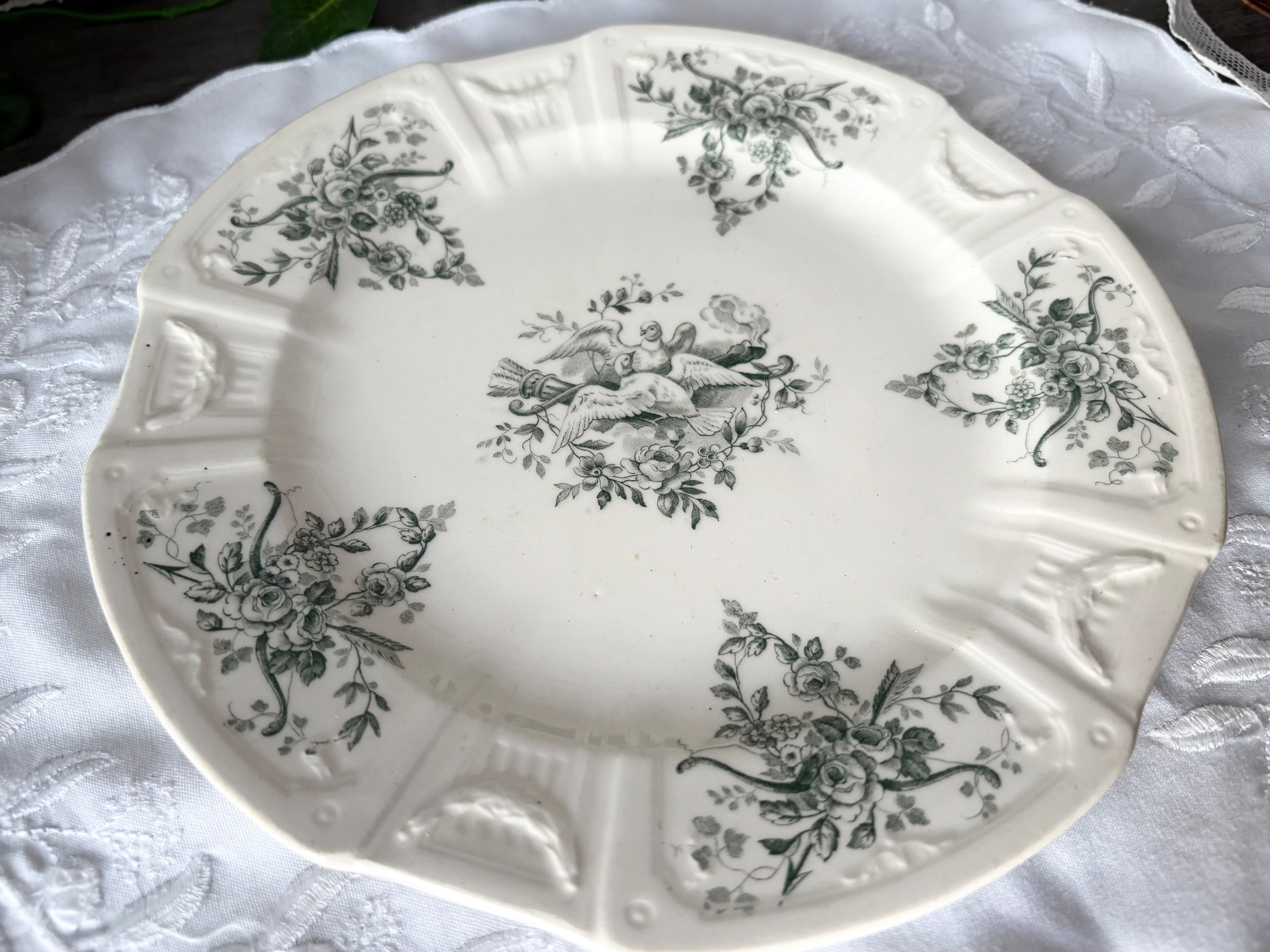 19世紀のGIENより、鳩の番がモチーフの、グリーンのアンティークプレートをご紹介いたします。