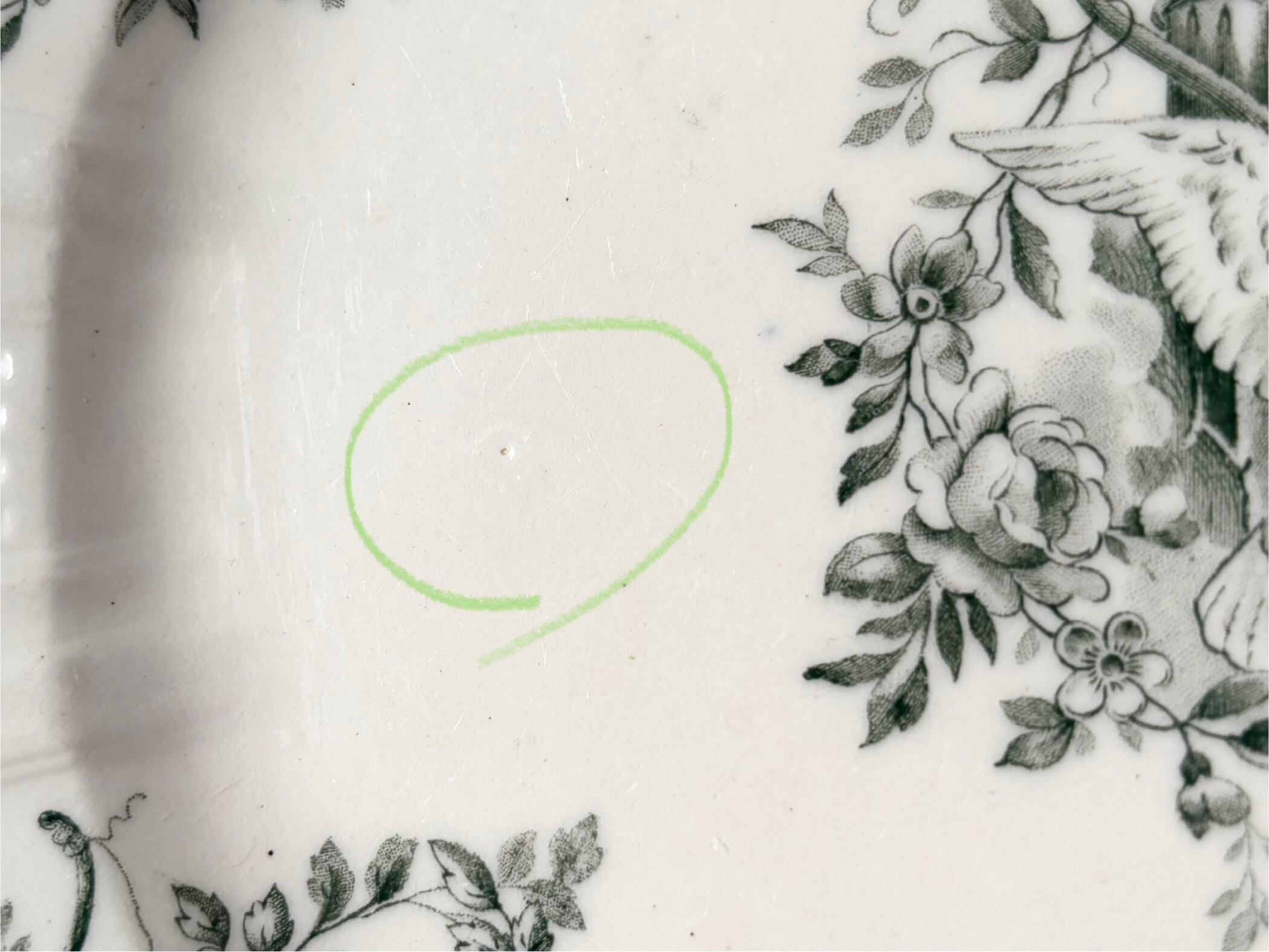 アイテムのコンディションとして、お皿の底にカトラリー跡があり、僅かに気泡の様な小さな穴があり、リムに黒っぽく変色した小傷と僅かな変色がいくつかございます。横から見ると制作時にできたと思われる小傷と、変色した傷がございます。裏側のリムに制作時にできたと思われる小傷が並んで見られ、リムと膨らみの境に短いライン状の傷がございます。裏側のお皿の底にY字、I字状の貫入がございます。GIEN の刻印とTerre de fer の押印がございます。絵柄や刻印に掠れも少なく、年代を重ねたアンティークとして、大変艶やかで、良い状態のお品です。
