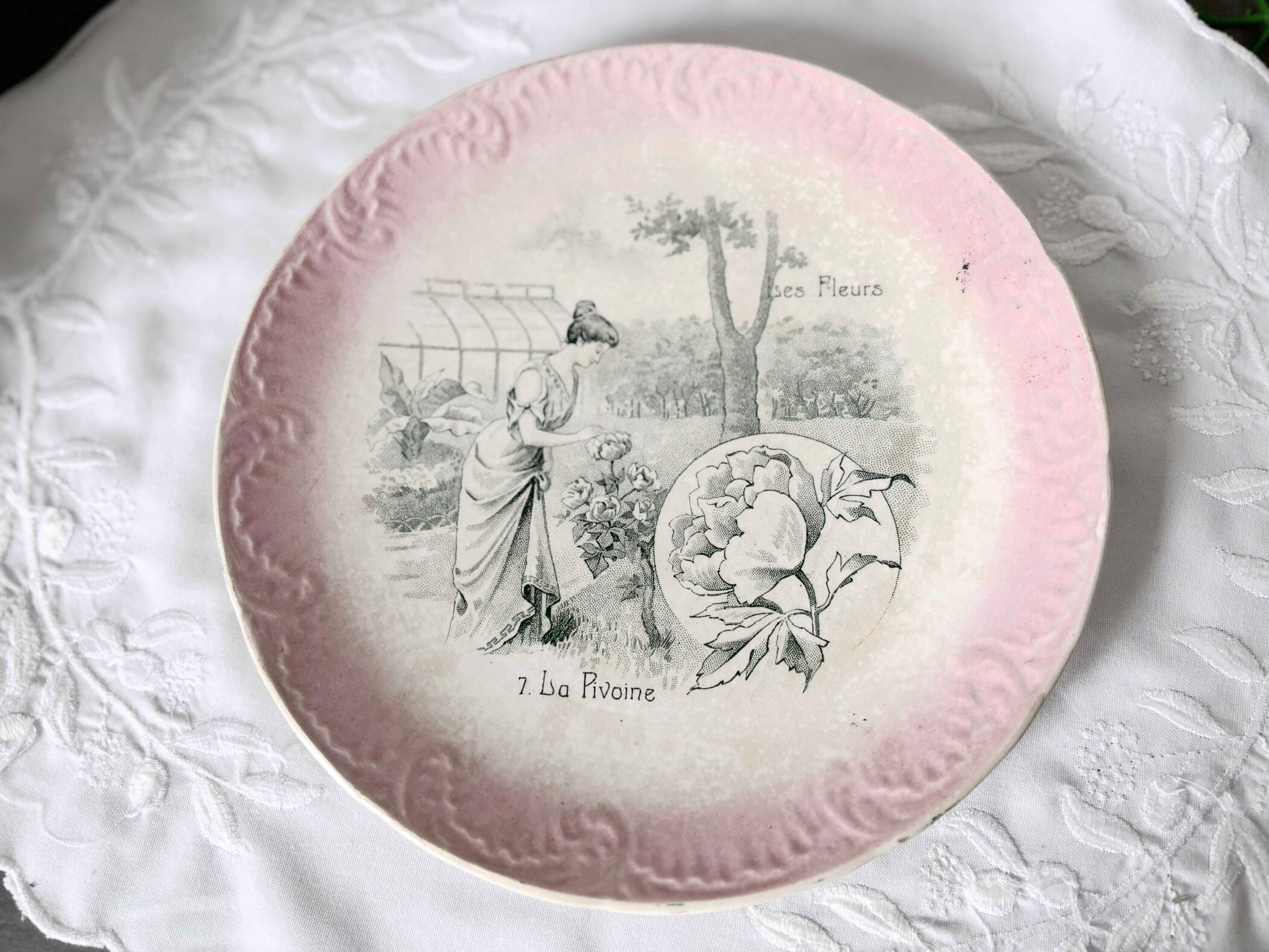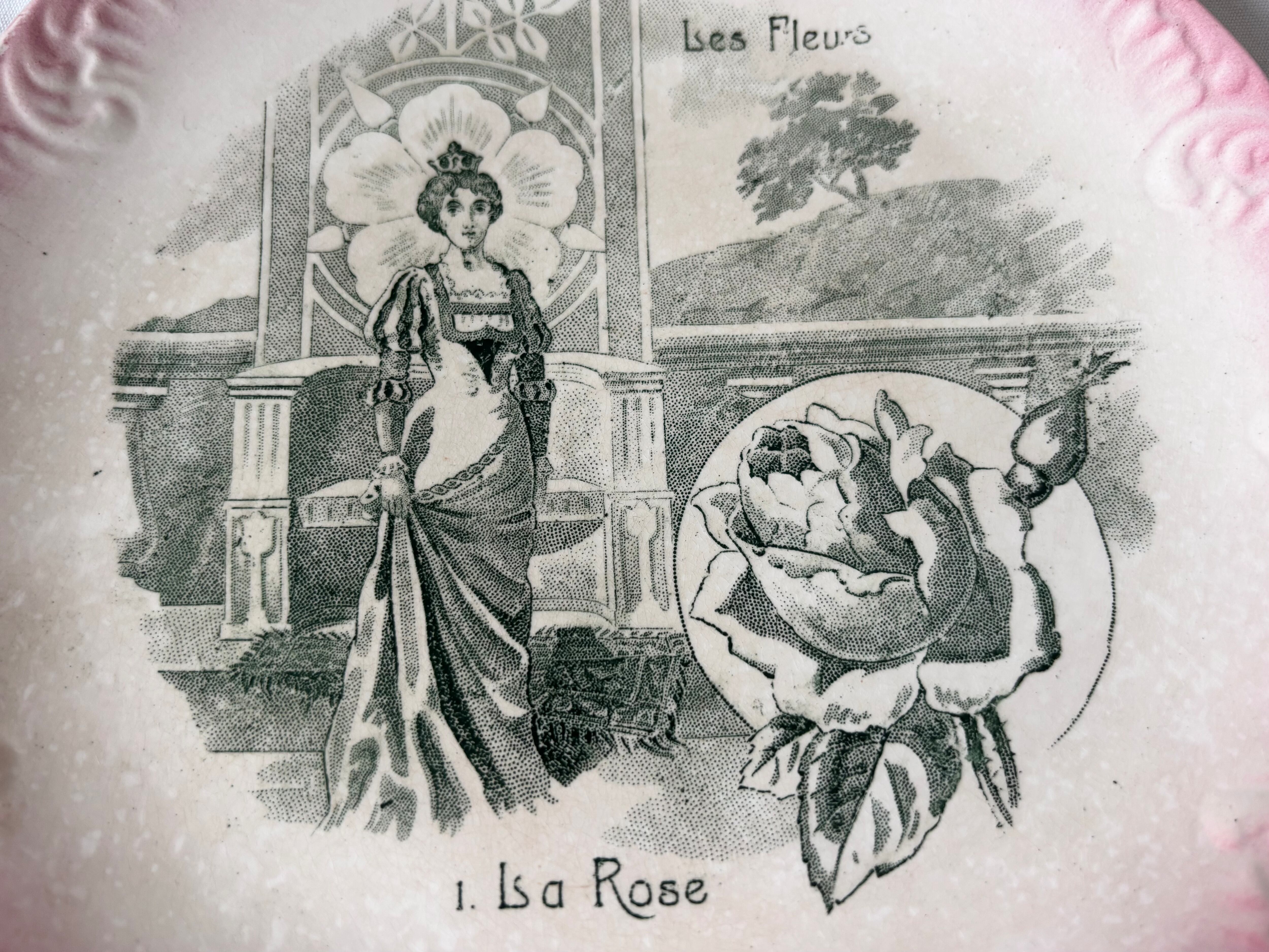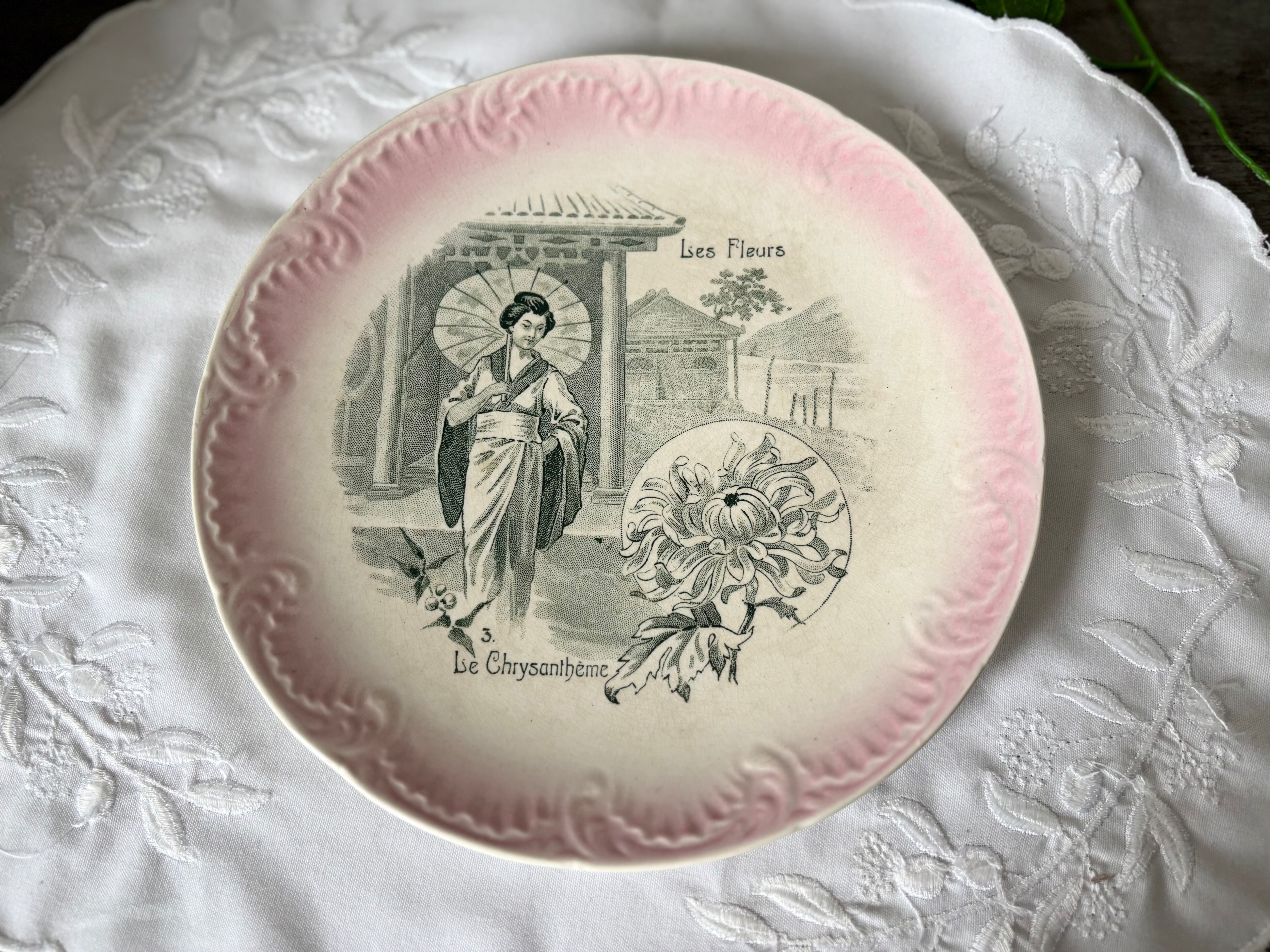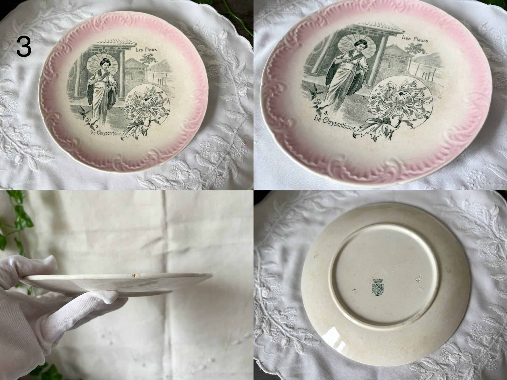 Set of 6 DIGOIN Sarreguemines / dessert plates / Les fleurs / pink / Barbotines / Antique / Vintage / 絵皿 / ディゴワン / サルグミンヌ / フランス / アンティーク