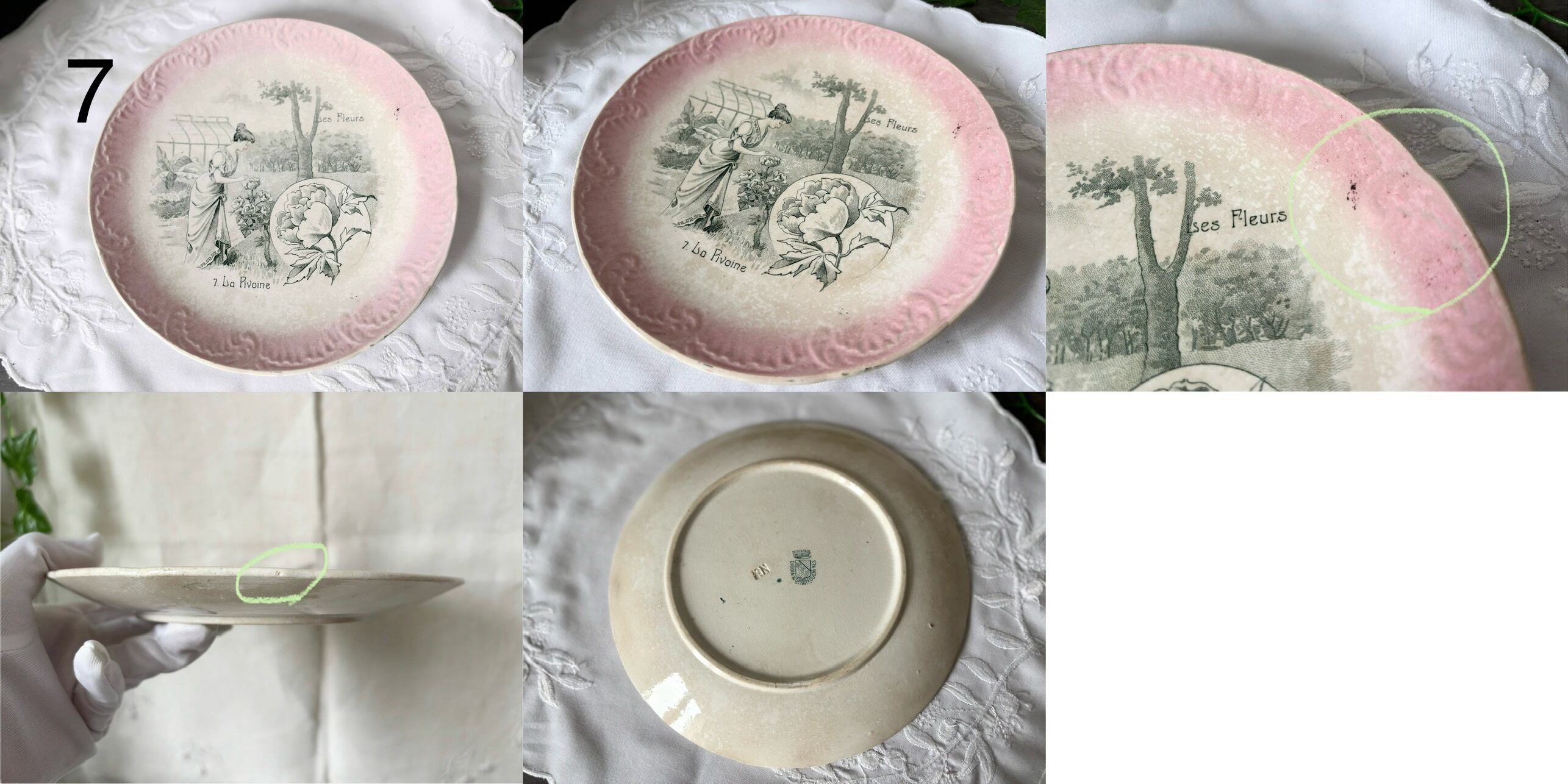 お皿全体に経年劣化の色褪せとクレイジングが広がり、リムの端にピンクの釉薬のムラと、一箇所顕著な欠けと、小さな欠けがあり、ピンクのお色味が濃いめです。
