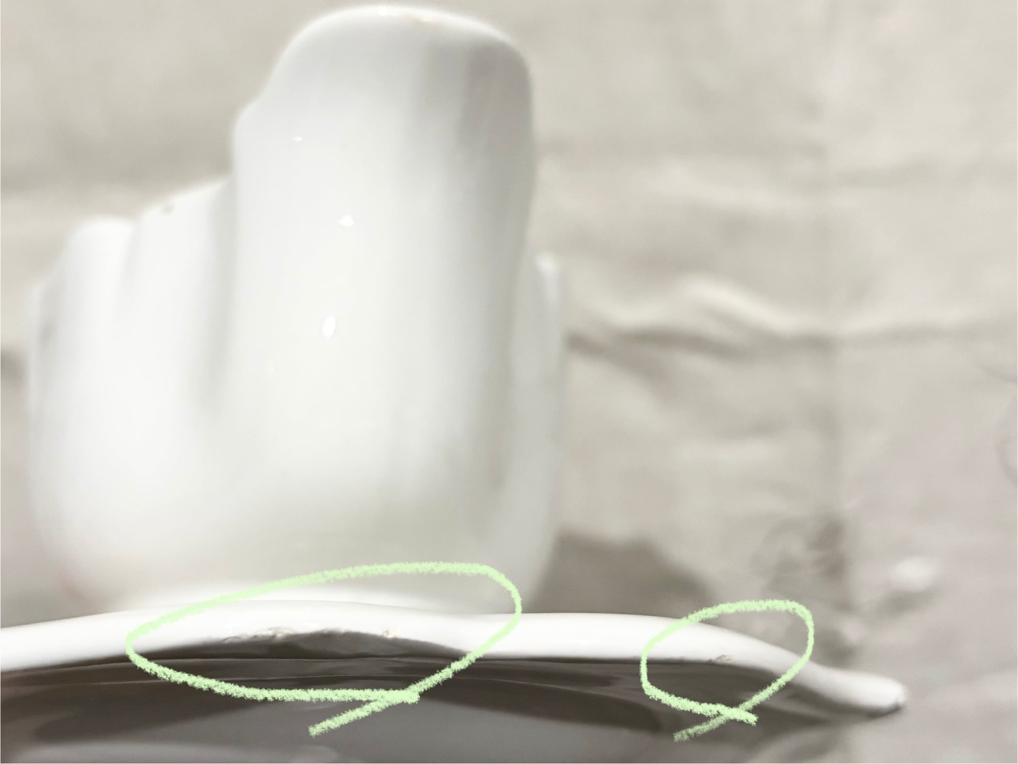 アイテムのコンディションとして、器の内側、縁の近くにぼんやりとしたシミを伴った小傷がございます。また、外側の縁の付近に傷の様に見える変色がございます。受け皿の縁に小傷がいくつかあり、一箇所裏側に顕著な欠けがございます。足の裏に変色とざらつきがございます。刻印が多少滲んではいますが、大変艶やかで、アンティークのお品として、良い状態といえます。