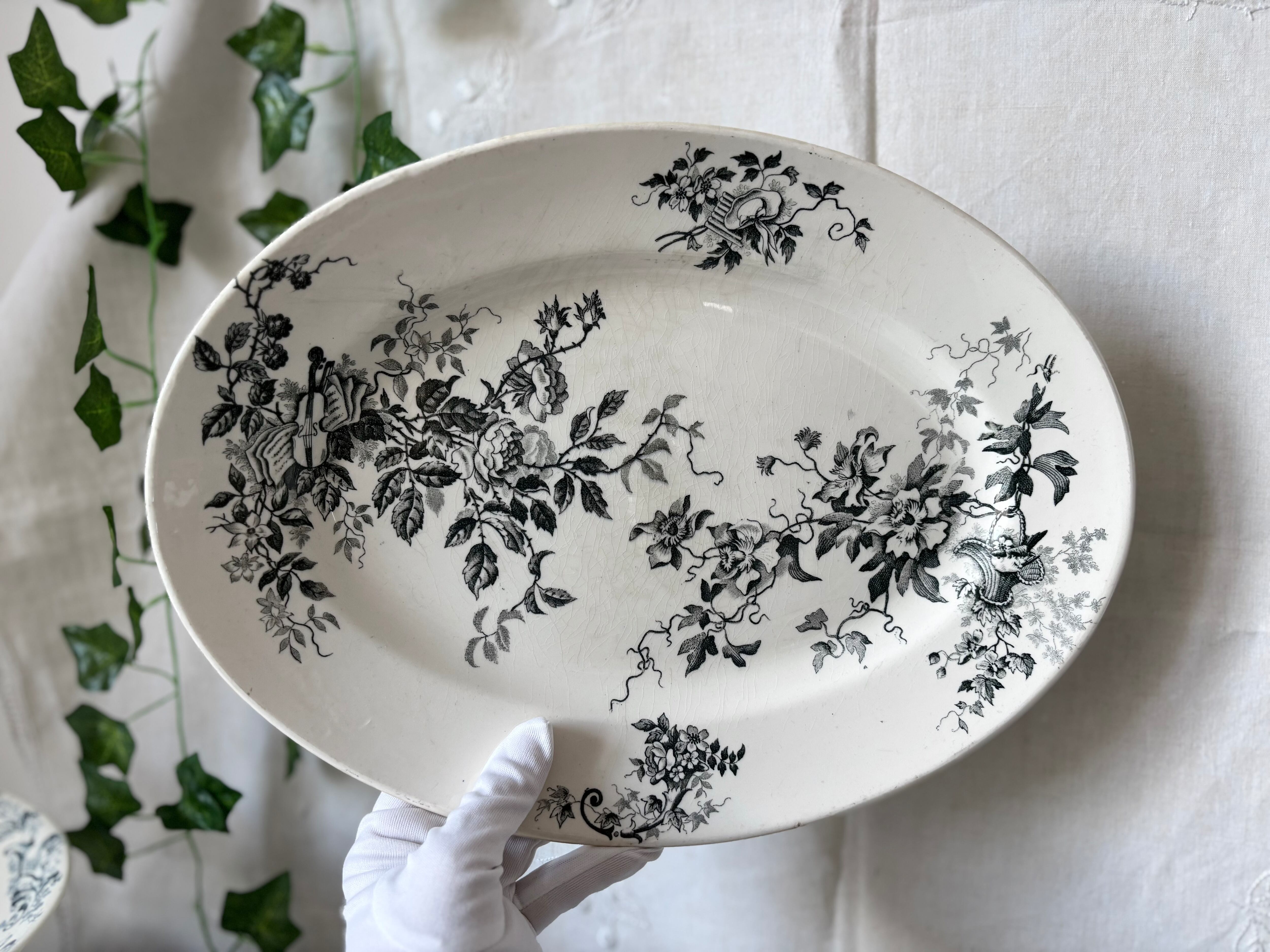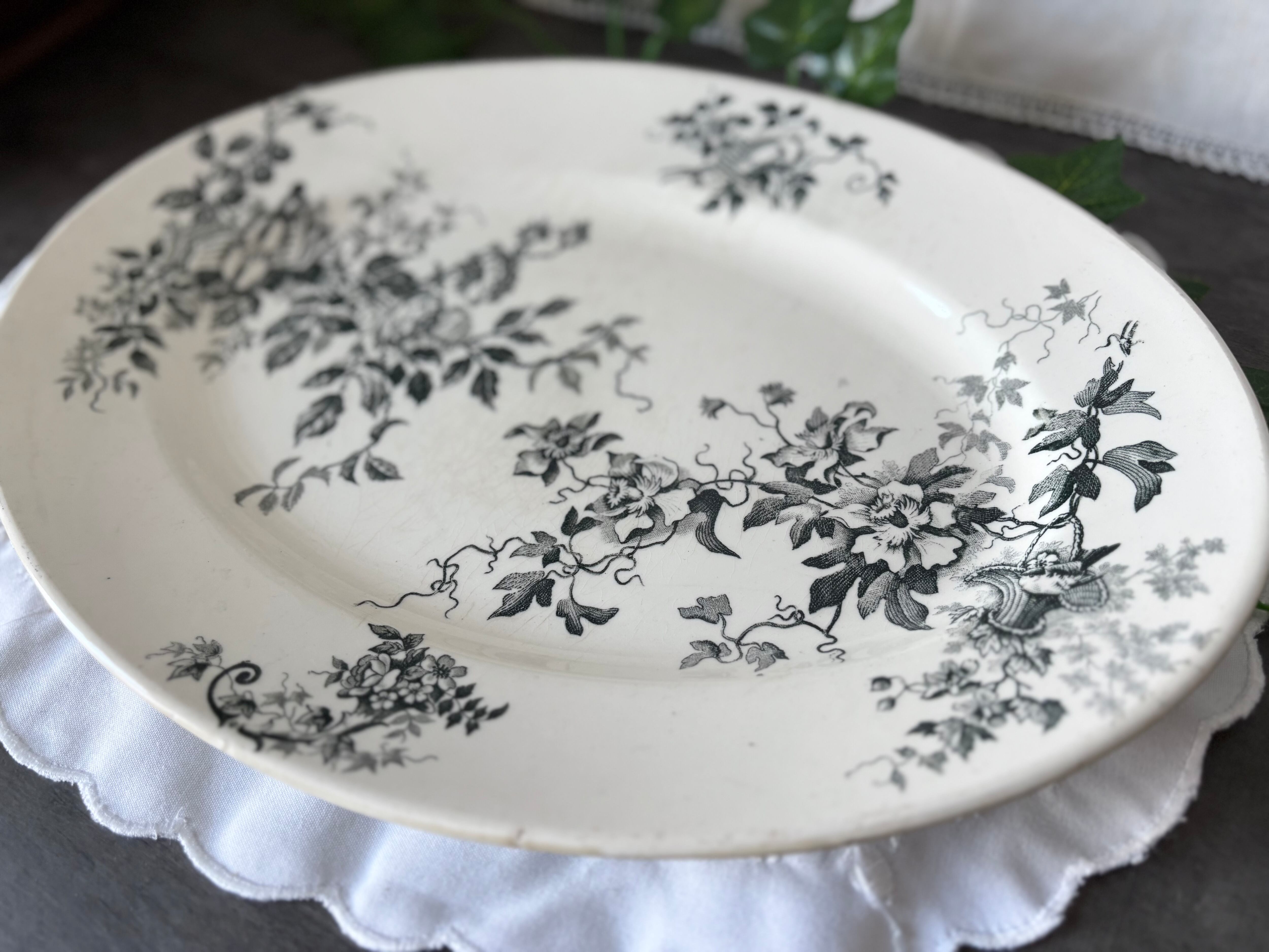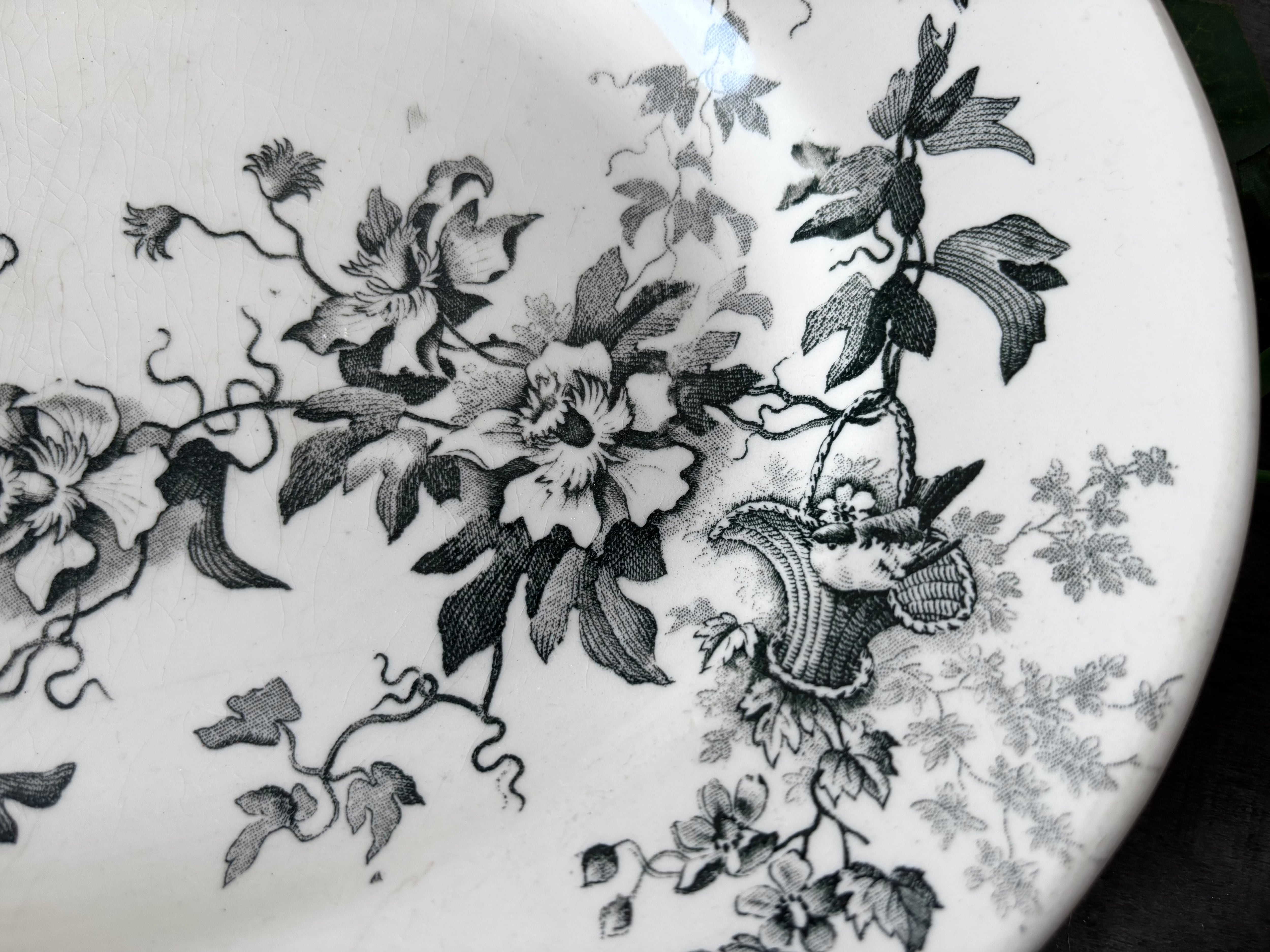 美しいグリーンがかったグレーのトランスファープリント(転写模様)が、薔薇や小花、リボンやバスケットモチーフを織りなす優美なデザイン。アンティーク特有の貫入(Craquelure)が現れ、年月を経た味わいをたたえています。