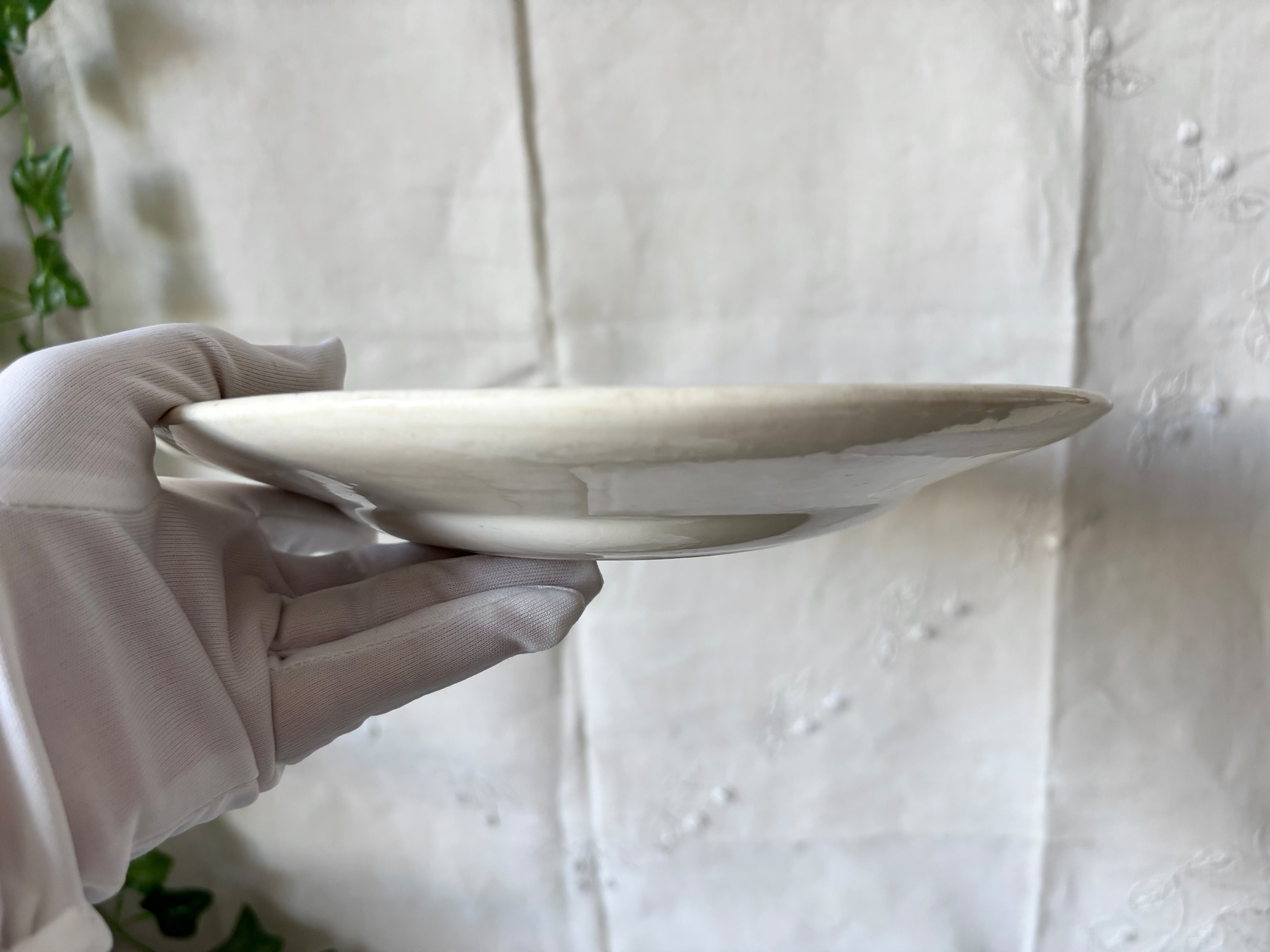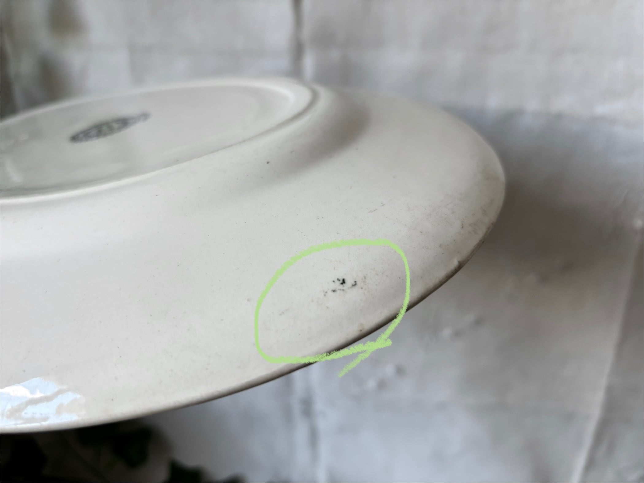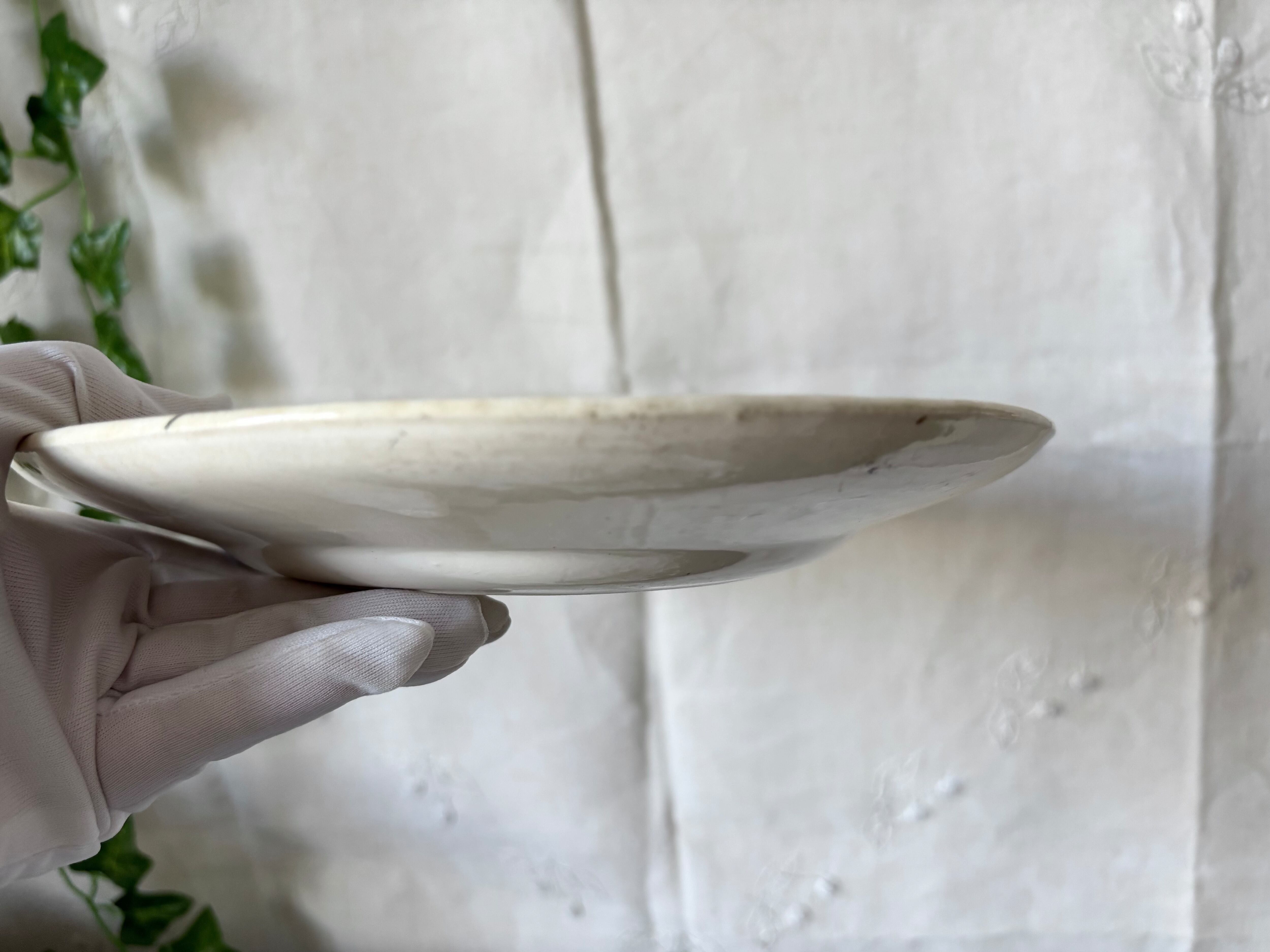 アイテムのコンディションとして、プレートの中央部分を中心に貫入があり、その一部が変色しています。軽いカトラリー跡と小傷がございます。