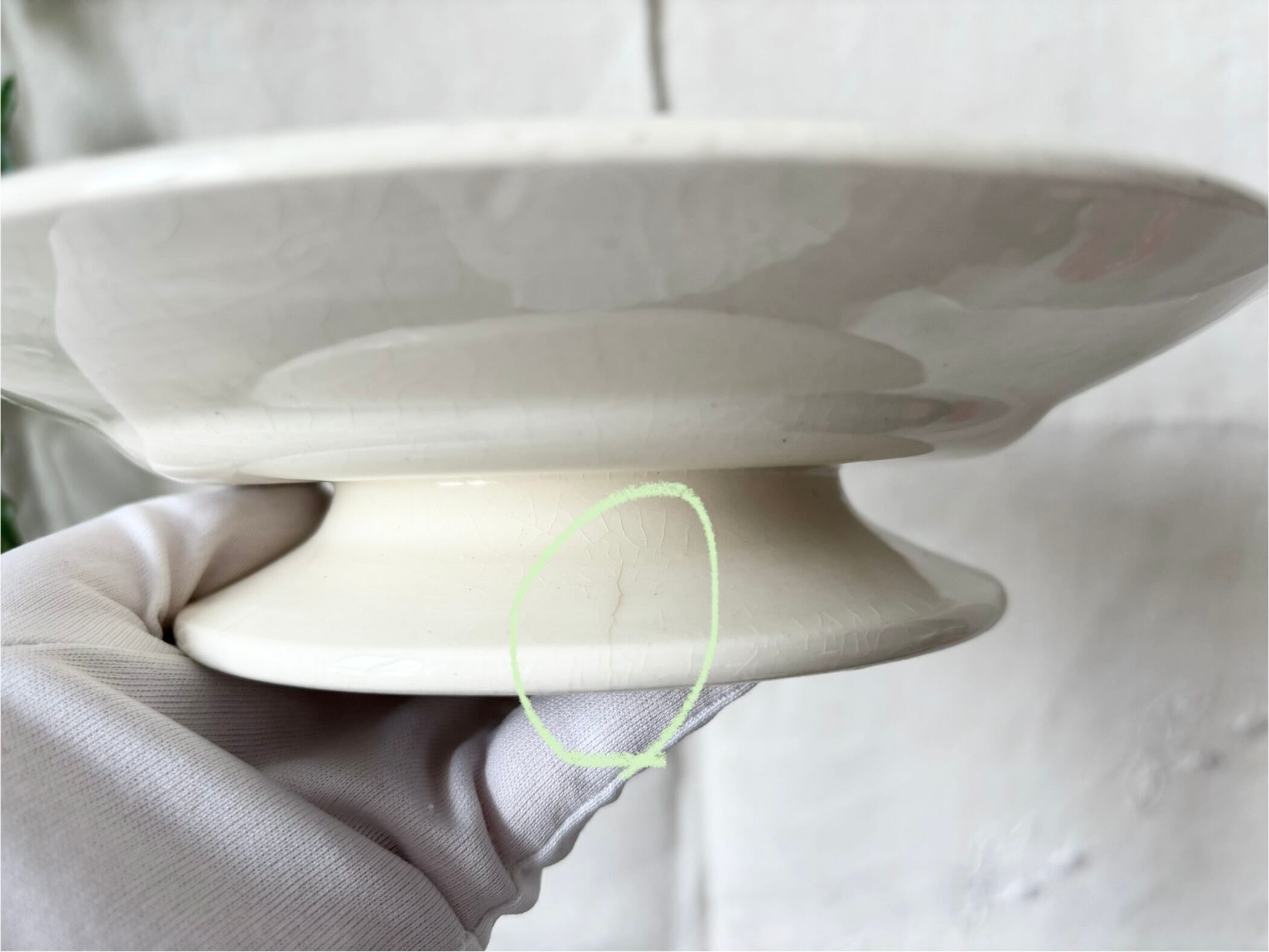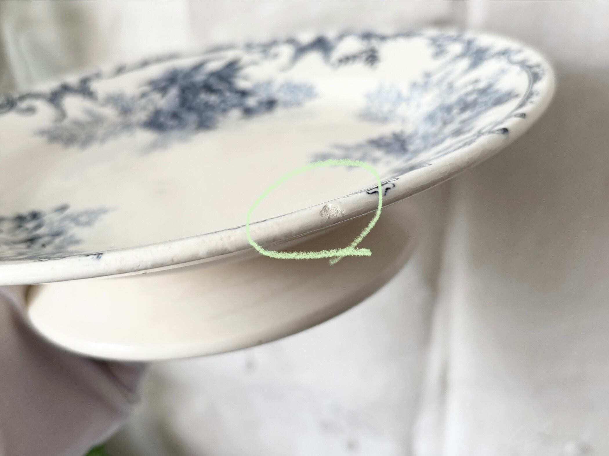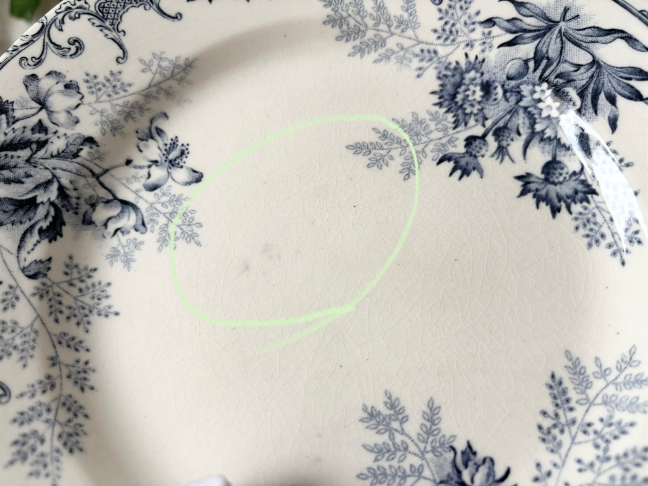 アイテムの状態として、全体に美しくクレイジングが広がっています。表面にカトラリー跡と、薄いグレーがかったシミが数カ所ございます。絵柄に多少の掠れ、とぎれ、色飛びがございます。