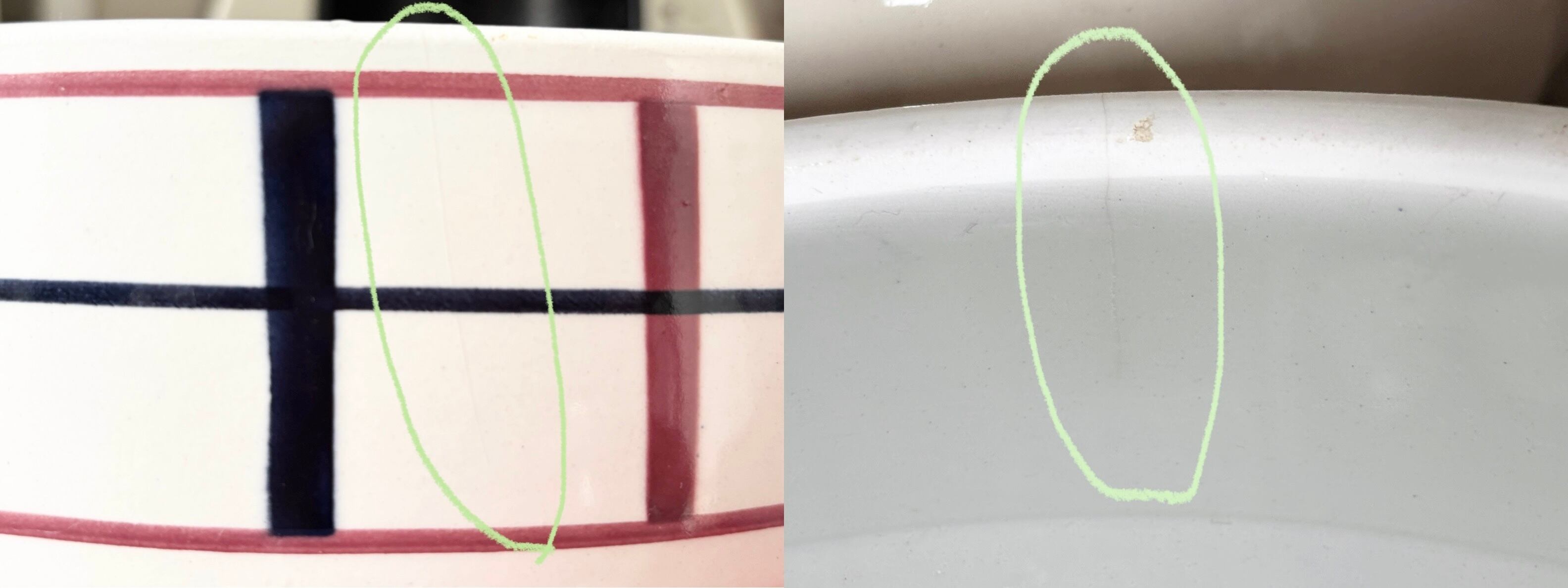 アイテムのコンディションとして、一箇所器の縁から、表裏に貫通するヒビがありますが、お湯を入れた水漏れテストで、このヒビから水漏れはありませんでした。器の縁にいくつか傷があり、その一部に変色したものもあります。ハンドルにも多少の小傷がございます。本体と蓋共に絵柄に掠れや擦れ、滲みや色飛びもございますが、これらを手描きの味わいとしてお楽しみ頂ける方向けのアイテムです。足の裏にも数カ所傷があります。掠れや途切れはございますが、押印があり、大変艶やかで、アンティークとして、大変良い状態のお品です。