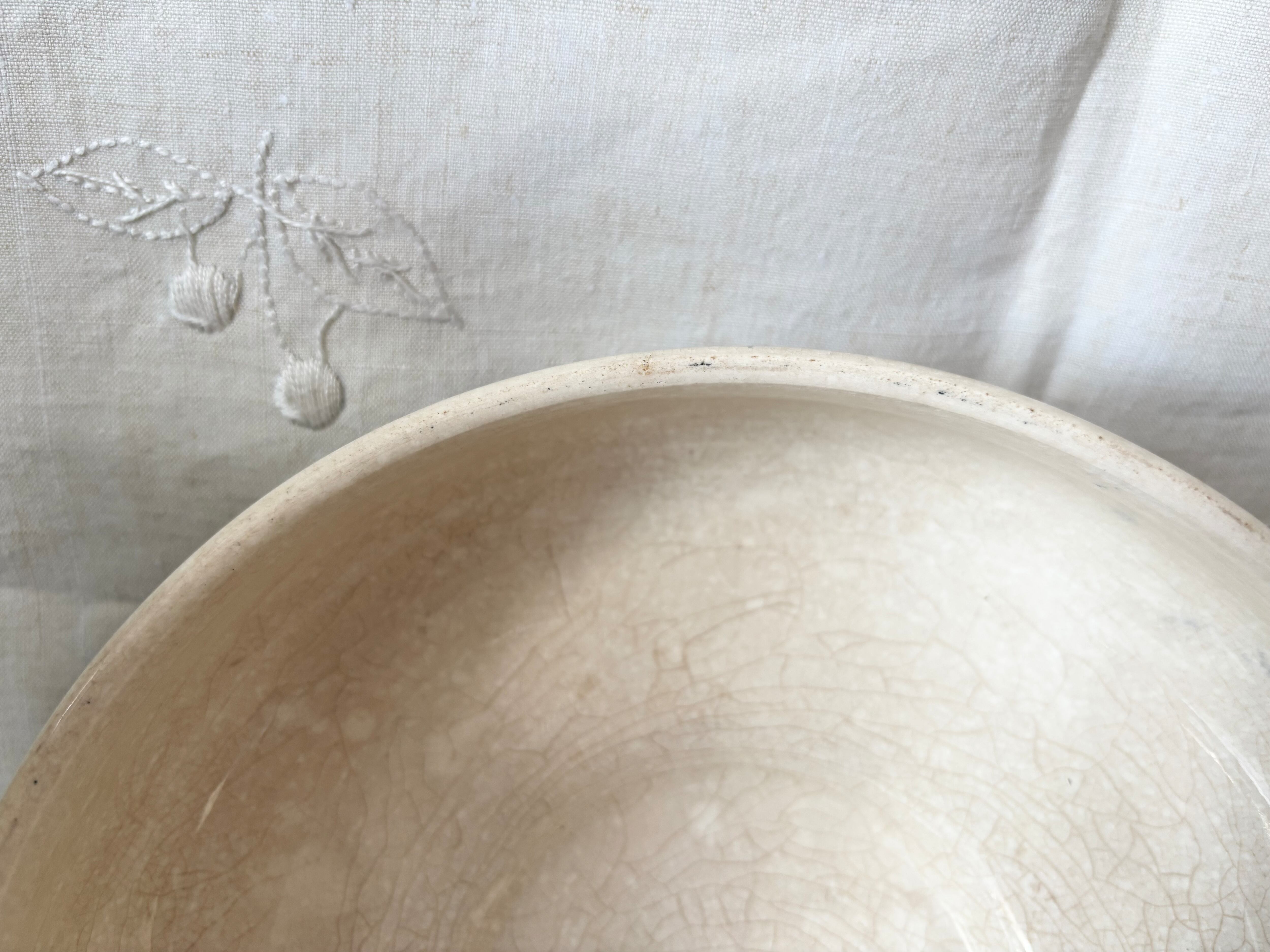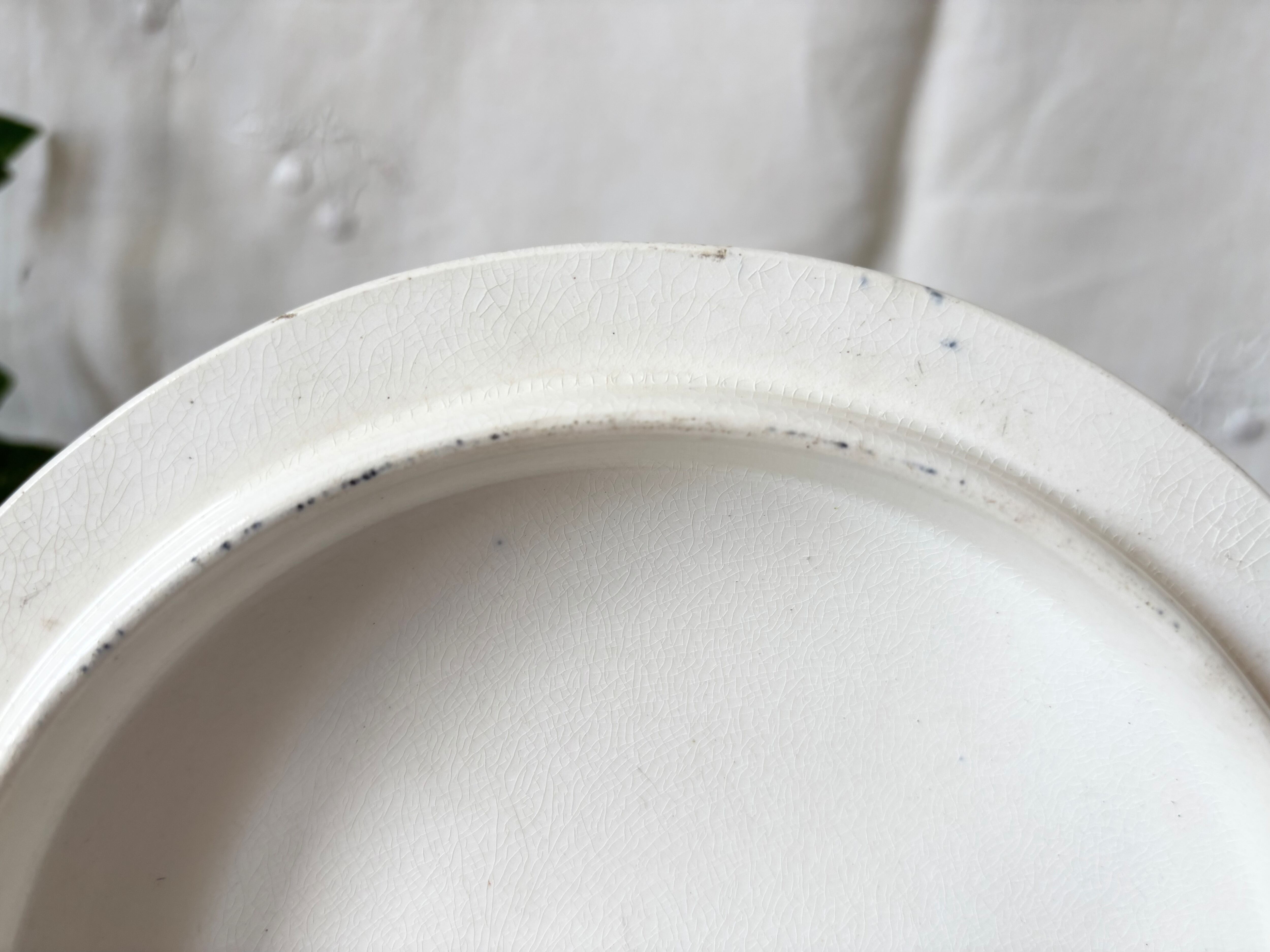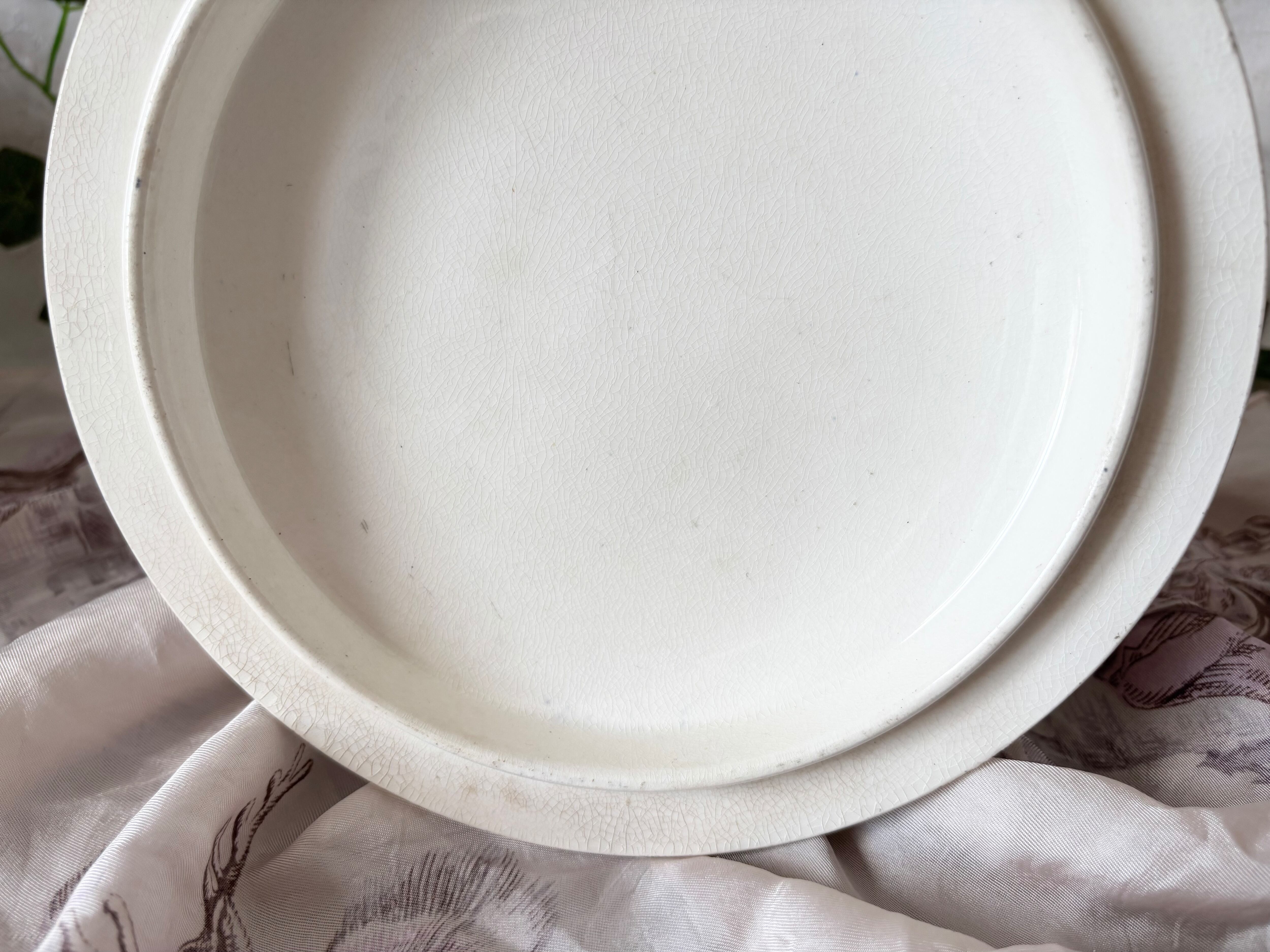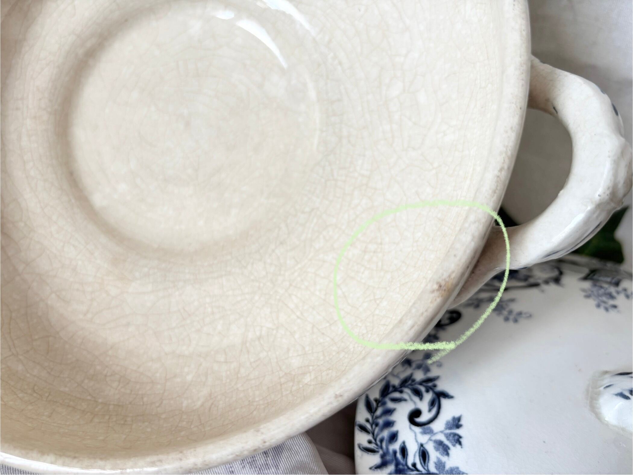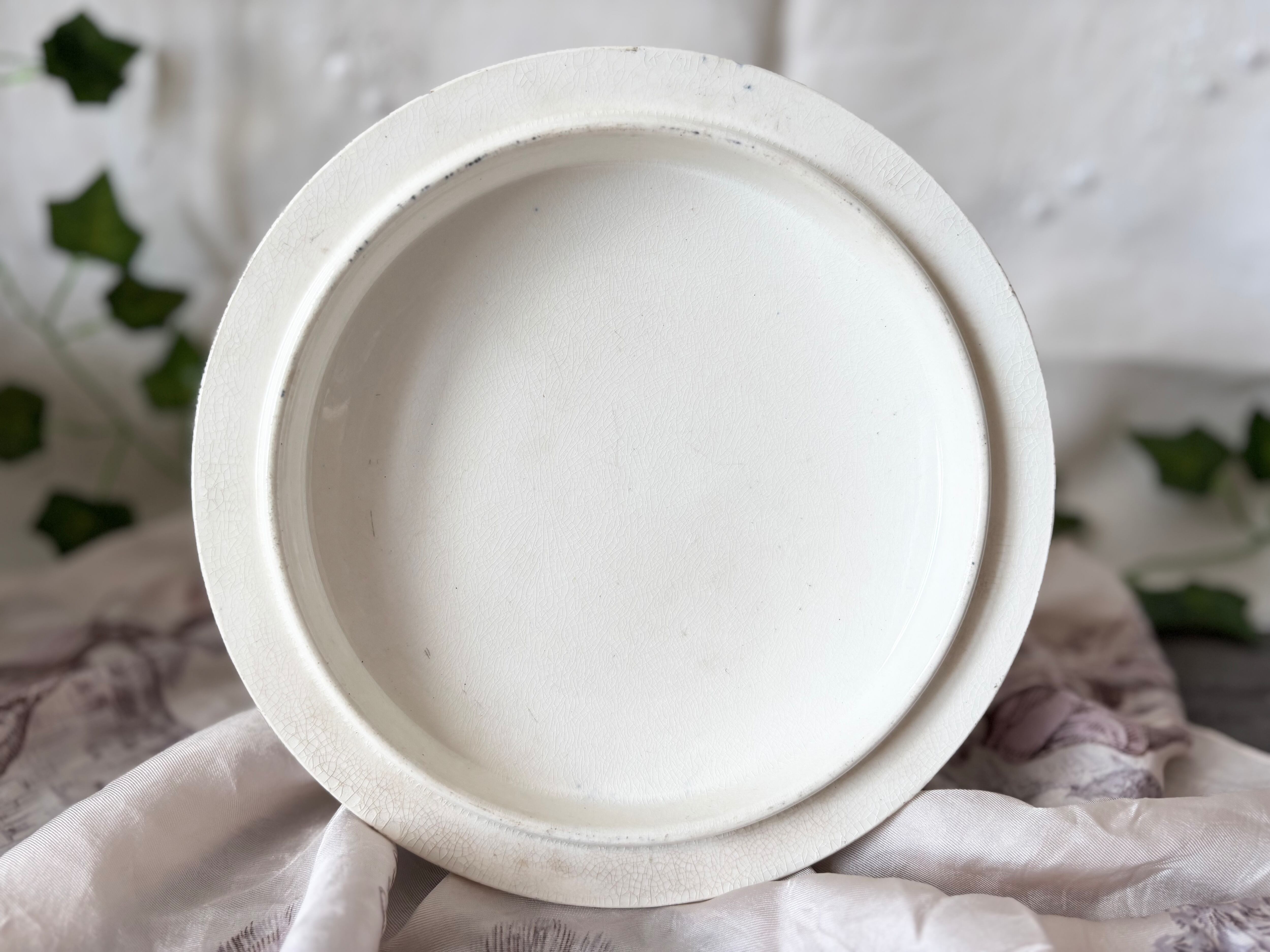 アイテムのコンディションとして、器全体にクレイジングが広がり、経年劣化の色褪せと、マダラ状のシミが広がっています。器の内側の変色とクレイジングが特に顕著で、側面に色飛びもございます。器の縁に小傷と色飛びがございます。ハンドルにも点々の細かい茶色い傷があり、足の裏に多少の擦れがございます。蓋の縁にも小傷があり、器同様に、クレイジングが広がり、一部茶色く変色し、内側を中心に、色飛びがございます。色褪せが多く使用感の強いお品で、絵柄や刻印に掠れもございますが、ひびや欠けが無く、美しい艶を保ったお品です。使用感をアンティークの味わいとしてお楽しみいただける方向けのお品です。