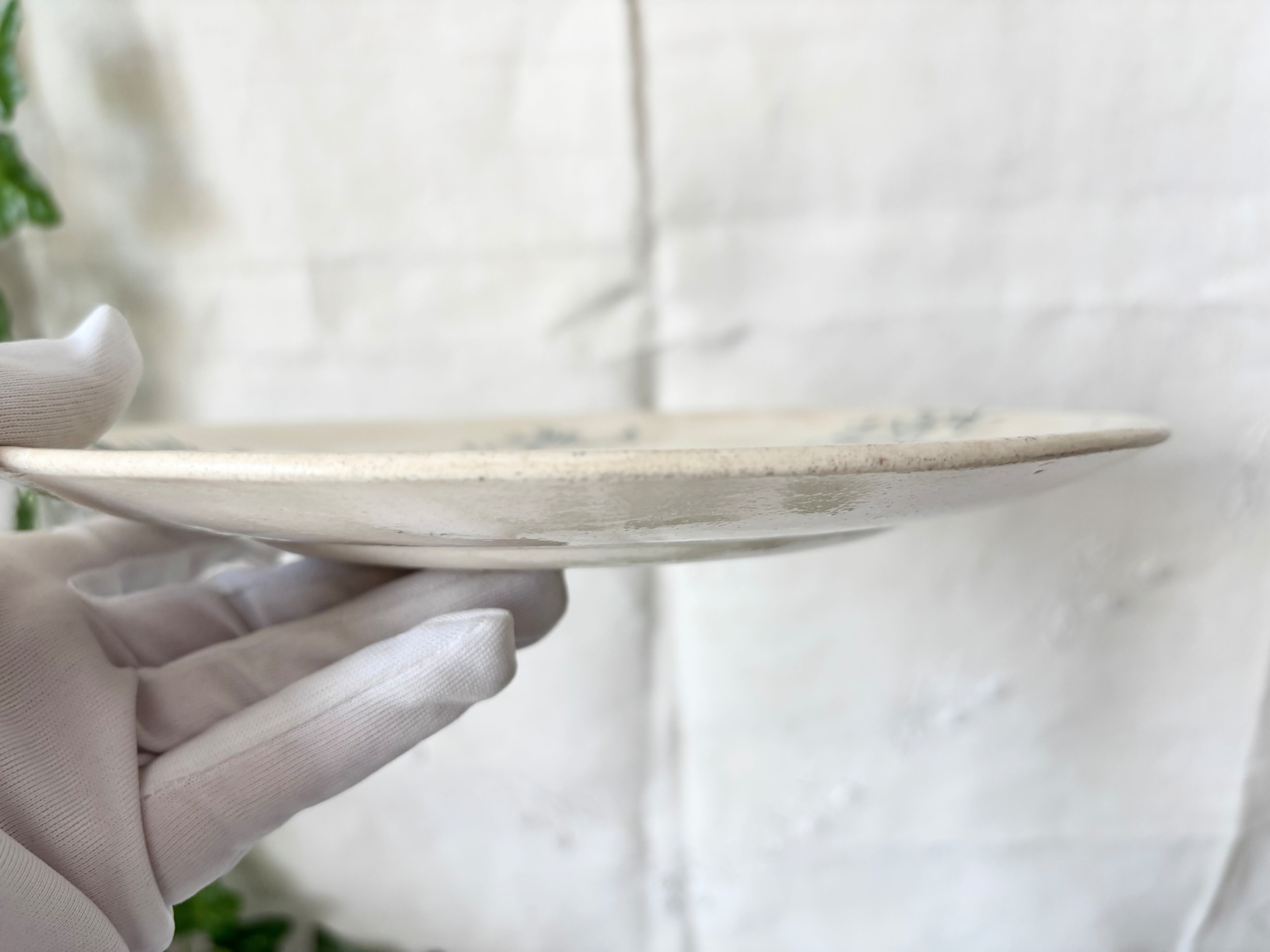 アイテムのコンディションとして、お皿全体に経年劣化の色褪せを確認できます。リムの端を中心に、ブラウンのシミがあり、エナメルの表面に気泡が沢山あるため、表面が少しざらついています。