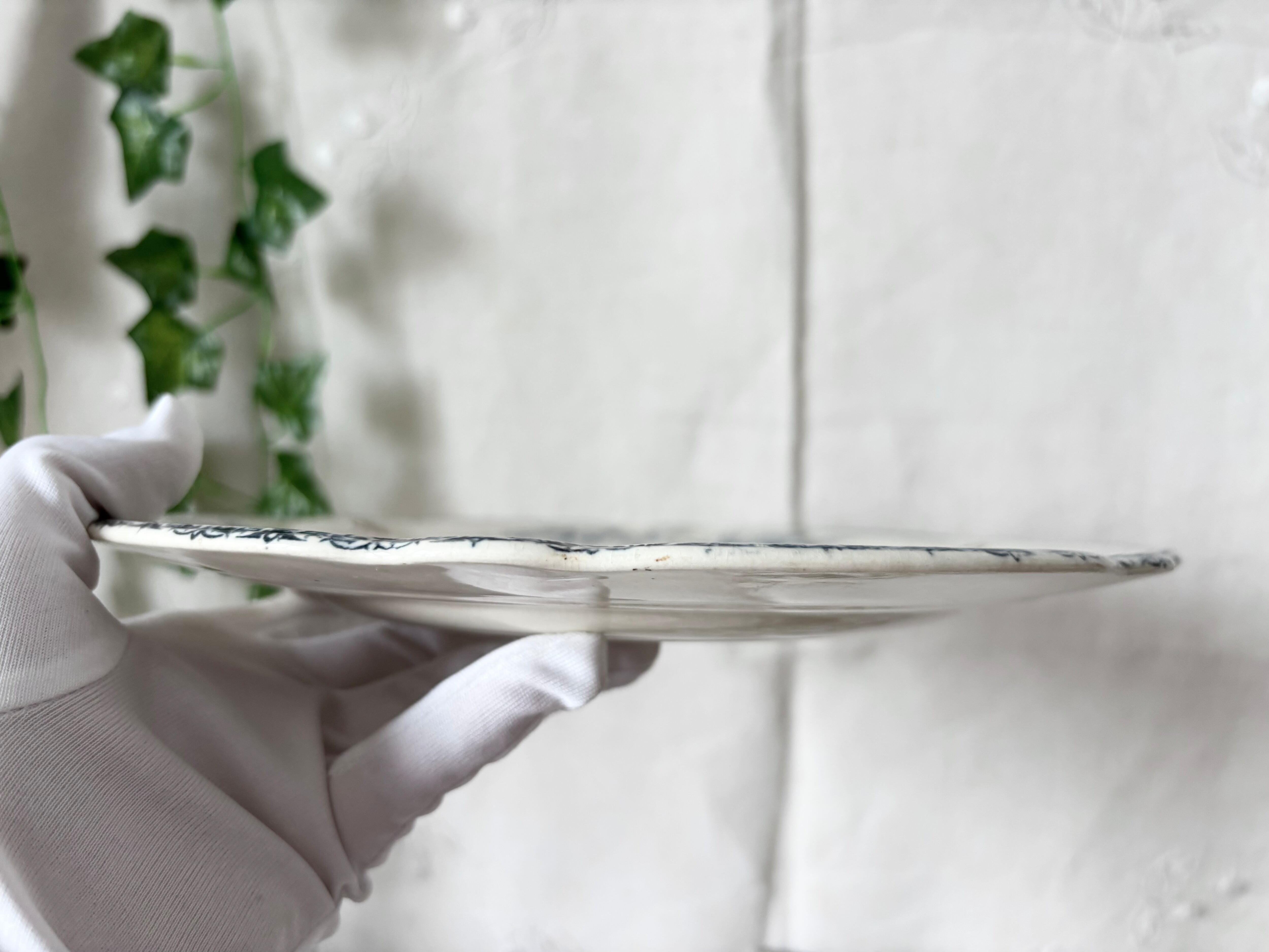 アイテムのコンディションとして、お皿全体にクレイジングが美しく広がり、その一部が変色し、まだら状の薄いシミが広がっています。カトラリー跡があります。横から見ると、変色を伴った僅かな小傷がいくつかリムにございます。裏側も同様に変色したクレイジングが広がり、リムに幾つかの色飛びと、変色を伴った小傷がいくつか見られます。足の裏に、押印にかかる形で、薄いヒビがございます。絵柄と押印に多少の掠れ、途切れ、もございますが、艶やかで、アンティークとして、大変良い状態のお品物です。押印と刻印の両方がございます。