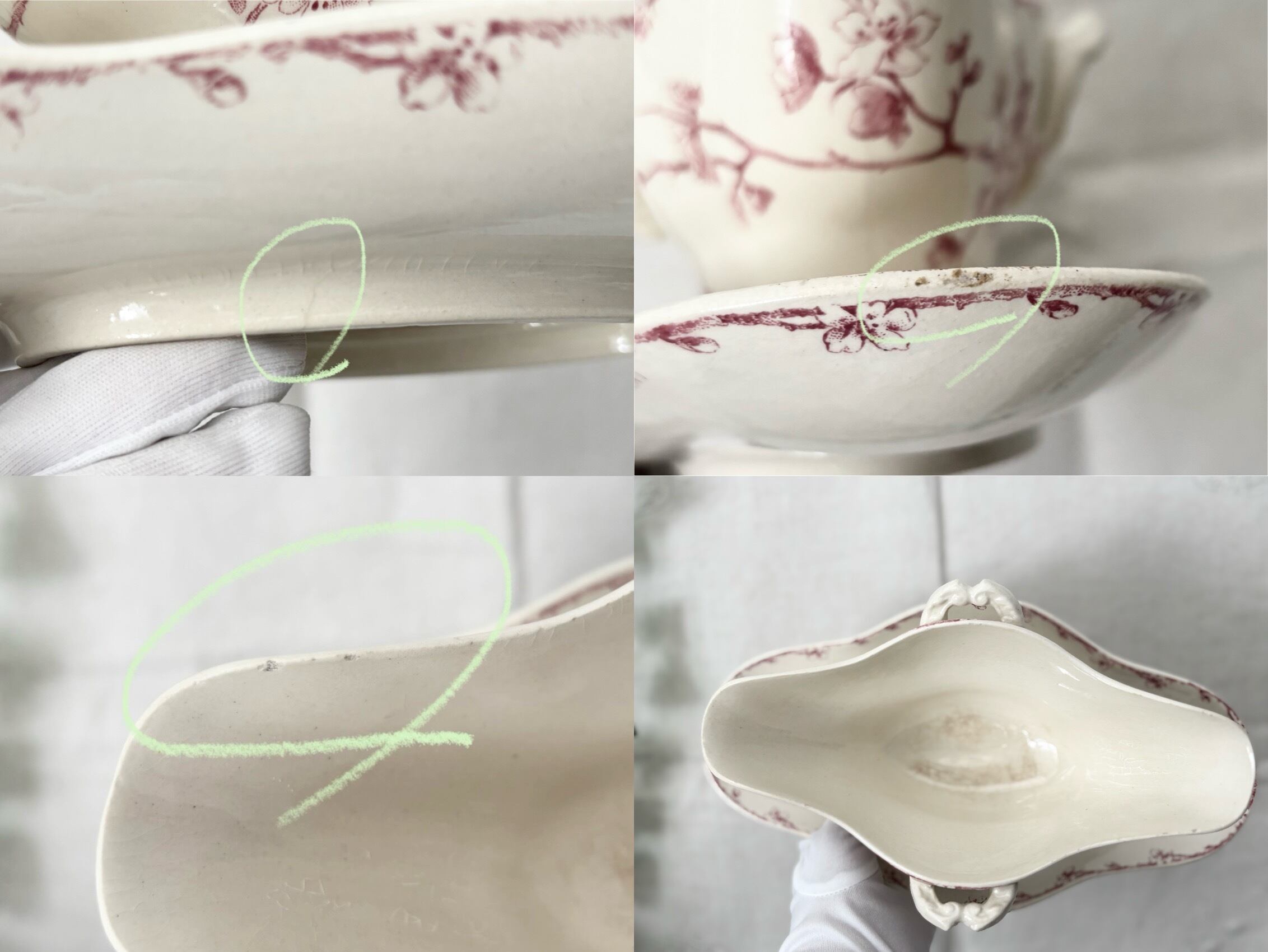 アイテムのコンディションとして、器の内側を中心にクレイジングが広がり、特にそこの部分でブラウンの変色を見せています。器の端に小傷が幾つか確認でき、縁にぼんやりとした変色がございます。ハンドルに、多少の色飛びがございます。受け皿にも貫入が広がり、端に変色を伴った小傷がございます。絵柄と押印に掠れもございますが、アンティークとして、良い状態のお品と言えます。