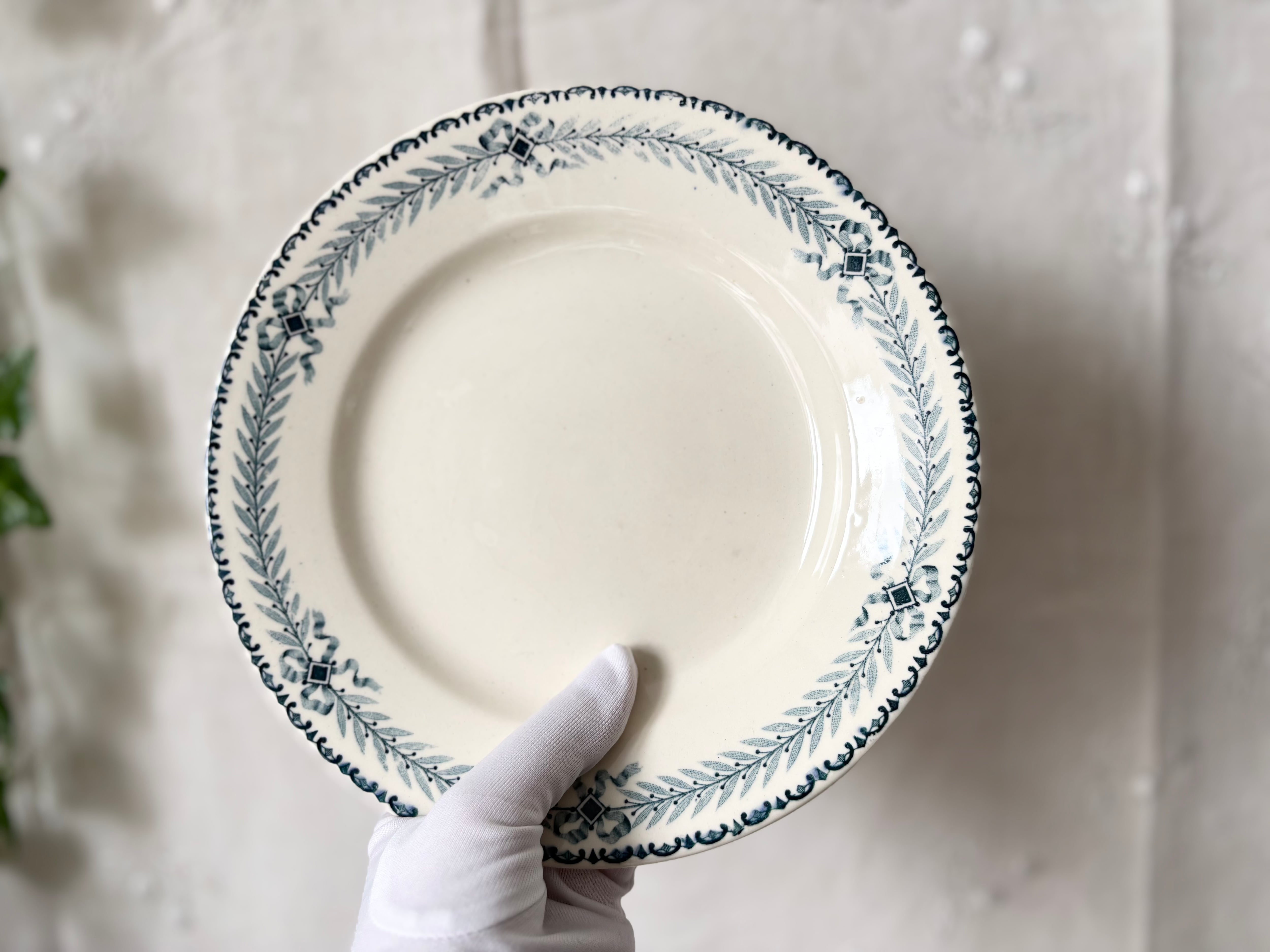 19世紀から20世紀初頭にかけて人気を博したCHINONシリーズ。グレーがかった藍色のリボンとリーフのガーランドが、甘すぎない可愛いらしさを演出します。