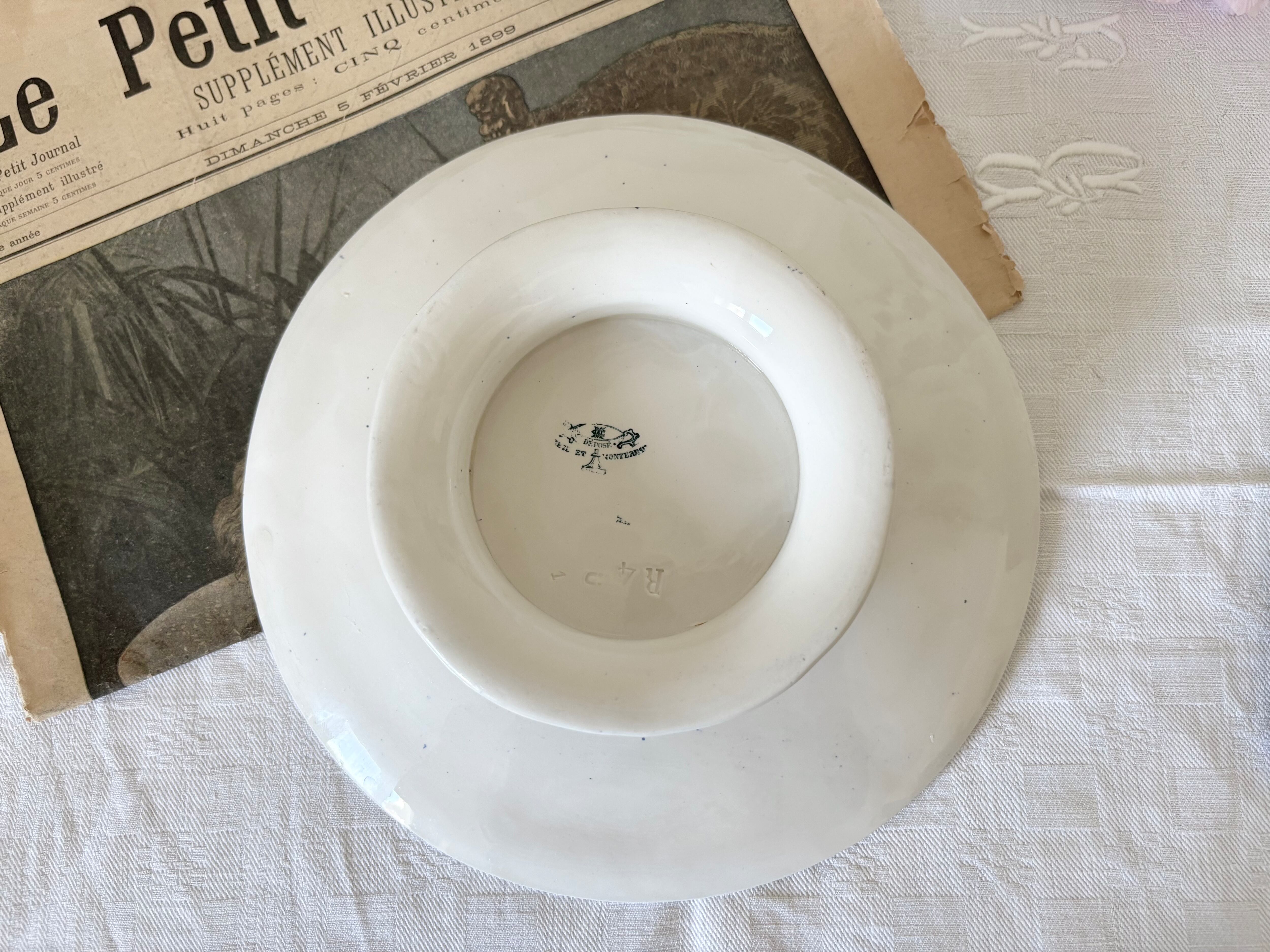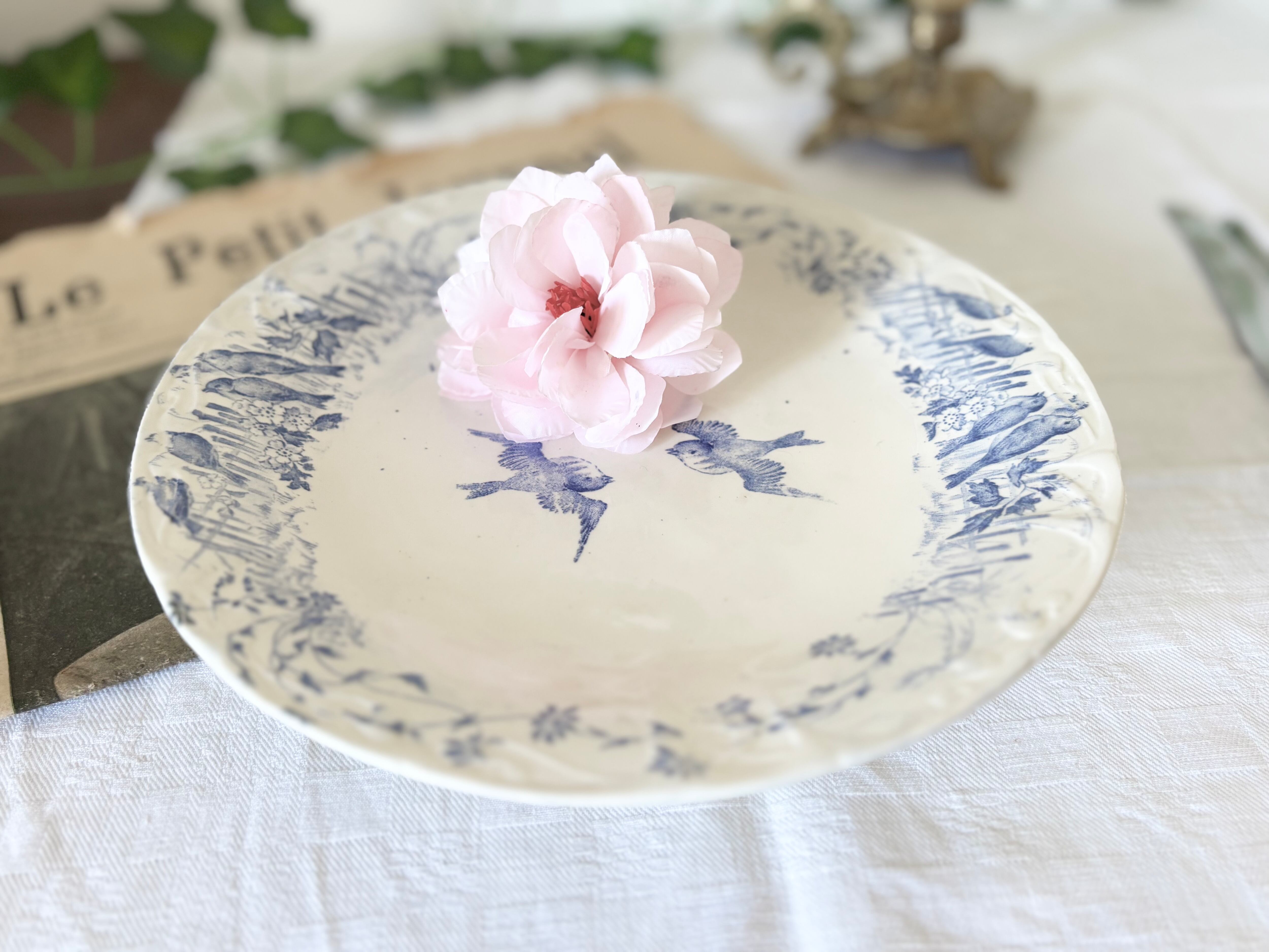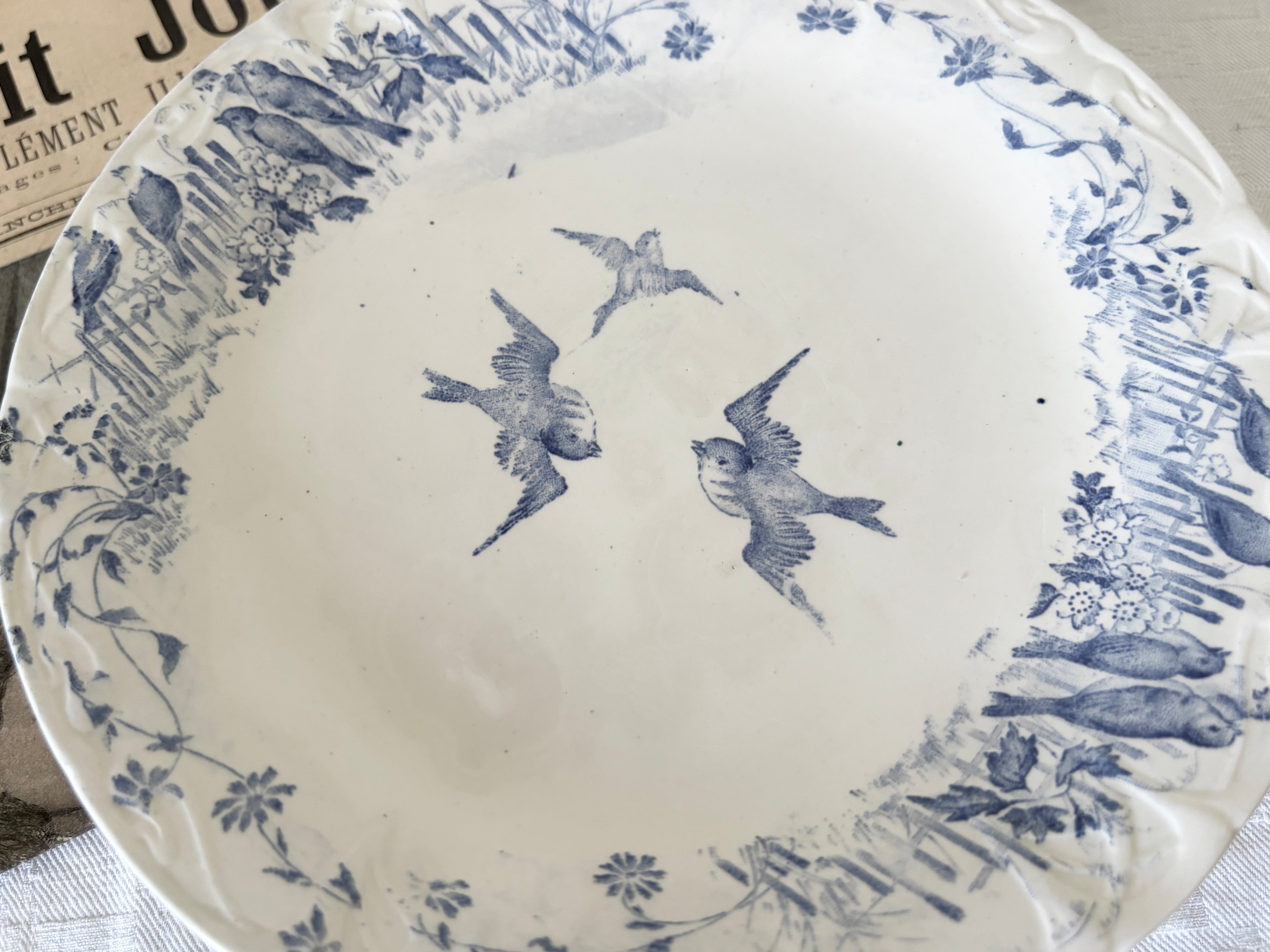 刻印より1884 - 1920年代に製作されたと判別できるこのアイテムは、生成りの白に、明るい藍色で、Bocage(田園風景)に戯れる、沢山の可愛い小鳥達が描かれています。