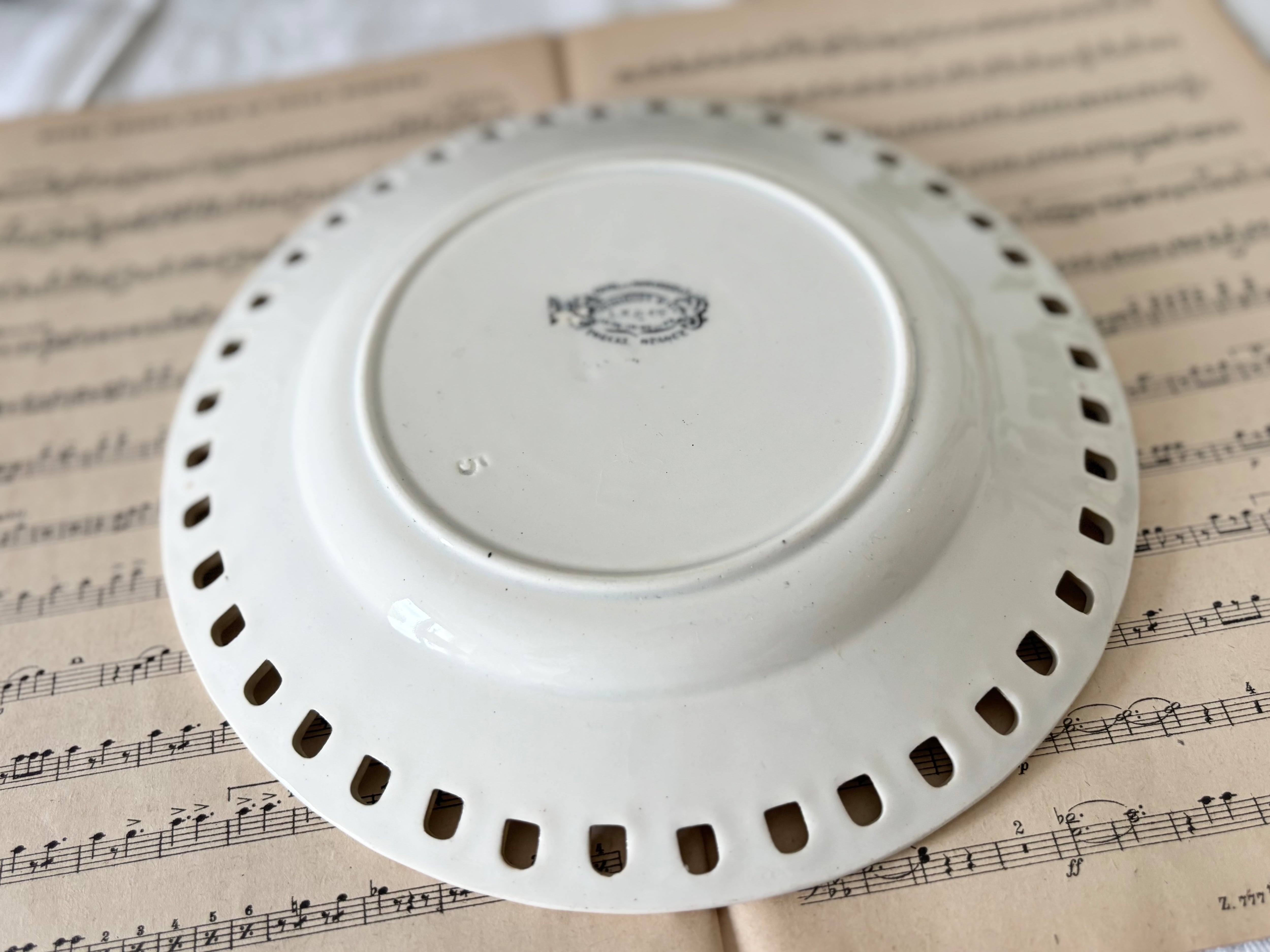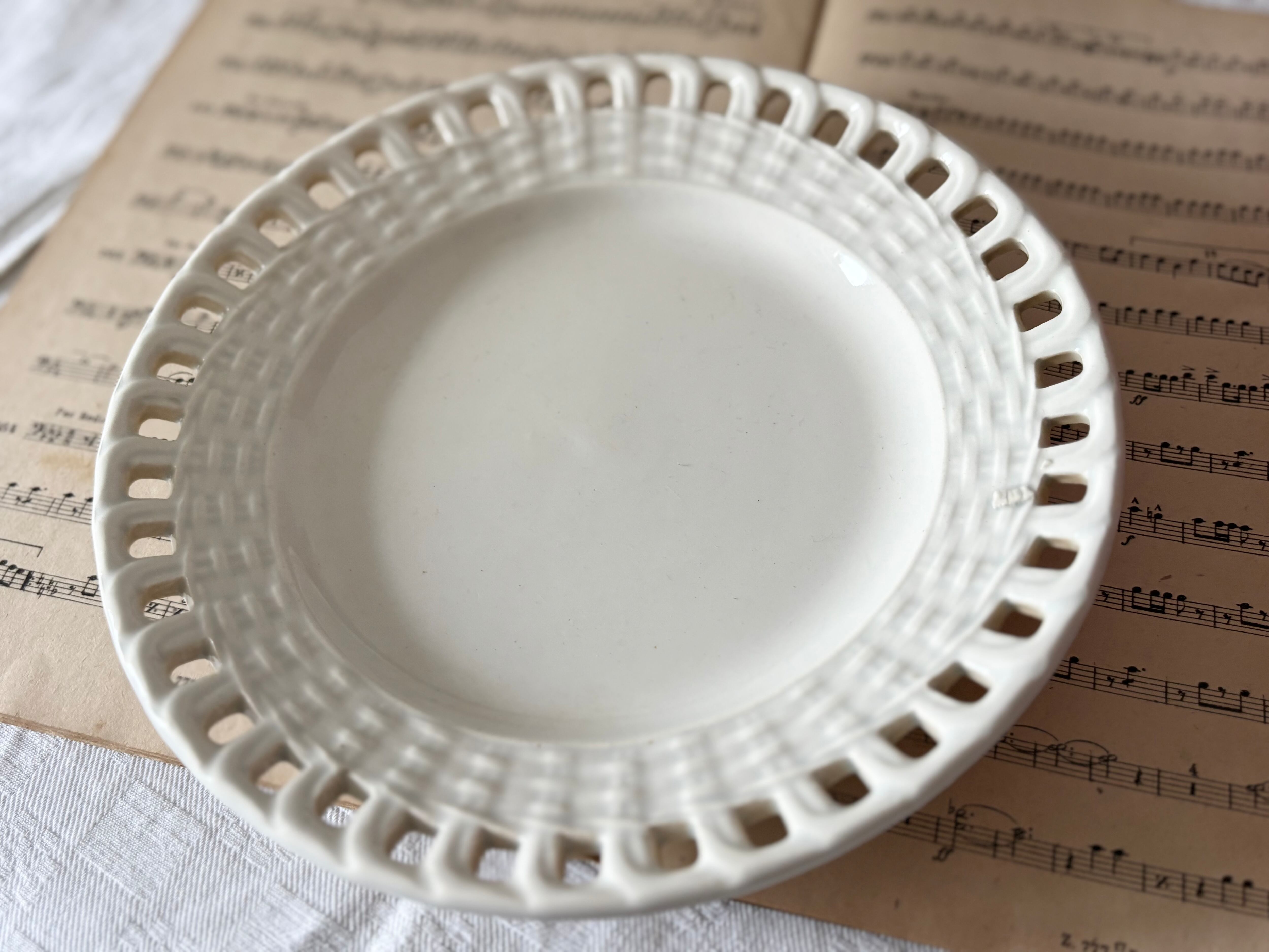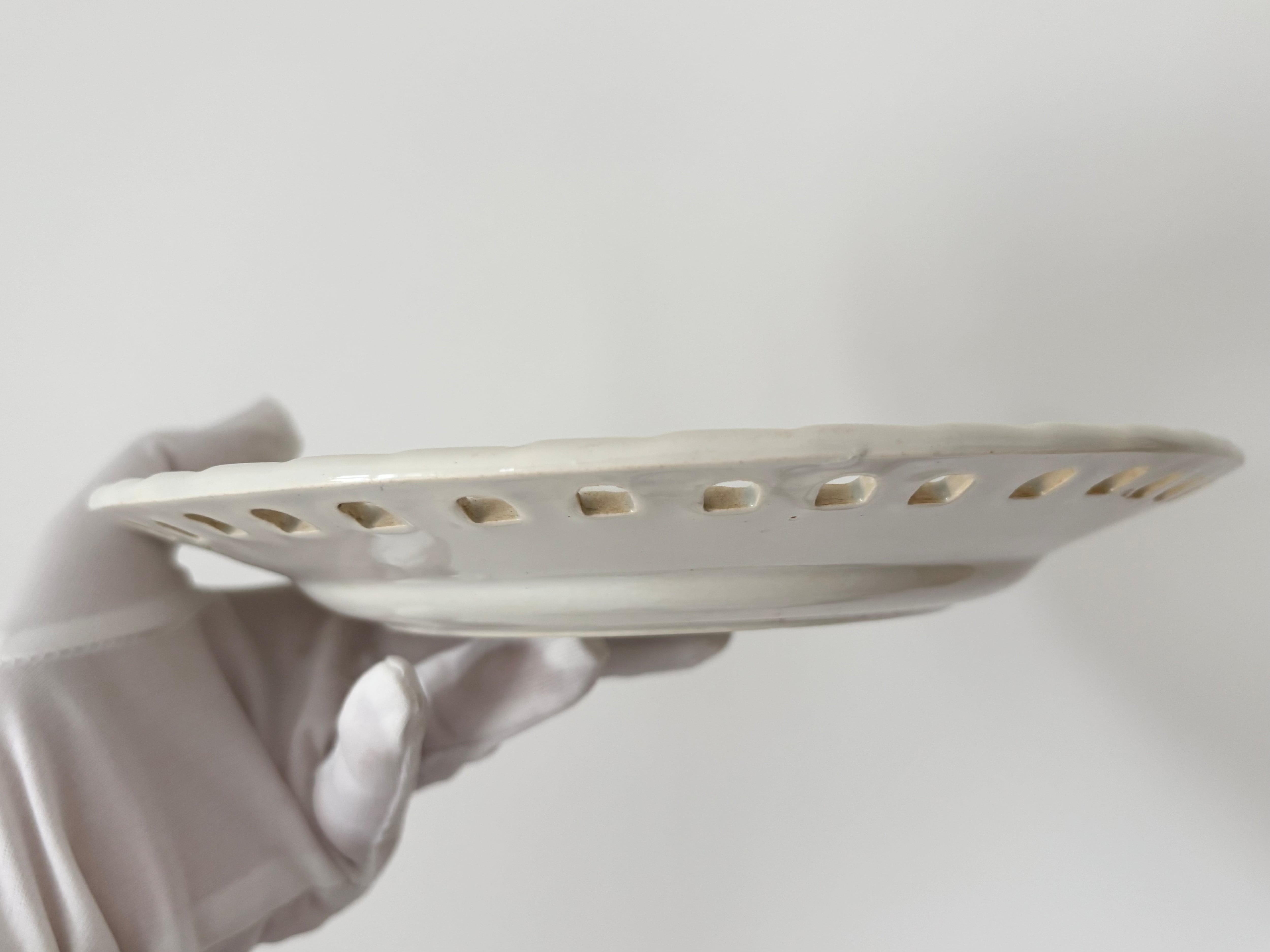 アイテムのコンディションとして、僅かなカトラリー跡と、透かし彫りの端々にブラウンの変色が見られます。リムの一箇所に、写真に記したように、制作時にできたと思われる、パニエ模様の突起がございます。