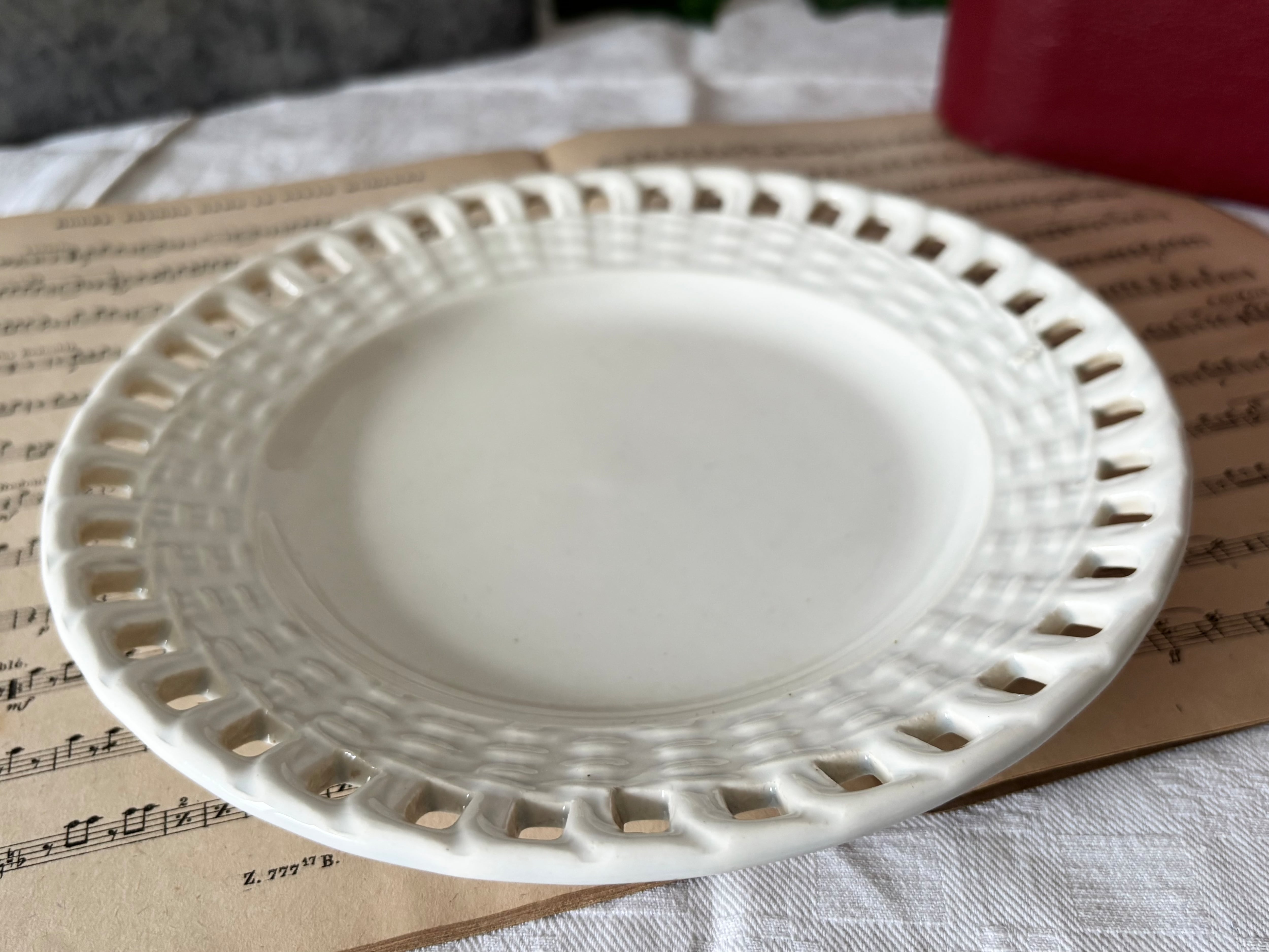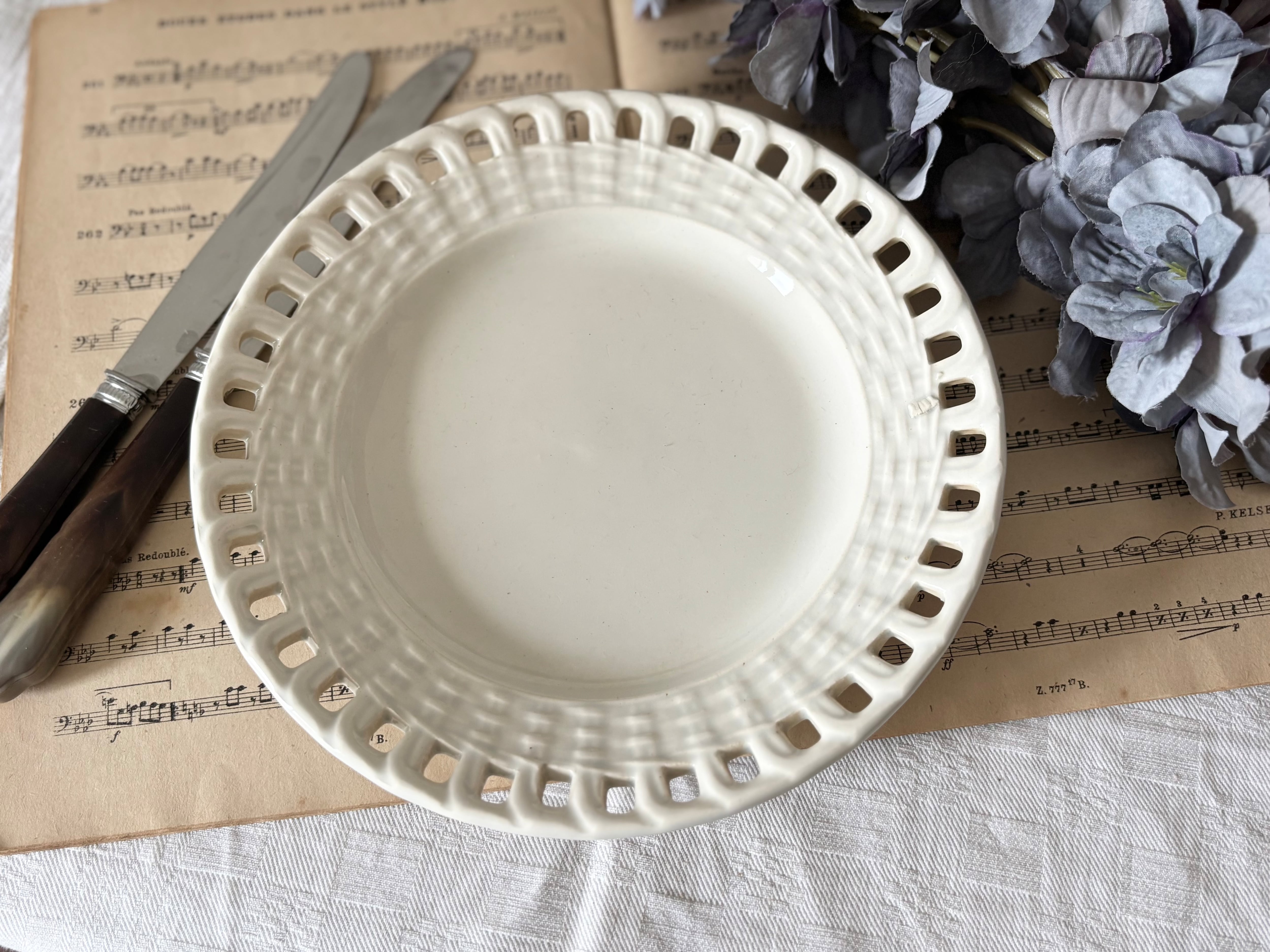 リムに広がった透かし彫(パニエ)が見事で、見るものの目を惹きつけて止みません。また、柔らかなアイボリーカラーの表面に日が当たると、陰影が際立ち、時を重ねた美しさが、一層際立ちます。