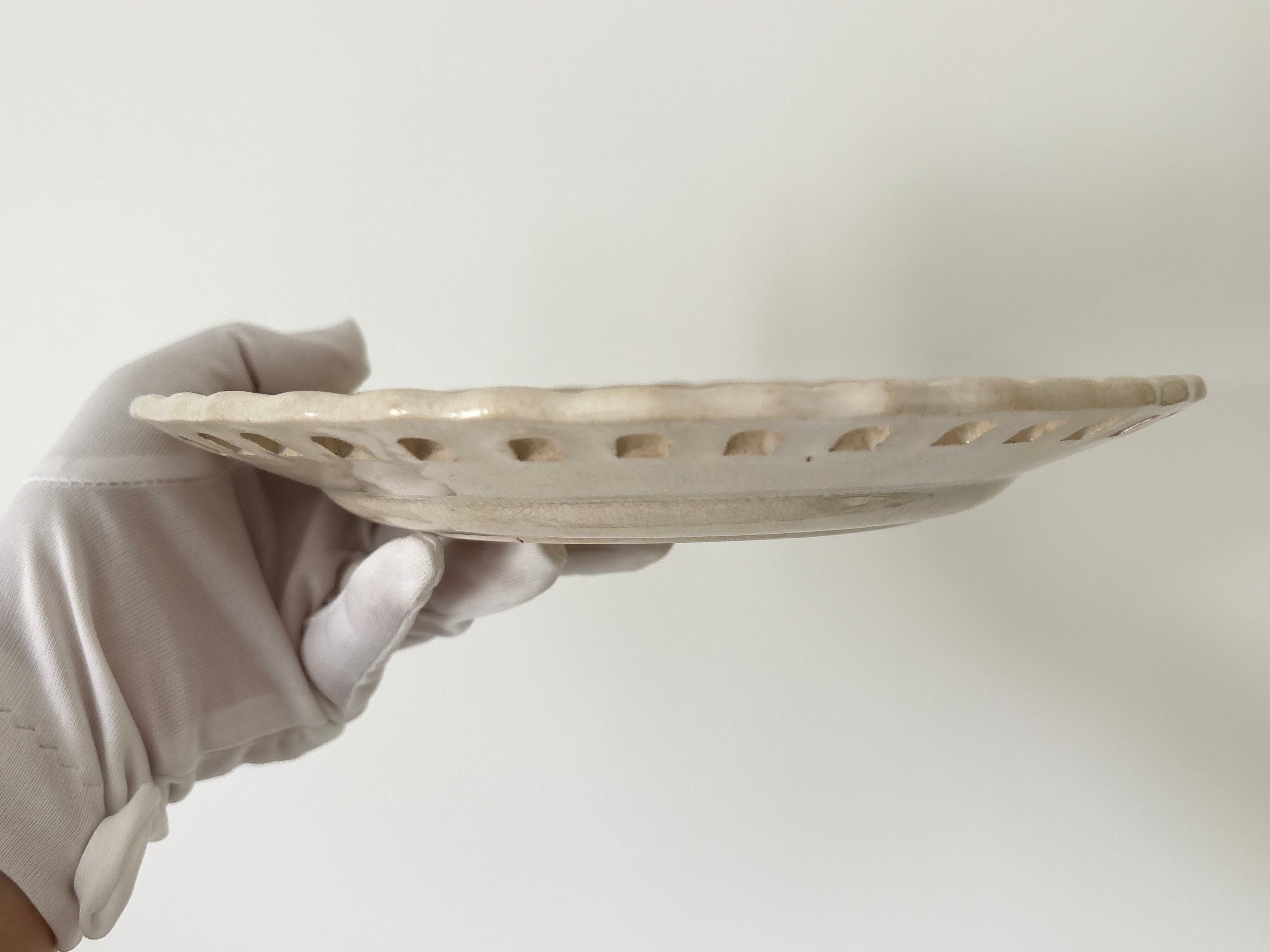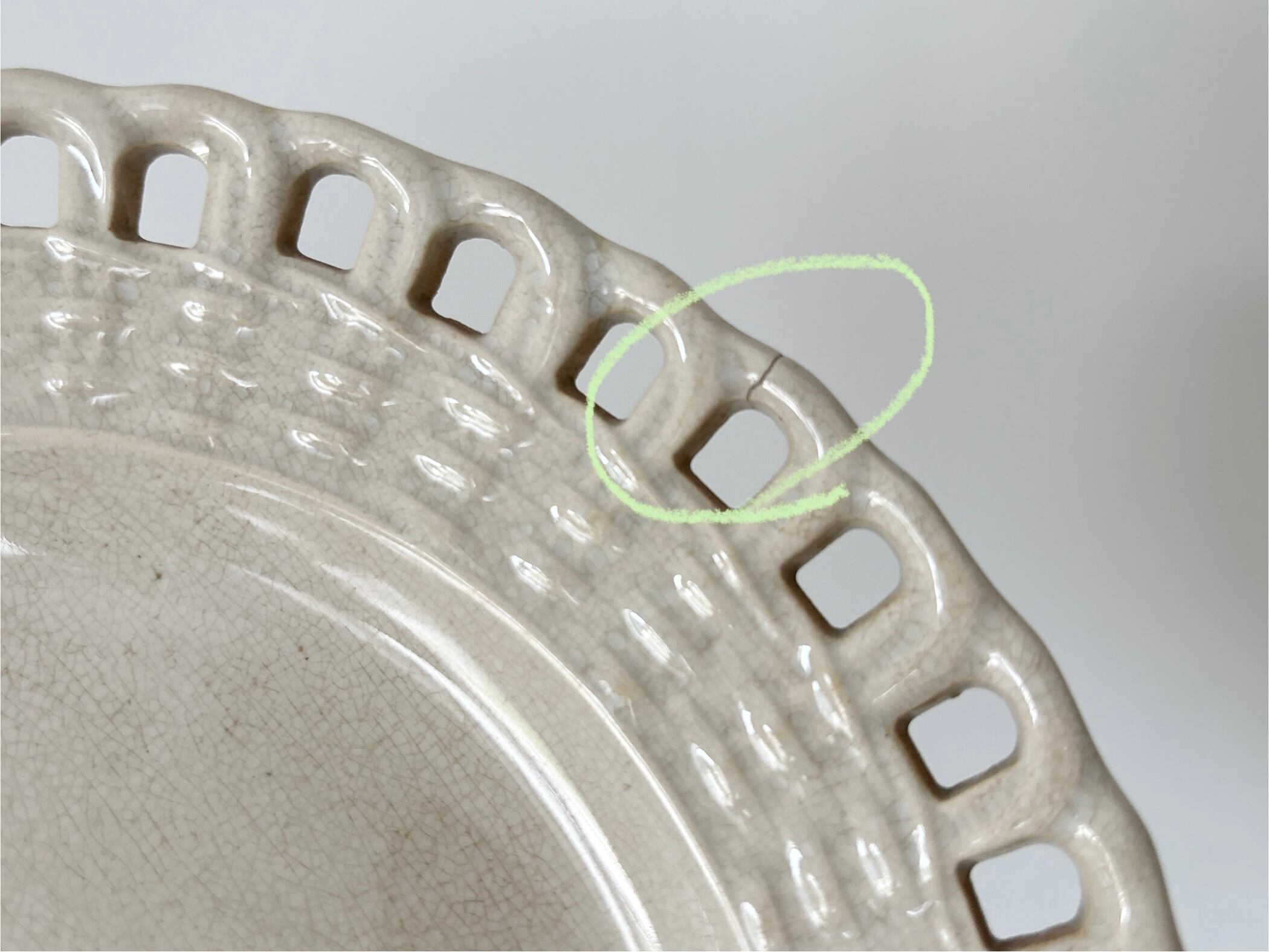 リムに広がった透かし彫(パニエ)が見事で、見るものの目を惹きつけて止みません。また、柔らかなアイボリーカラーの表面に日が当たると、陰影が際立ち、時を重ねた美しさが、一層際立ちます。