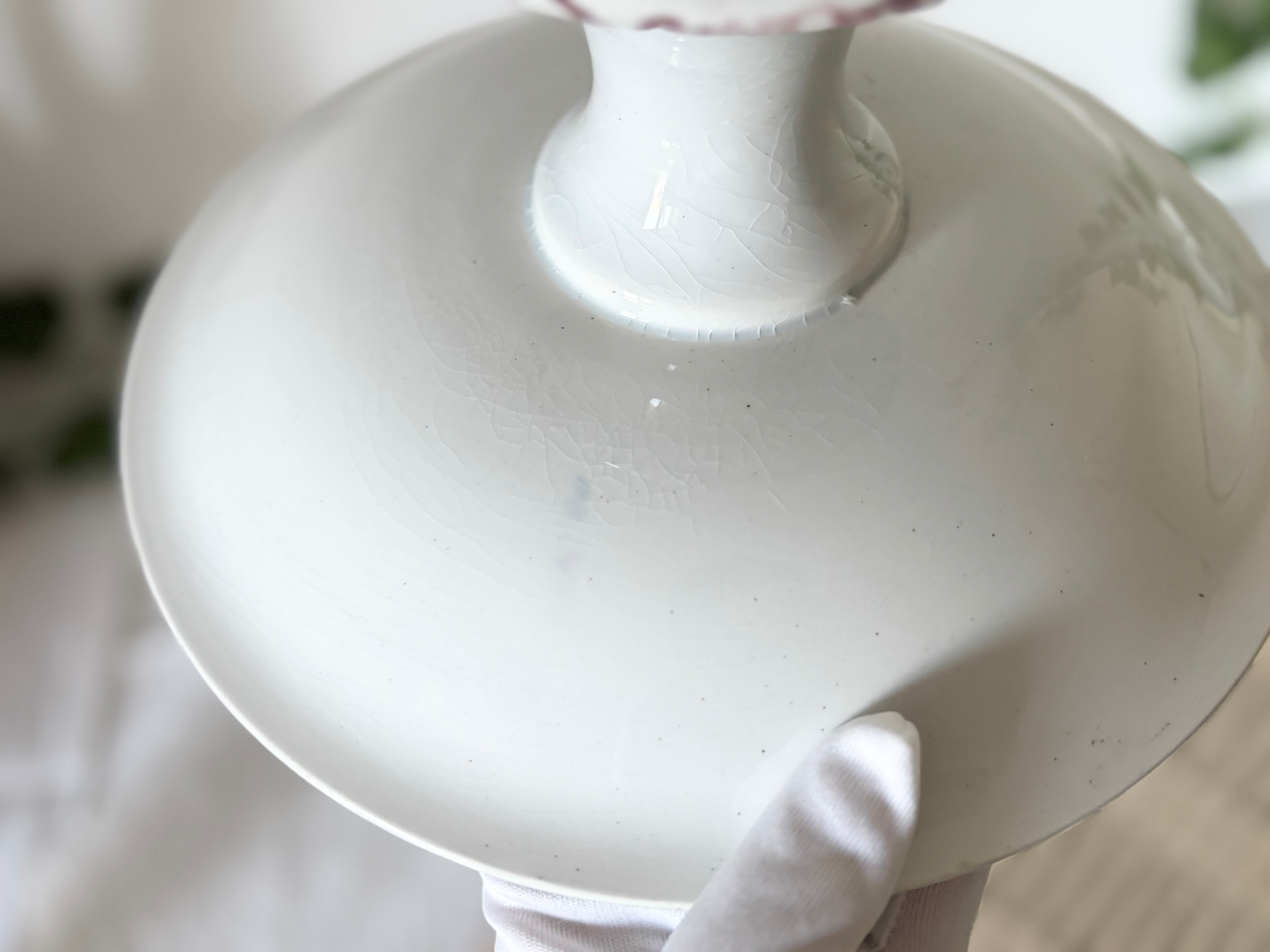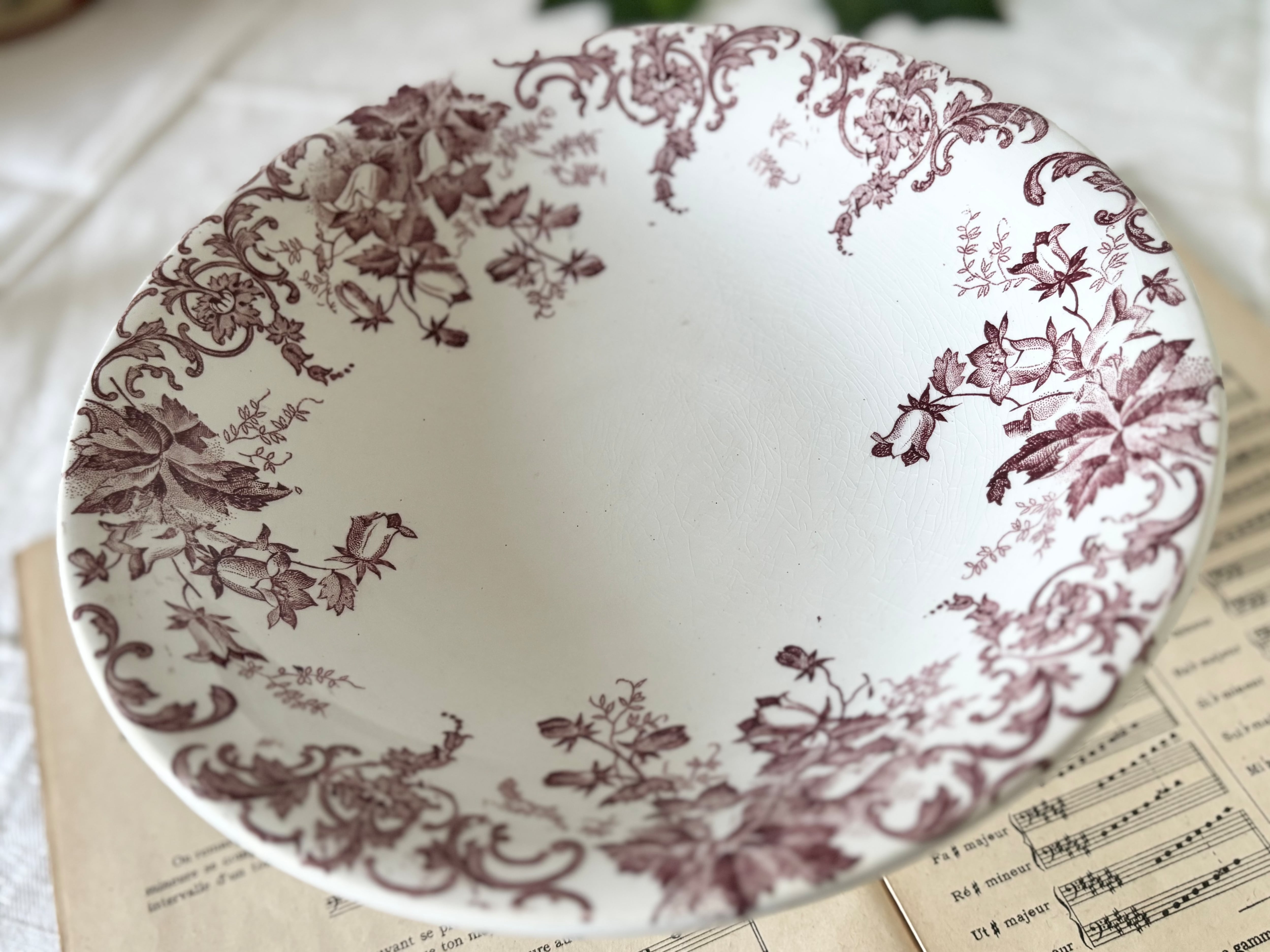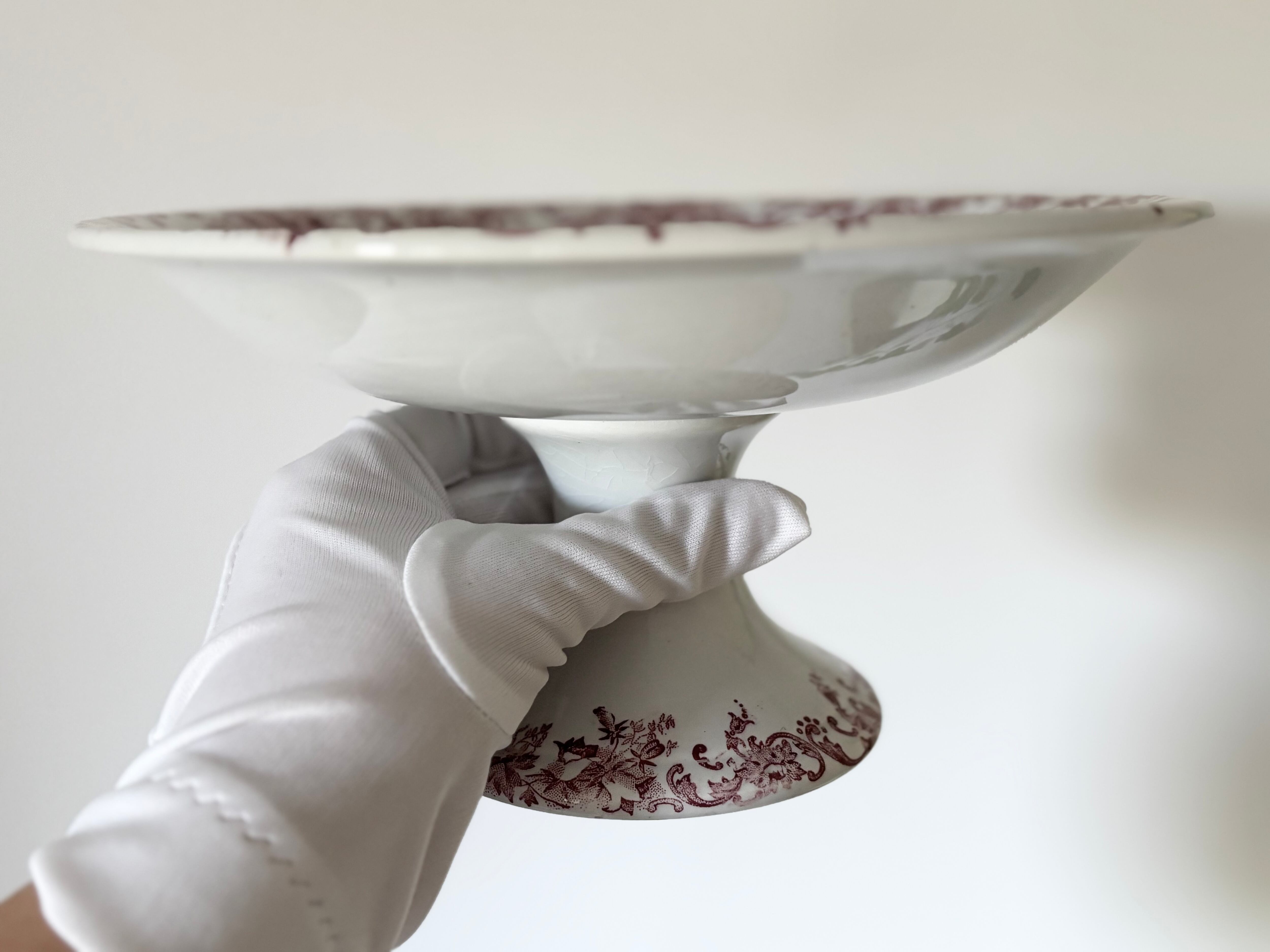 アイテムのコンディションとして、表面に細かくクレイジングが広がり、絵柄の中に数カ所エナメルが突起した箇所がございます。裏から一箇所リムにヒビが入っていて、表面まで一部貫通していますが、表からは、殆ど見えないほど薄いです。裏側に青い色飛びがございます。足の裏に擦れたような跡と変色、鉄粉のようなブラウンの跡があります。絵柄や押印に、掠れや途切れもありますが、大変艶やかで、アンティークとして、良い状態のお品と言えます。