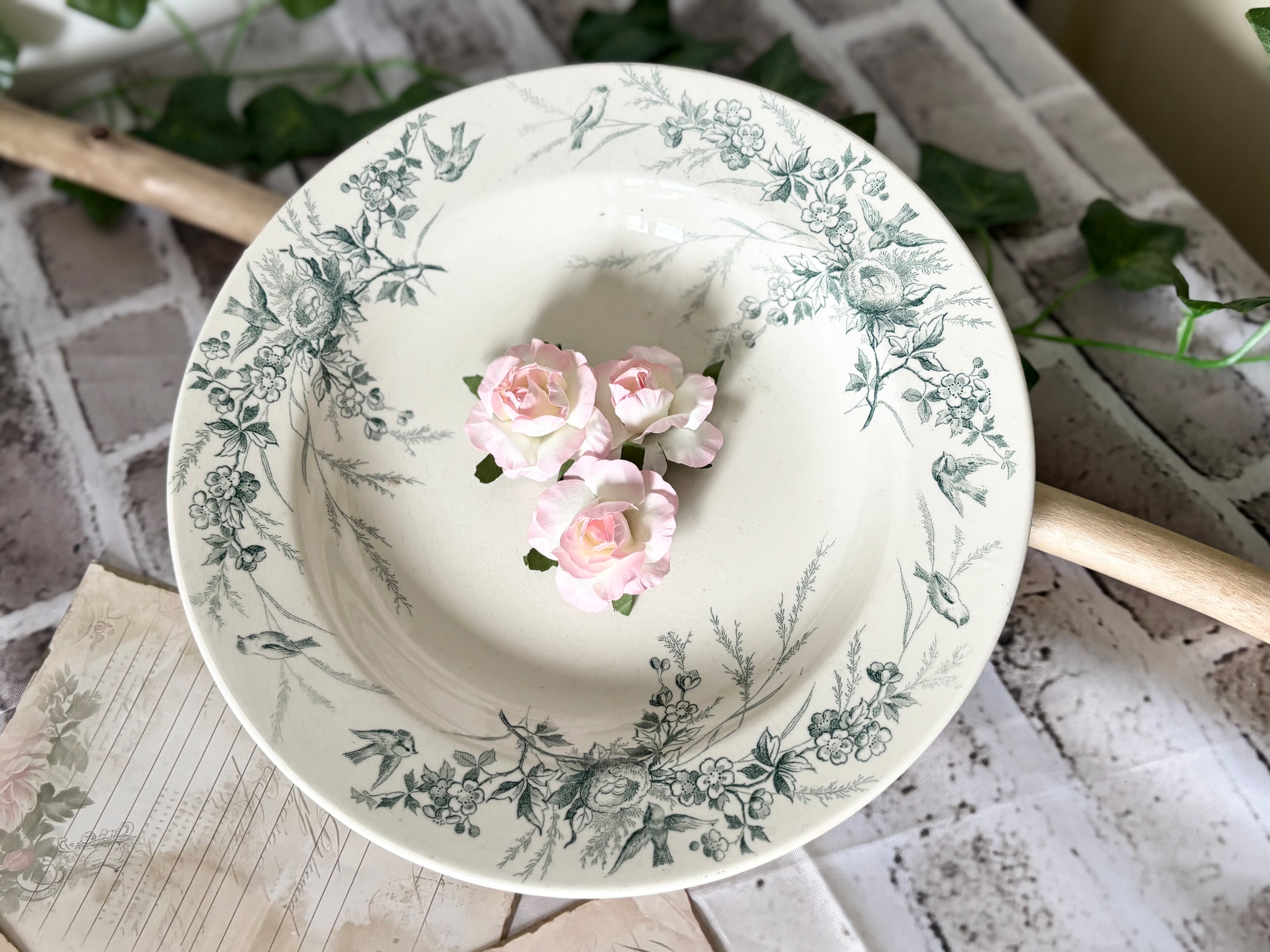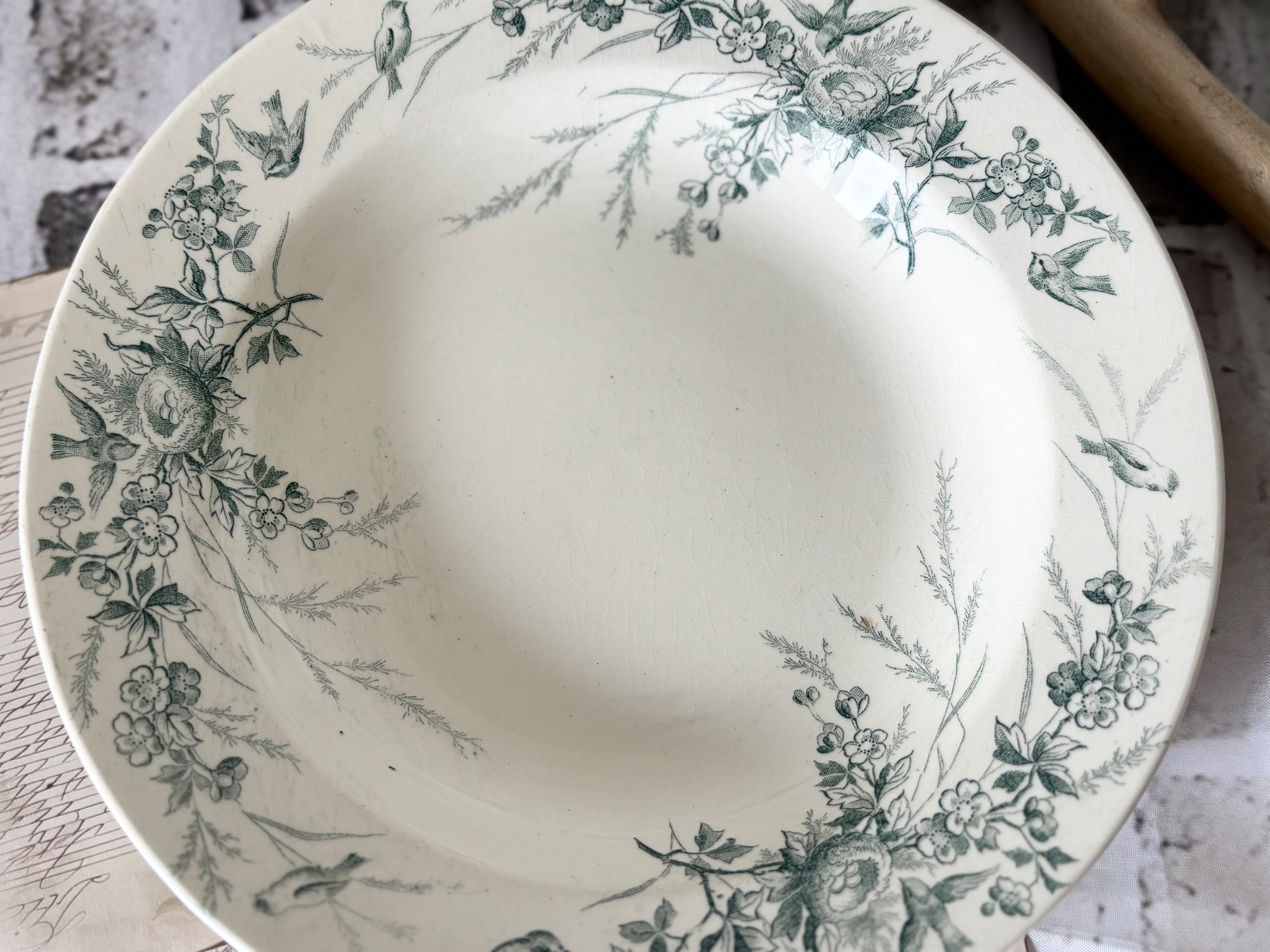 A Green : Creil et montereau / Linotte / deep plate / 19 century antique / France / bird /クレイユエモントロー / テールドフェール / 深皿 / 鳥