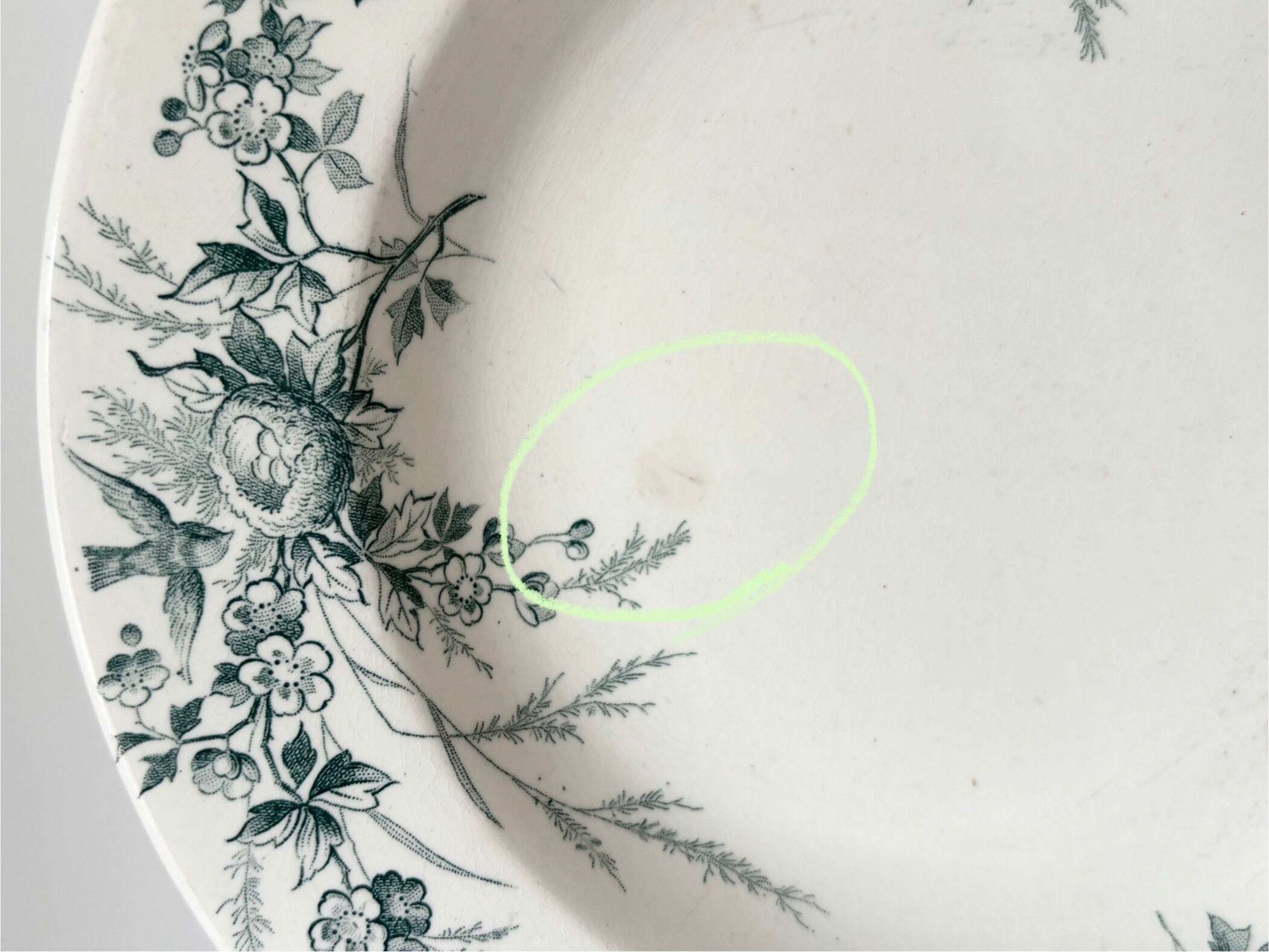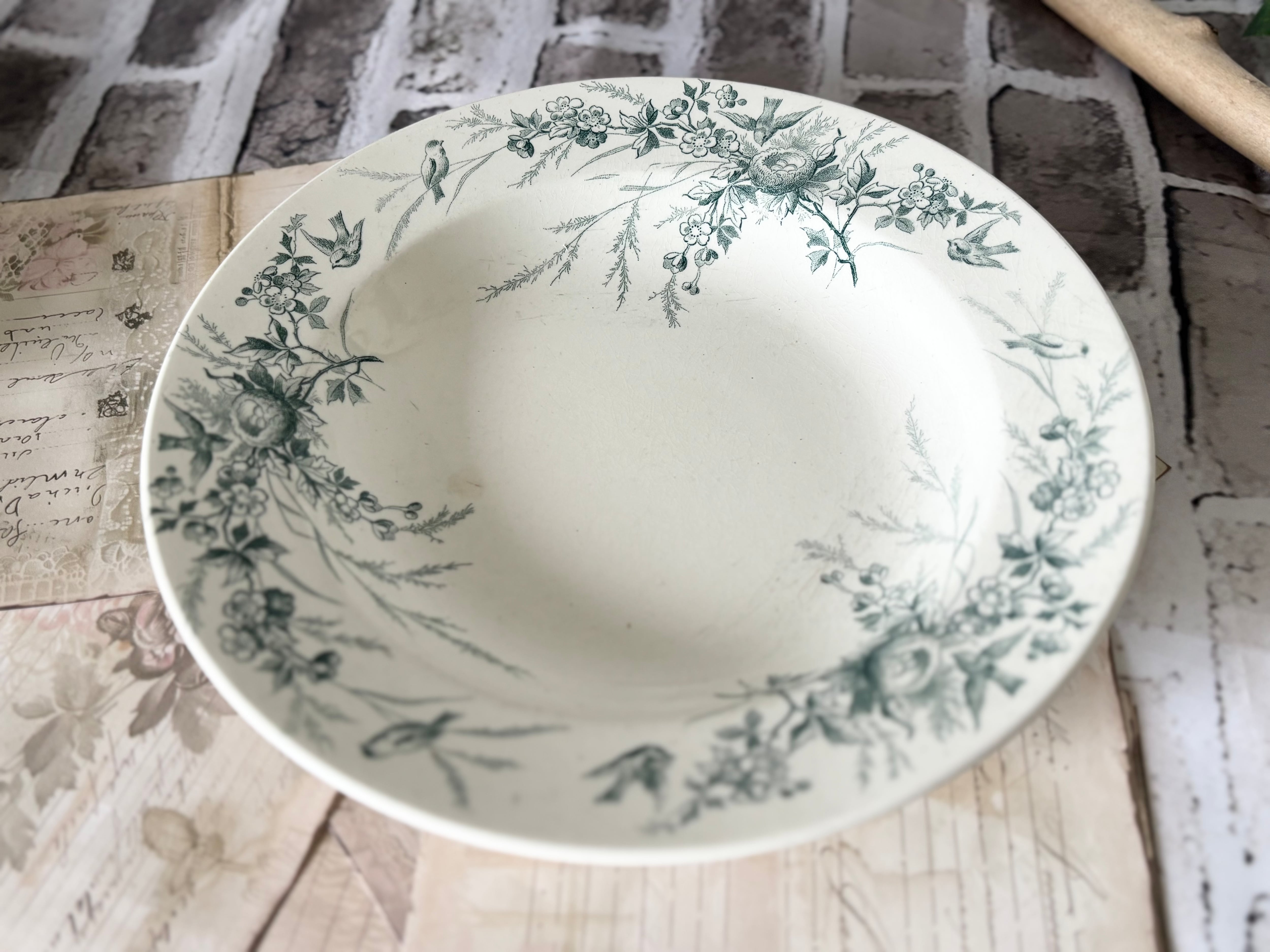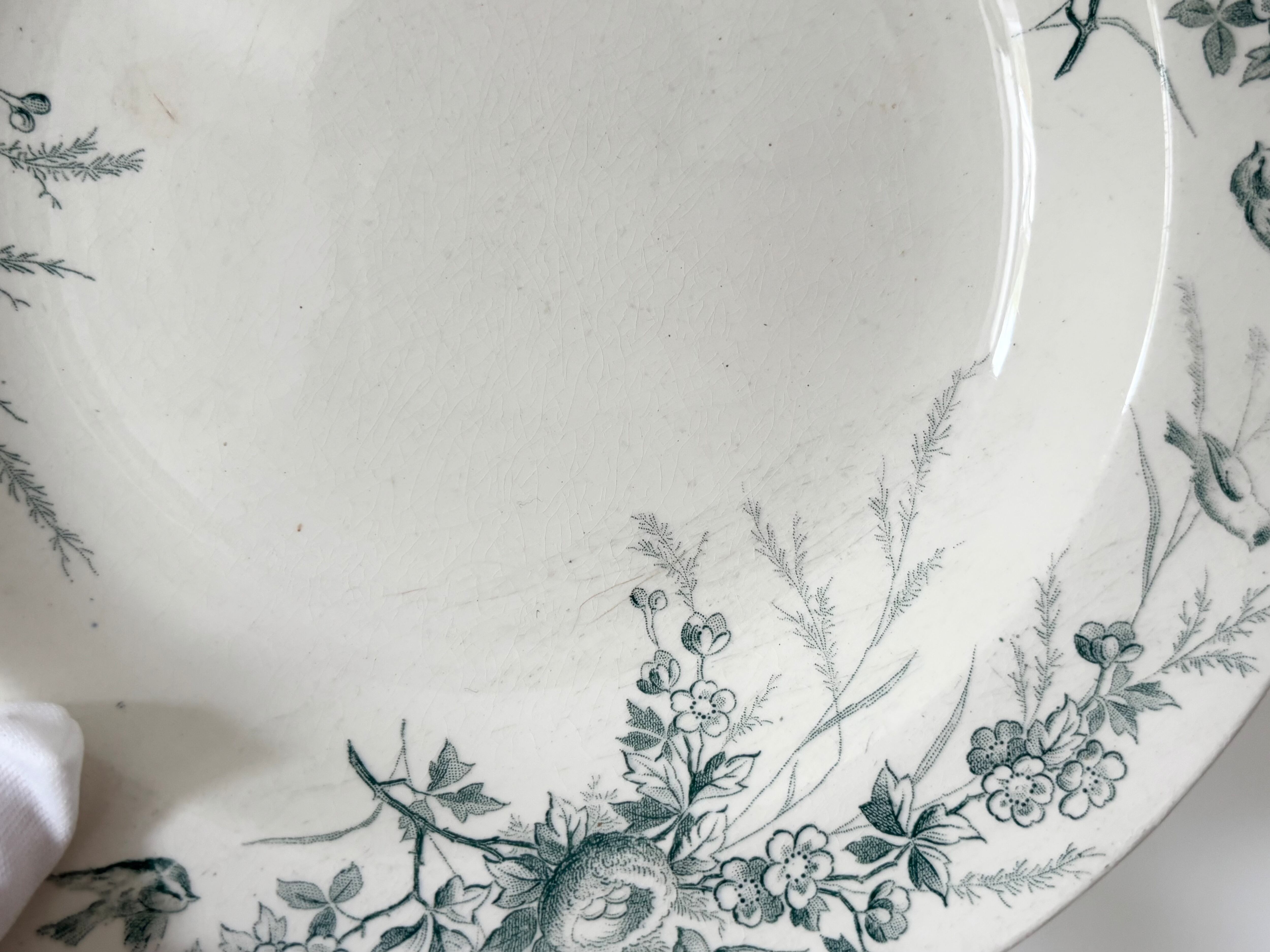 B Green : Creil et montereau / Linotte / deep plate / 19 century antique / France / bird /クレイユエモントロー / テールドフェール / 深皿 / 鳥