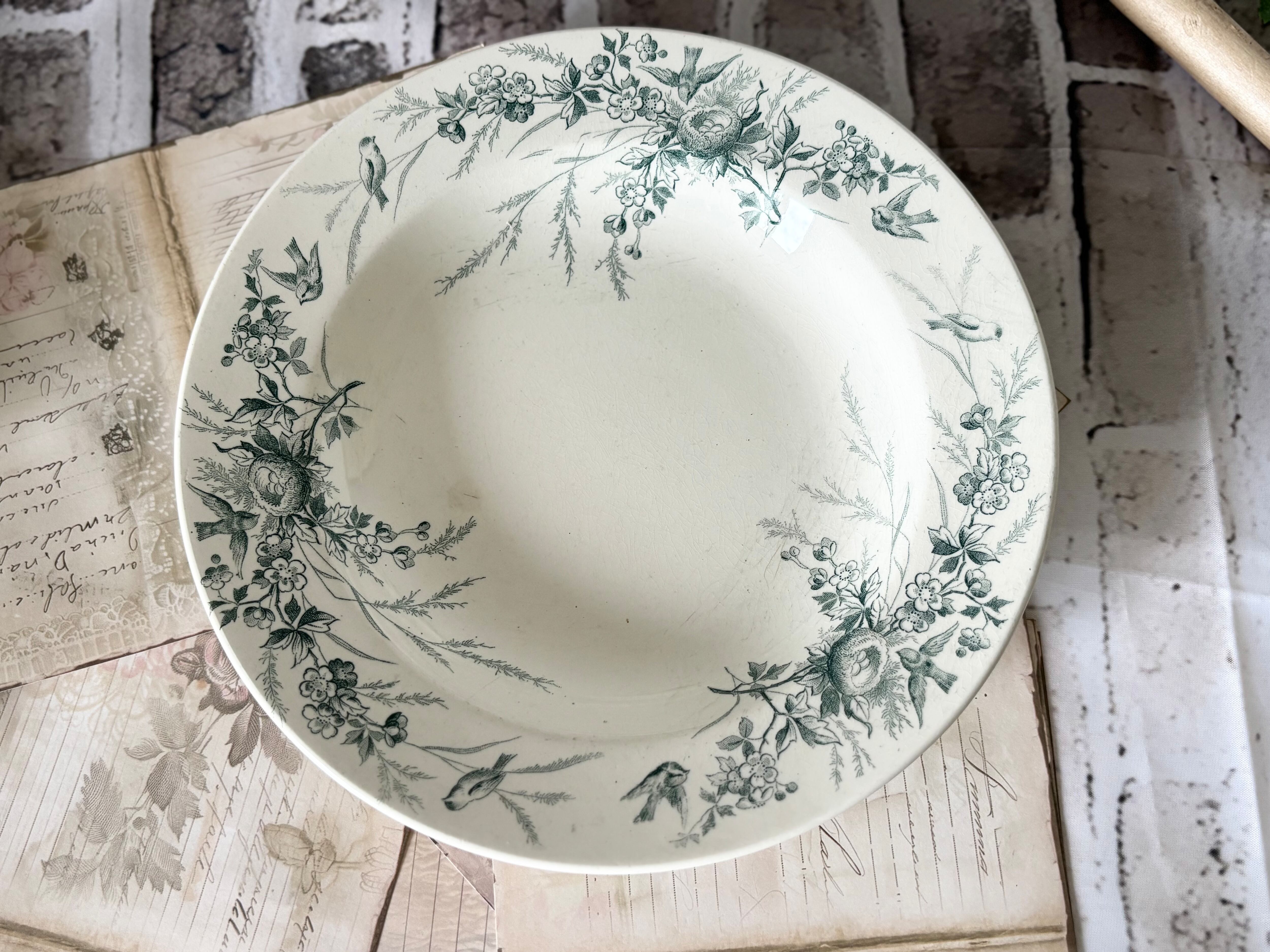 C Green : Creil et montereau / Linotte / deep plate / 19 century antique / France / bird /クレイユエモントロー / テールドフェール / 深皿 / 鳥