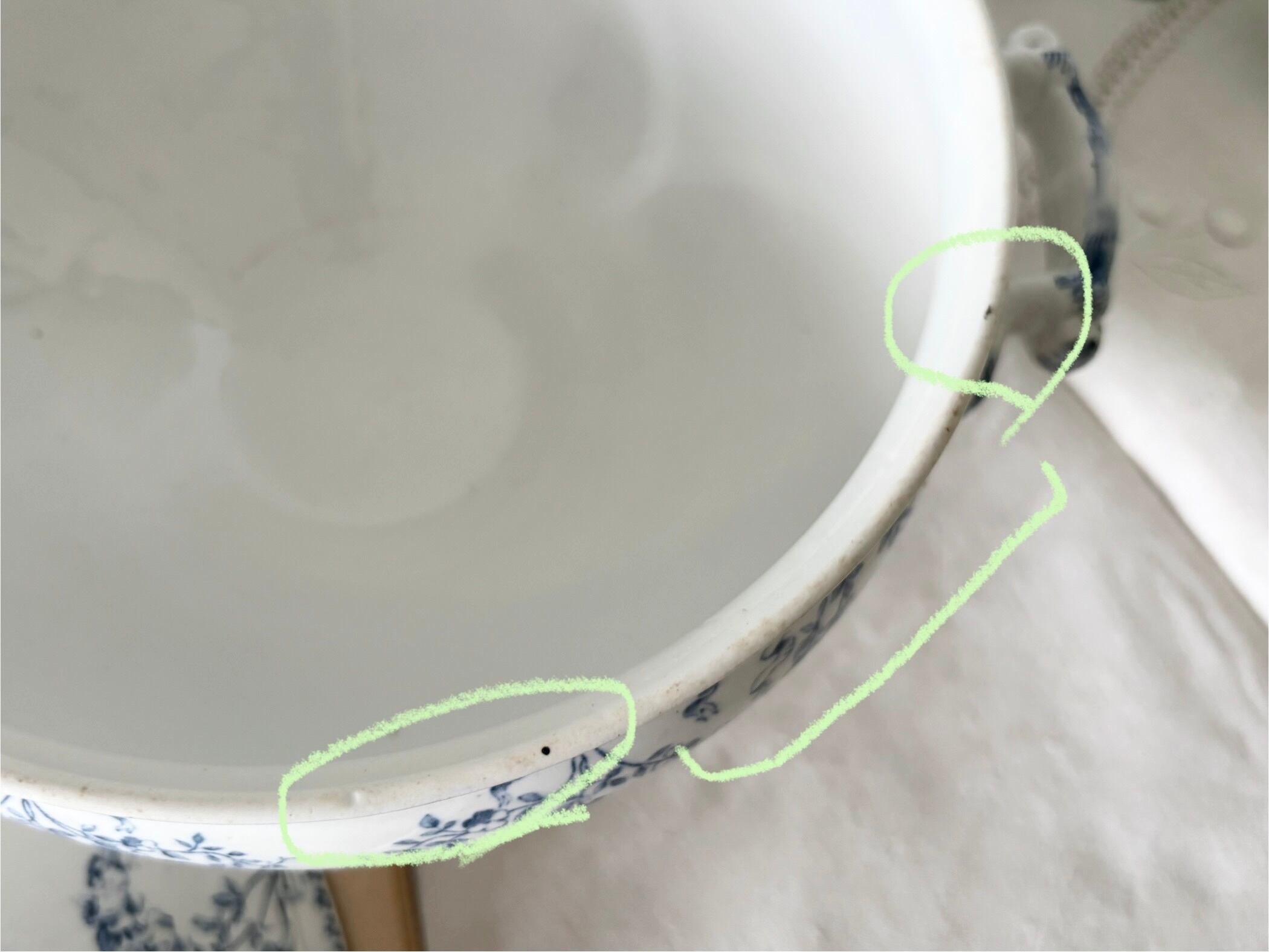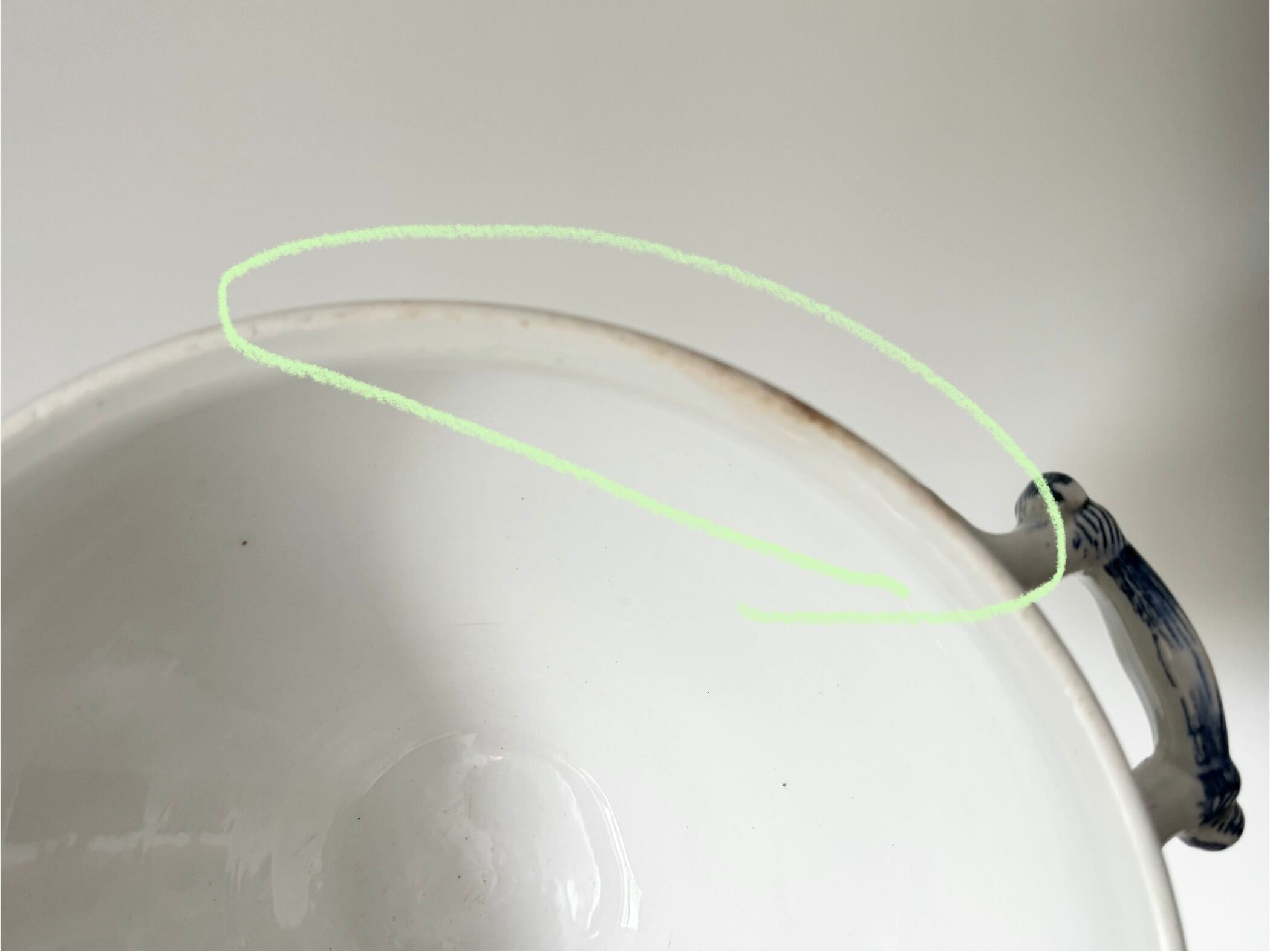 • 内側:全体的に艶があり、使用感の少ない非常にきれいな状態。器の縁に写真で印したように、小傷や薄いブラウンの変色があります。