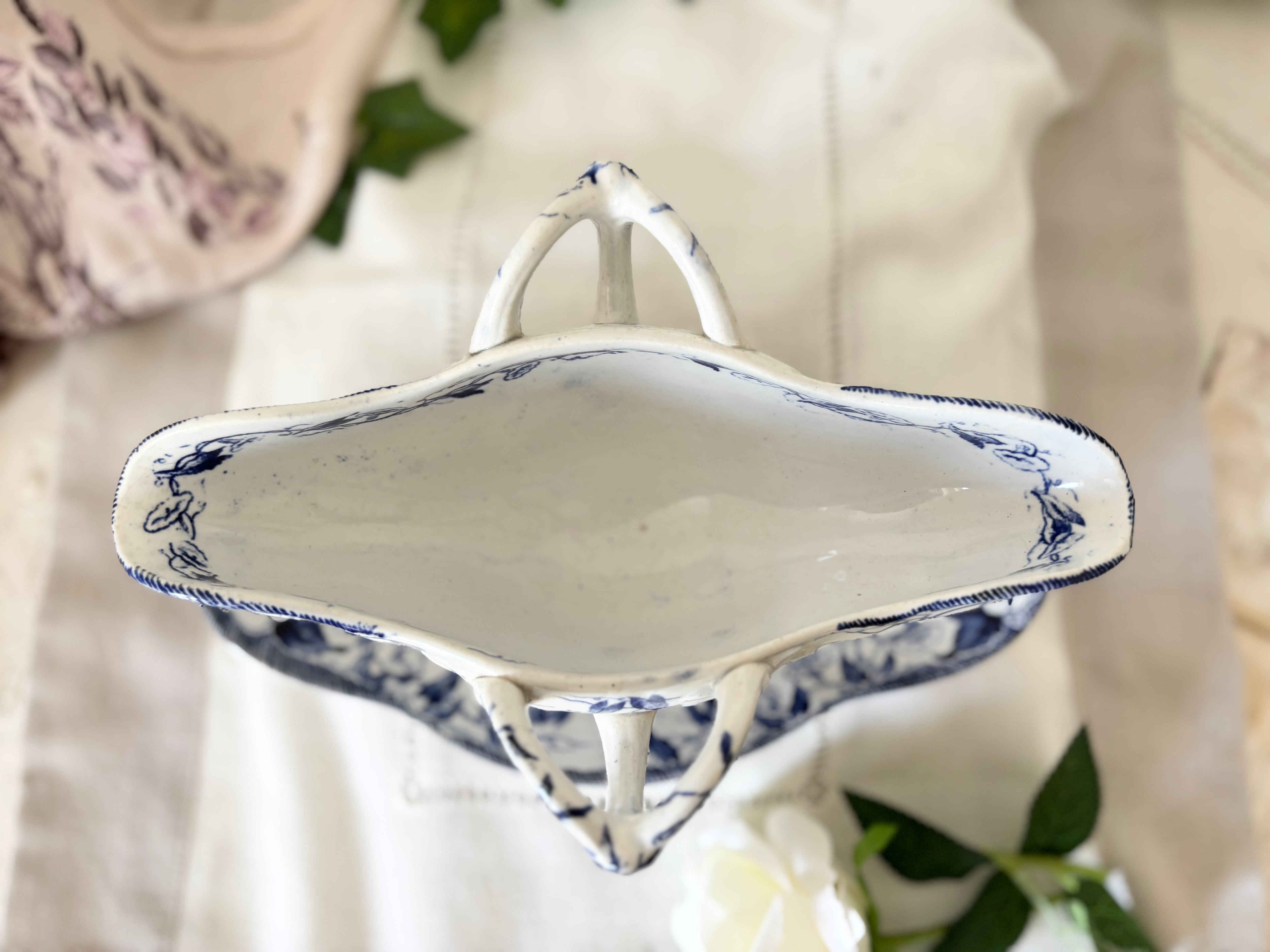 描かれている花模様は、アサガオ(Morning Glory)やワイルドローズ、パンジーなどを思わせるフローラルモチーフが用いられており、自然の植物を写実するというよりも、19世紀のヨーロッパで流行した装飾的かつ象徴的な花の意匠としてデザインされています。華やかでありながらも柔らかく上品な佇まいが魅力です。