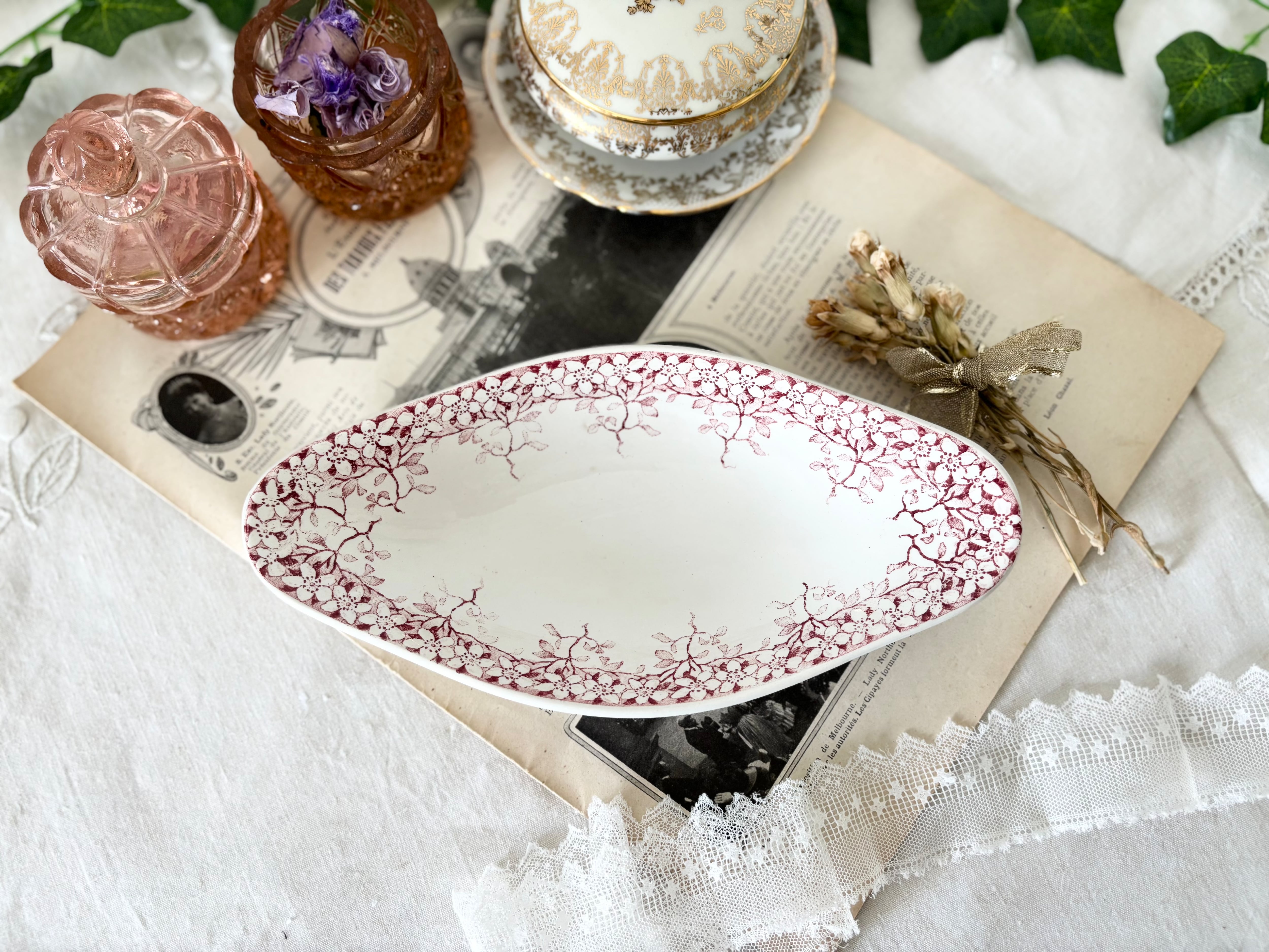 こちらは19世紀末〜1920年代頃に製造されたと考えられるヴィンテージ品で、深い赤色で表現された小花模様が縁を彩り、上品で可憐な印象を与えます。