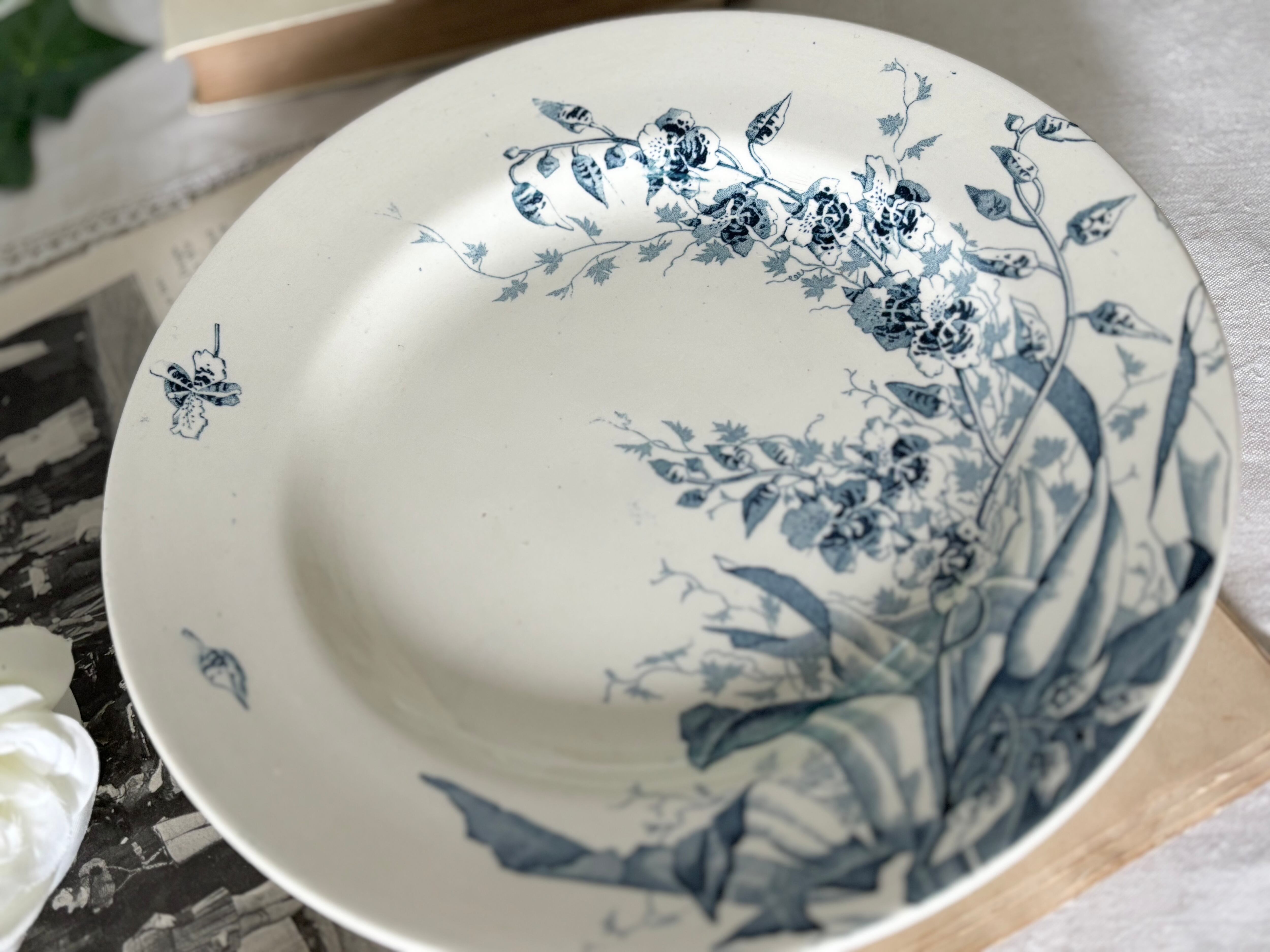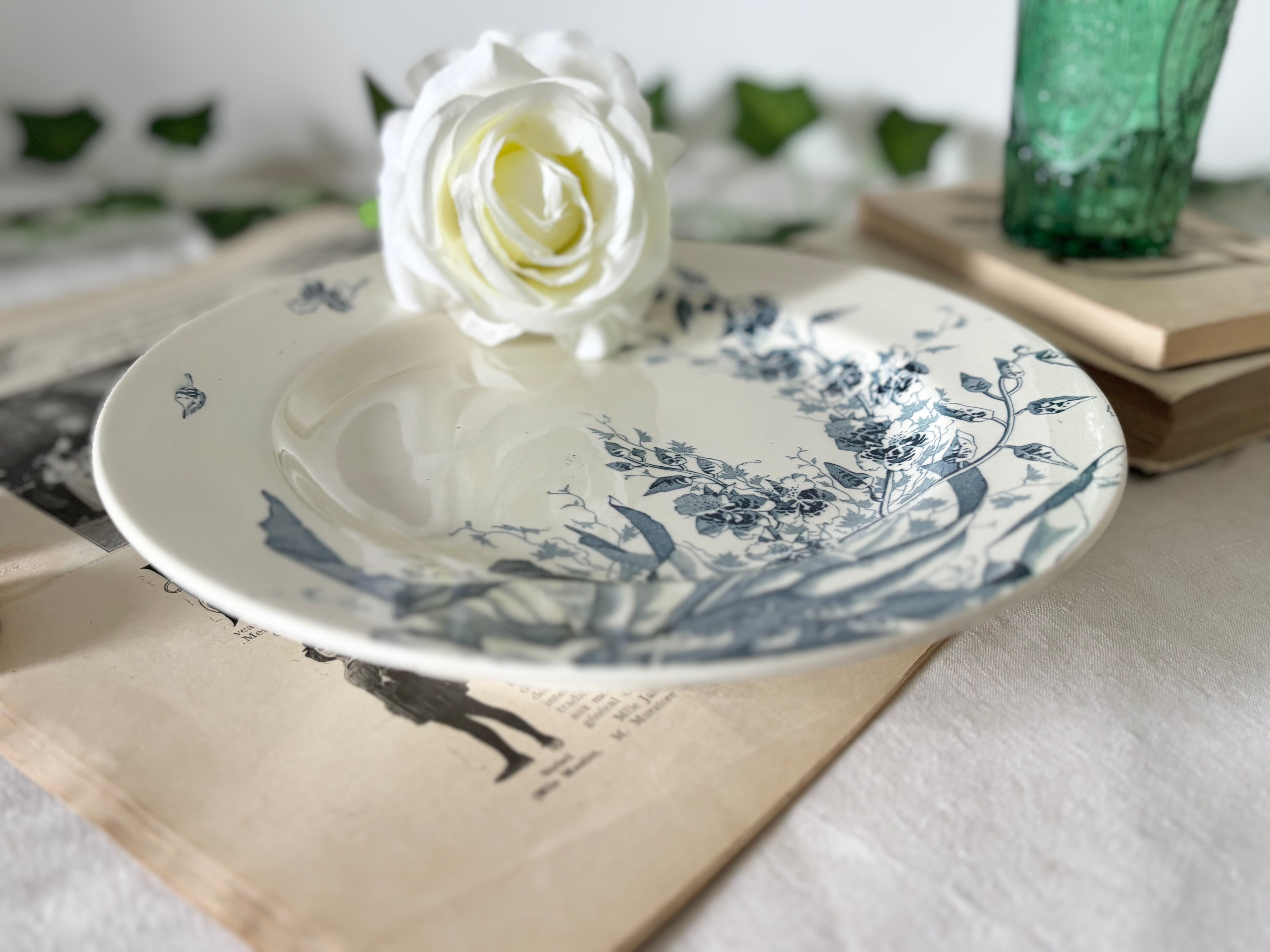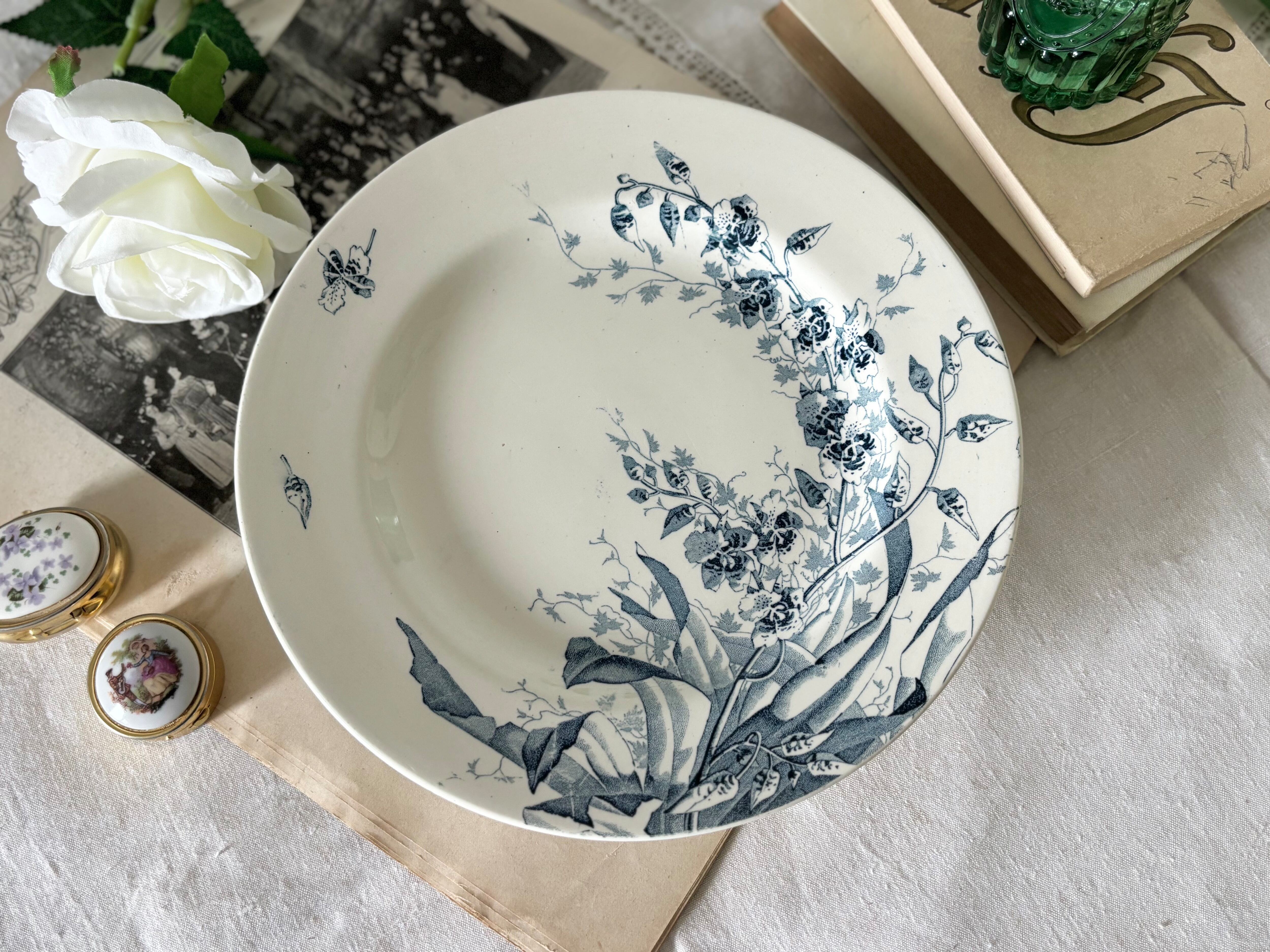 “JAVA”というシリーズ名に象徴されるように、当時のヨーロッパが抱いていた異国趣味への憧れが、繊細なデザインの随所に表れています。葉や花のモチーフは自然主義的でありながら装飾性が高く、プリント転写ならではの揺らぎが、器全体に静かな動きを与えています。