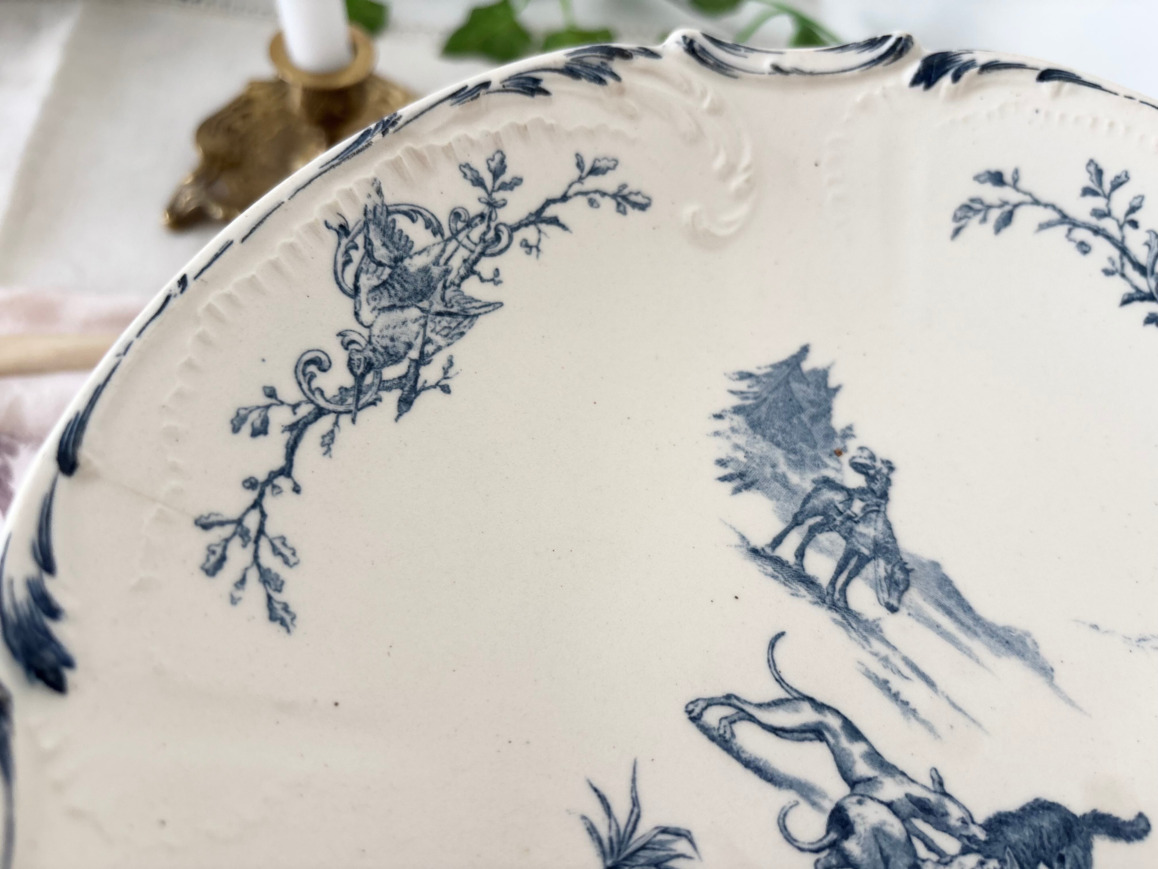 淡いクリームホワイトの陶肌に、森の中で佇む紳士と主人を守るべくして、狼に果敢に挑む犬たちの姿が青一色で優雅に描かれています。