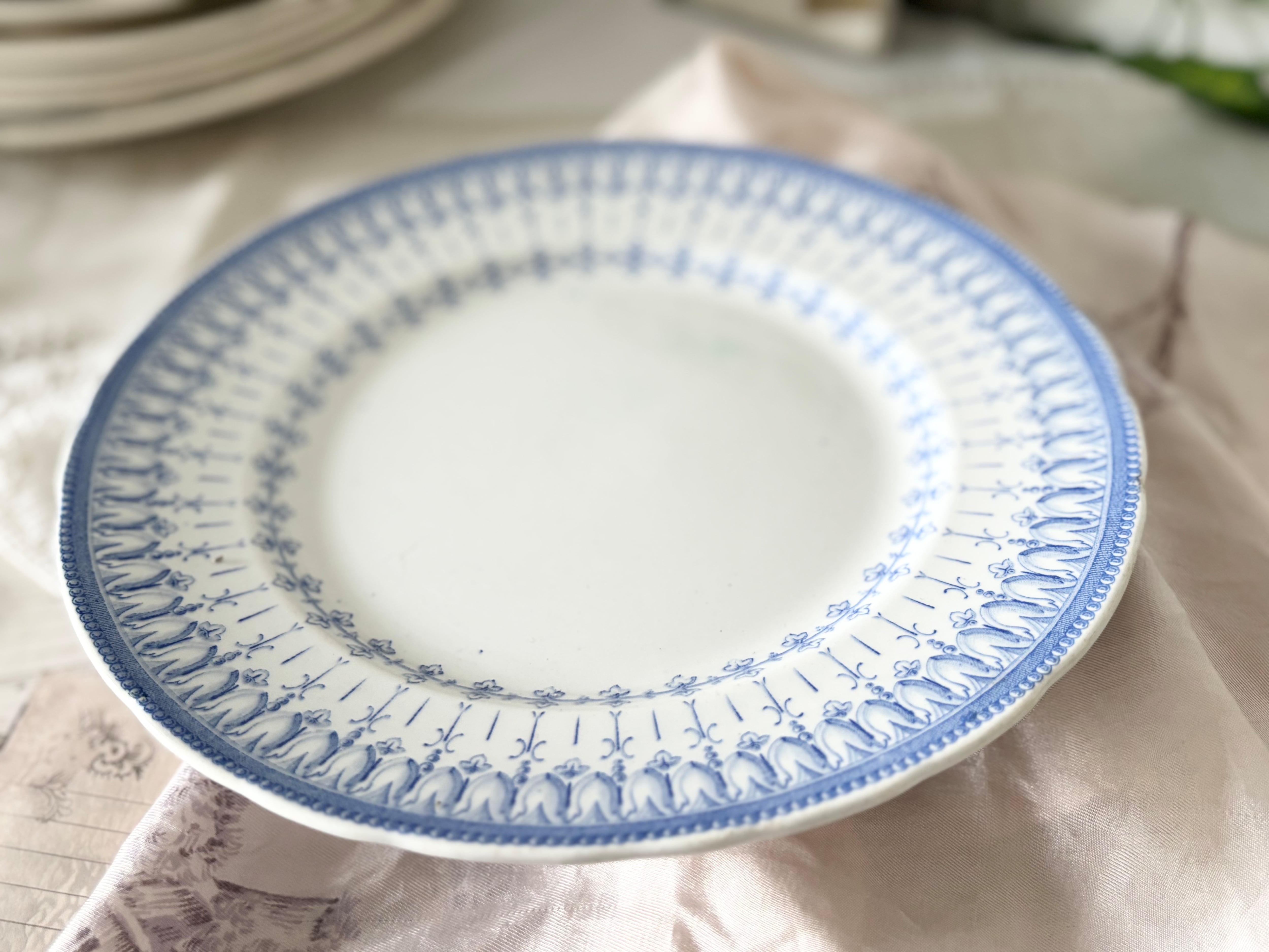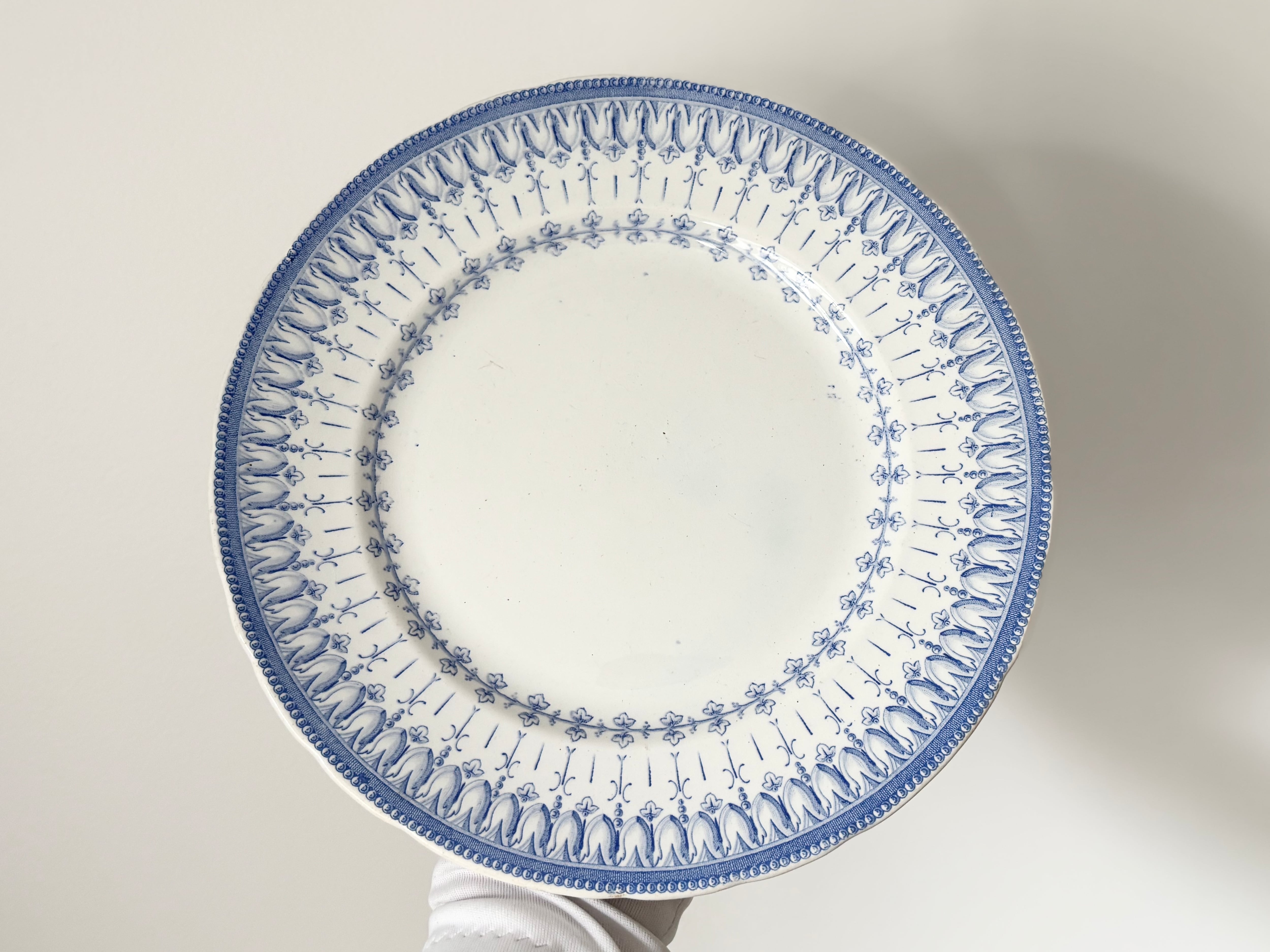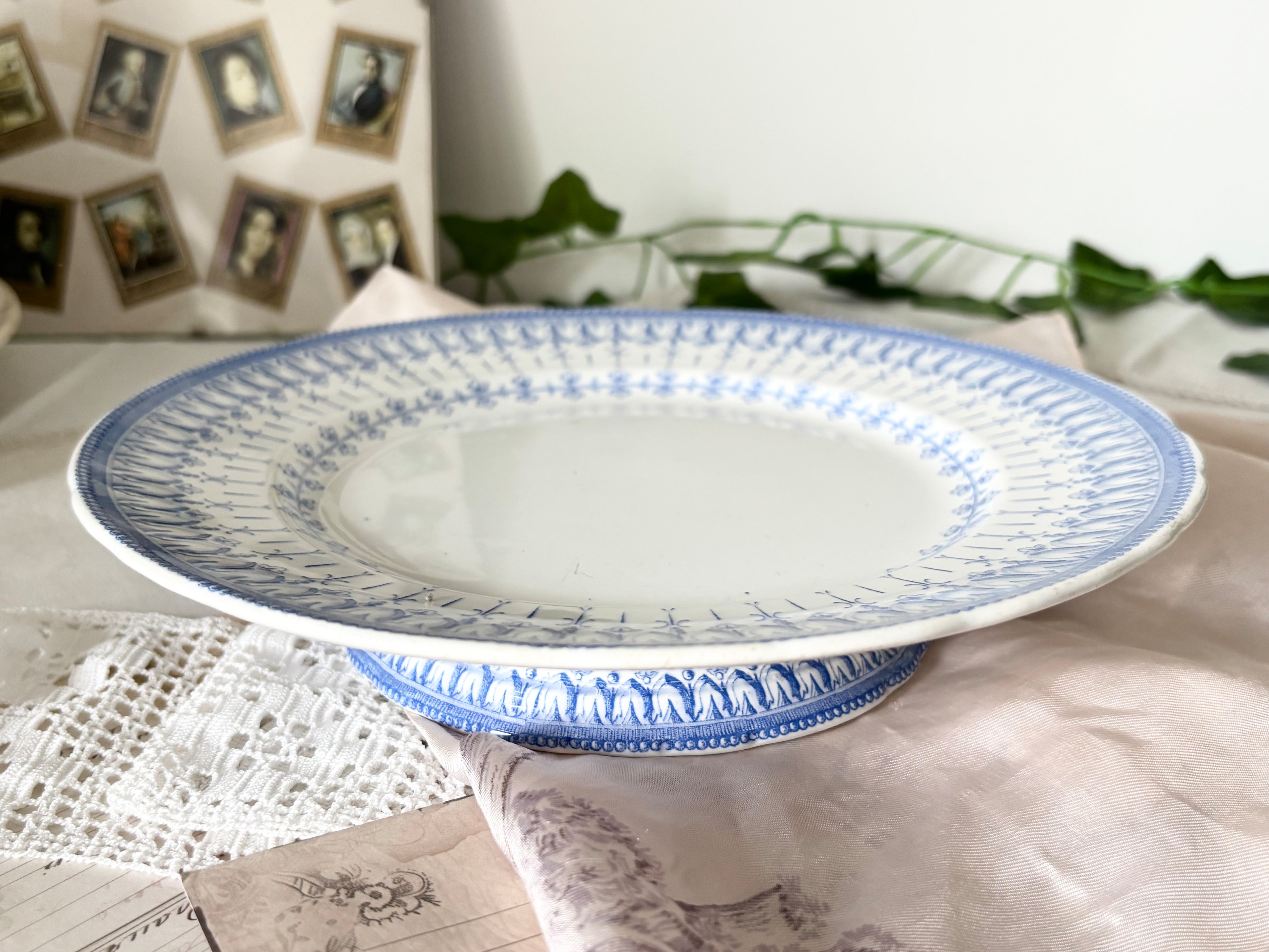 繊細なブルーの転写模様と立ち上がりのある低めの高台が特徴で、クラシカルかつ端正なフォルムを備えています。