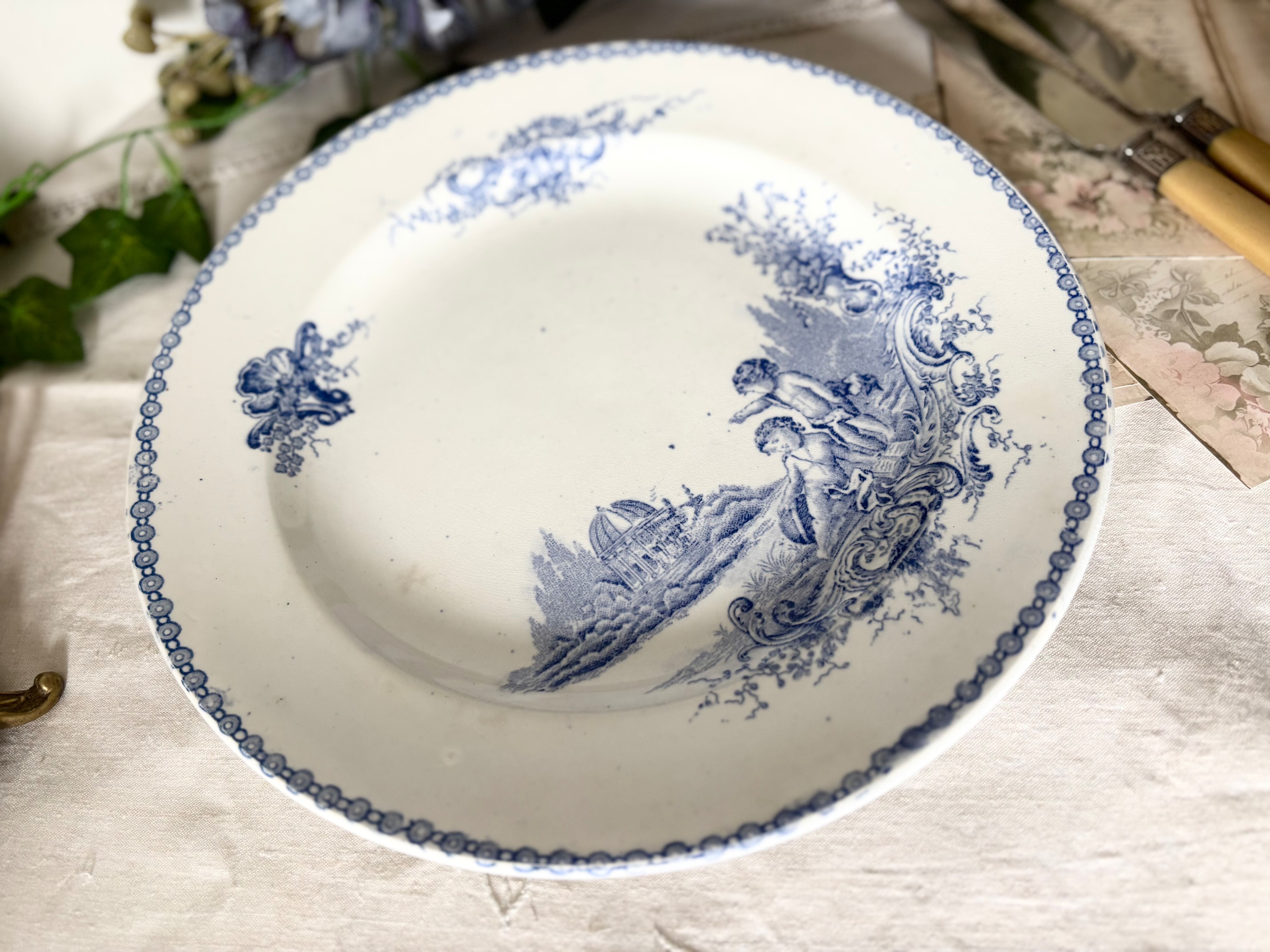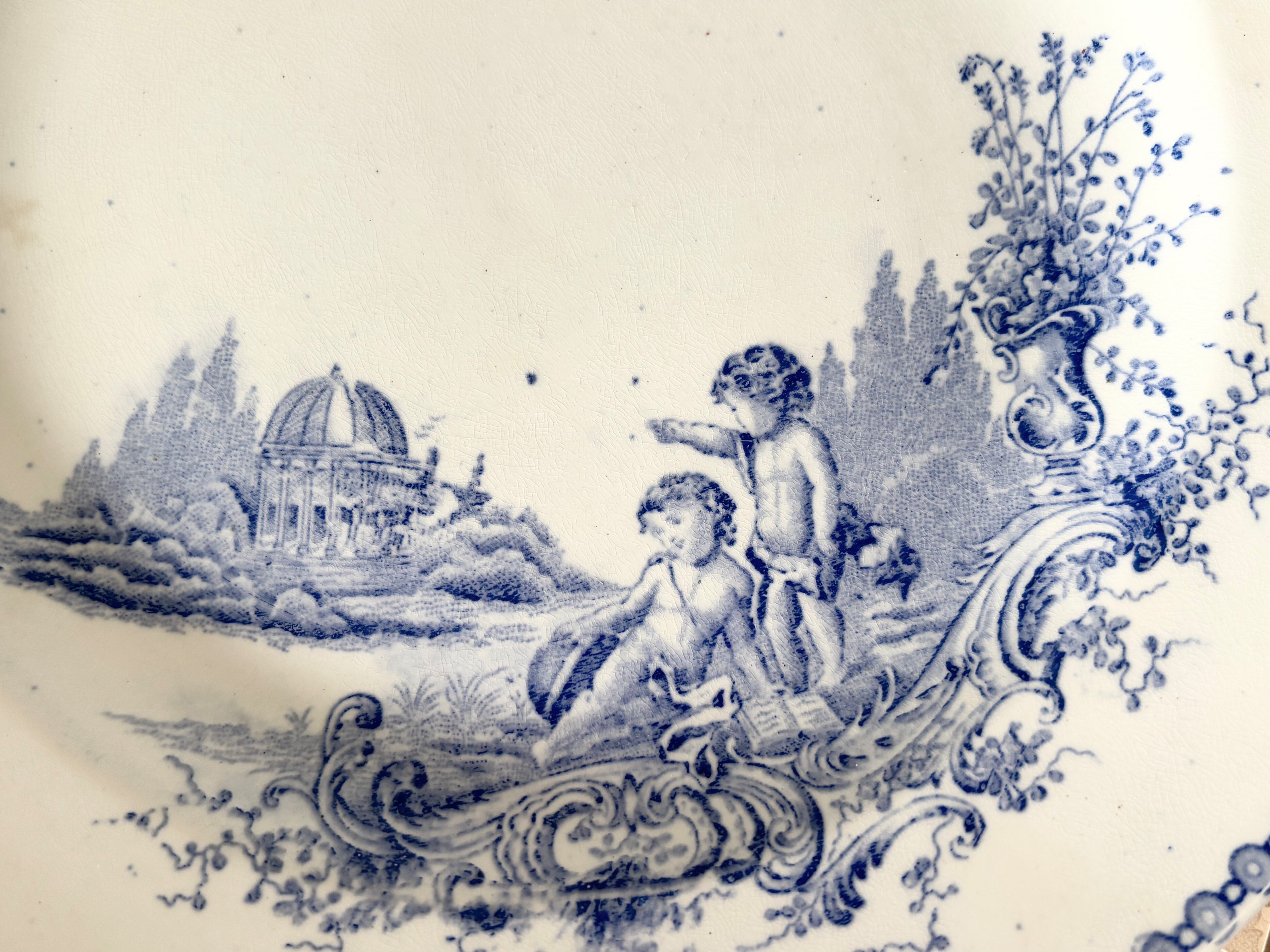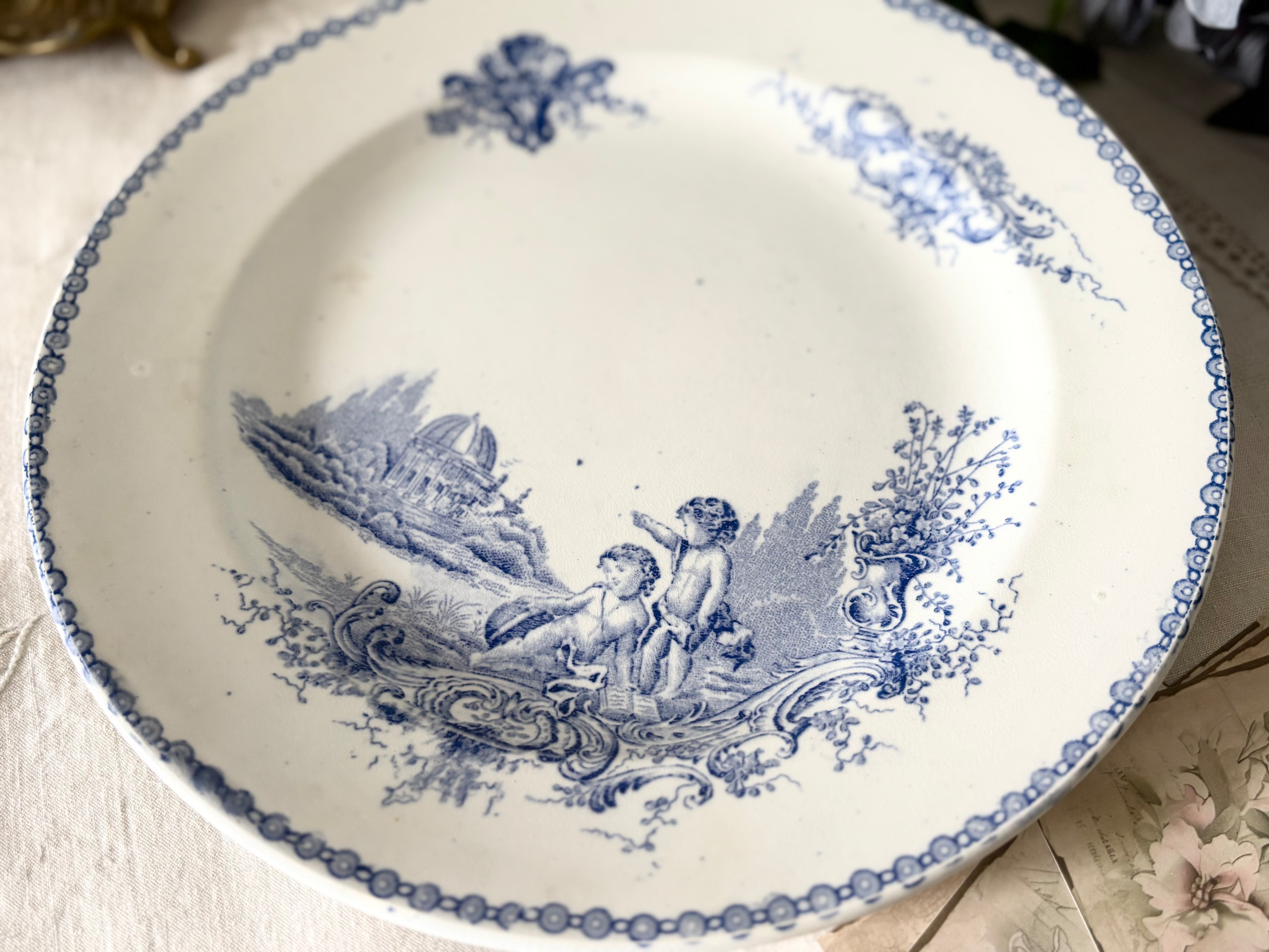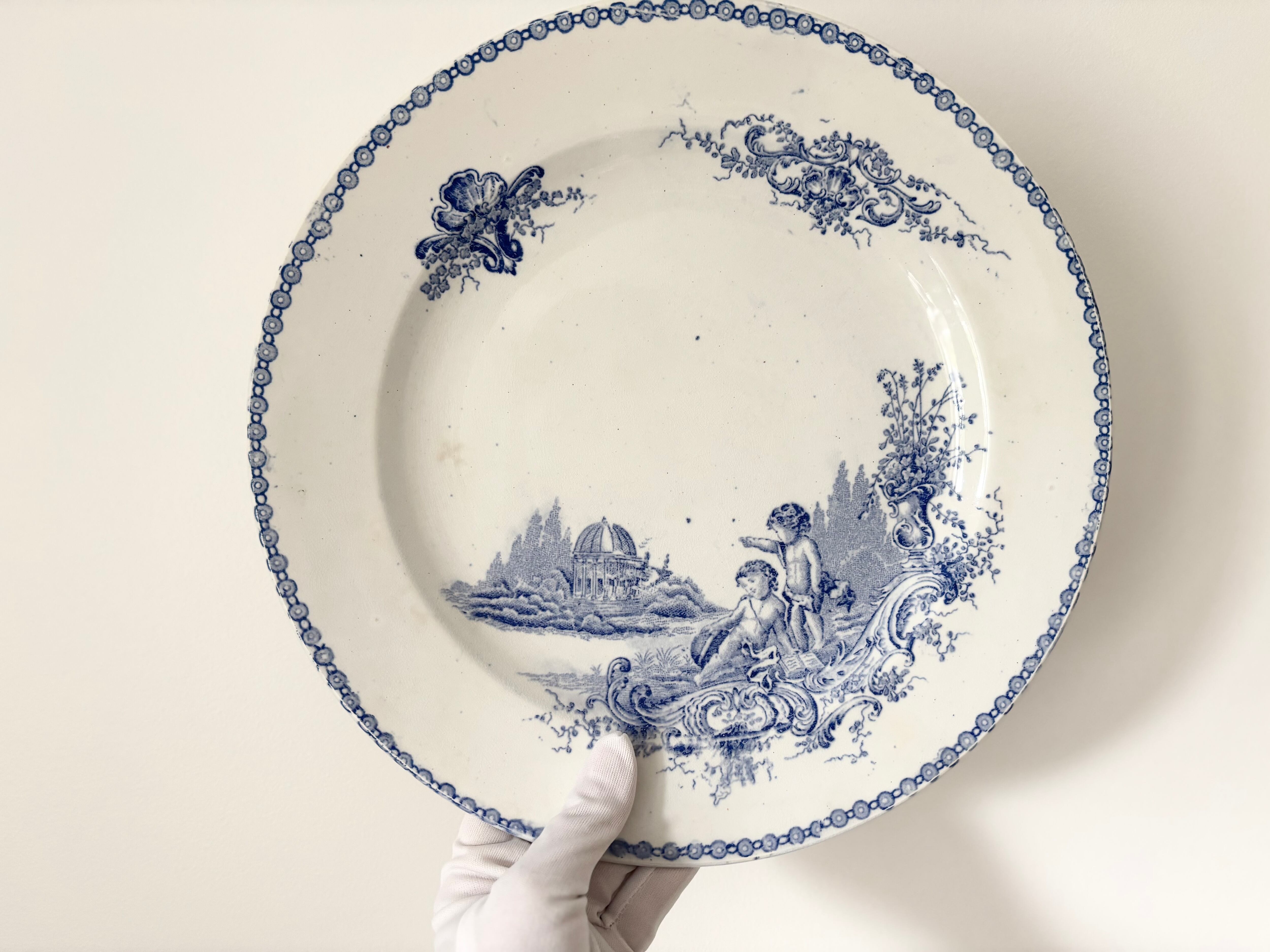 19世紀フランス、ボルドーの名窯 Jules Vieillard(ジュール・ヴィヤール) による、“St. Trianon” シリーズの大型ディナープレート。神殿や植物、愛らしいプット(putto)たちを描いたロココ調の転写画が美しい一枚です。柔らかく広がる青のグラデーションが、古典的で優雅な雰囲気を醸し出しています。