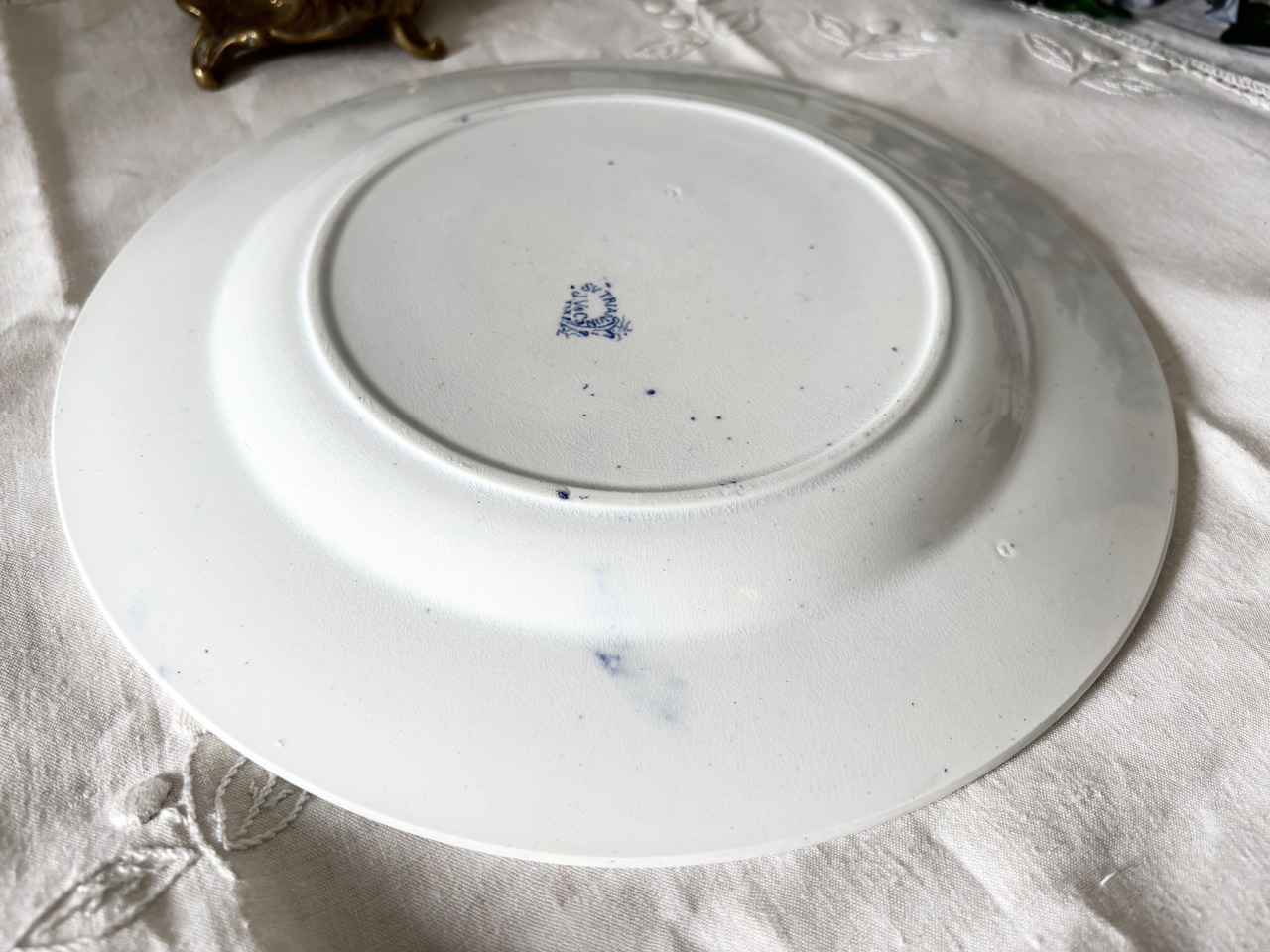 直径約29.5cmとやや大ぶりで、壁面ディスプレイとしても映えます。繊細な絵柄と風合いが、日常使いからインテリアのアクセントまで幅広く活躍する、フレンチアンティークの魅力が詰まった逸品です。