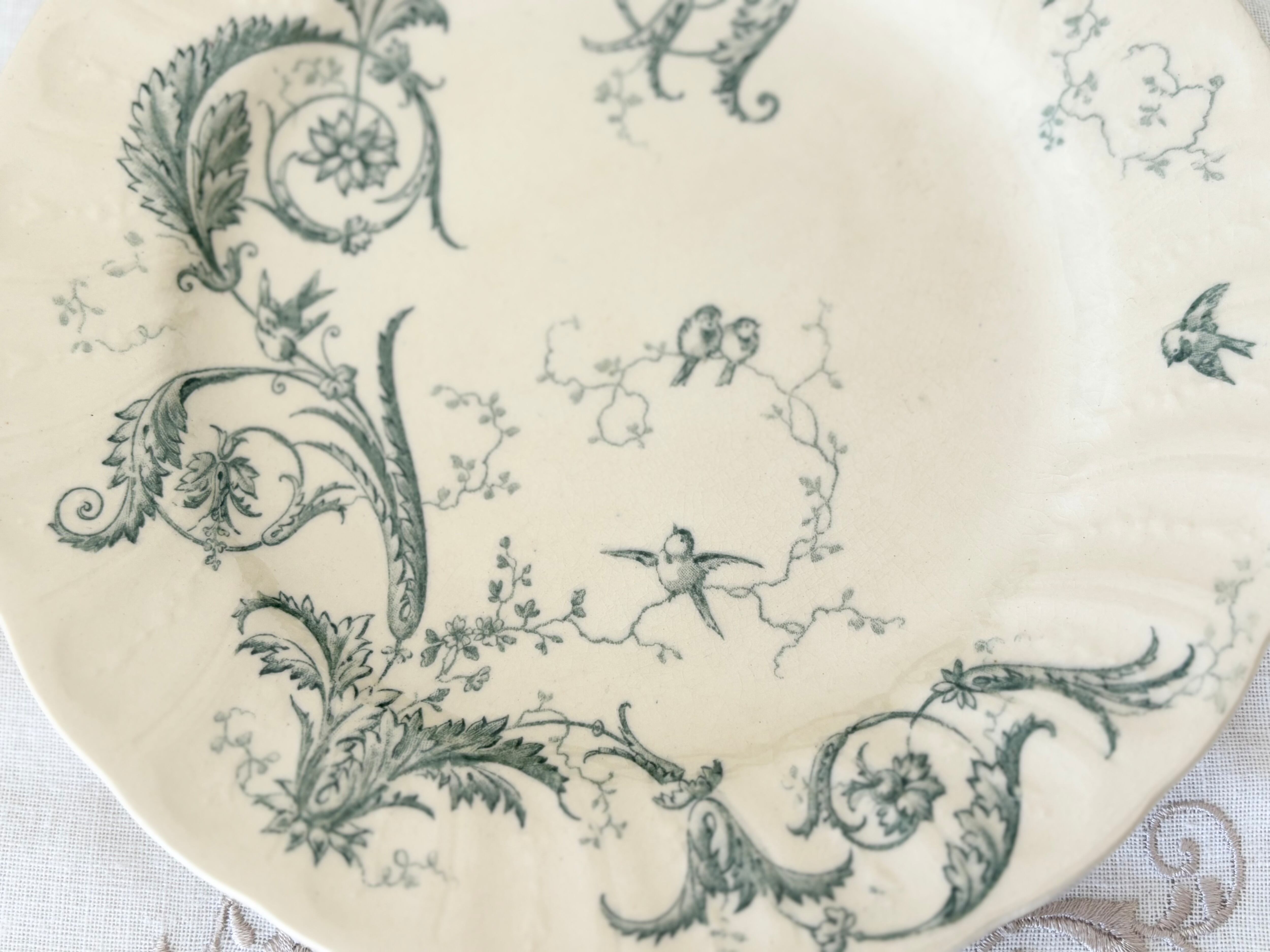 C: 21cm GIEN / Rinceaux / 19世紀 / 鳥 / 緑 / デザートプレート / フランス / アンティーク