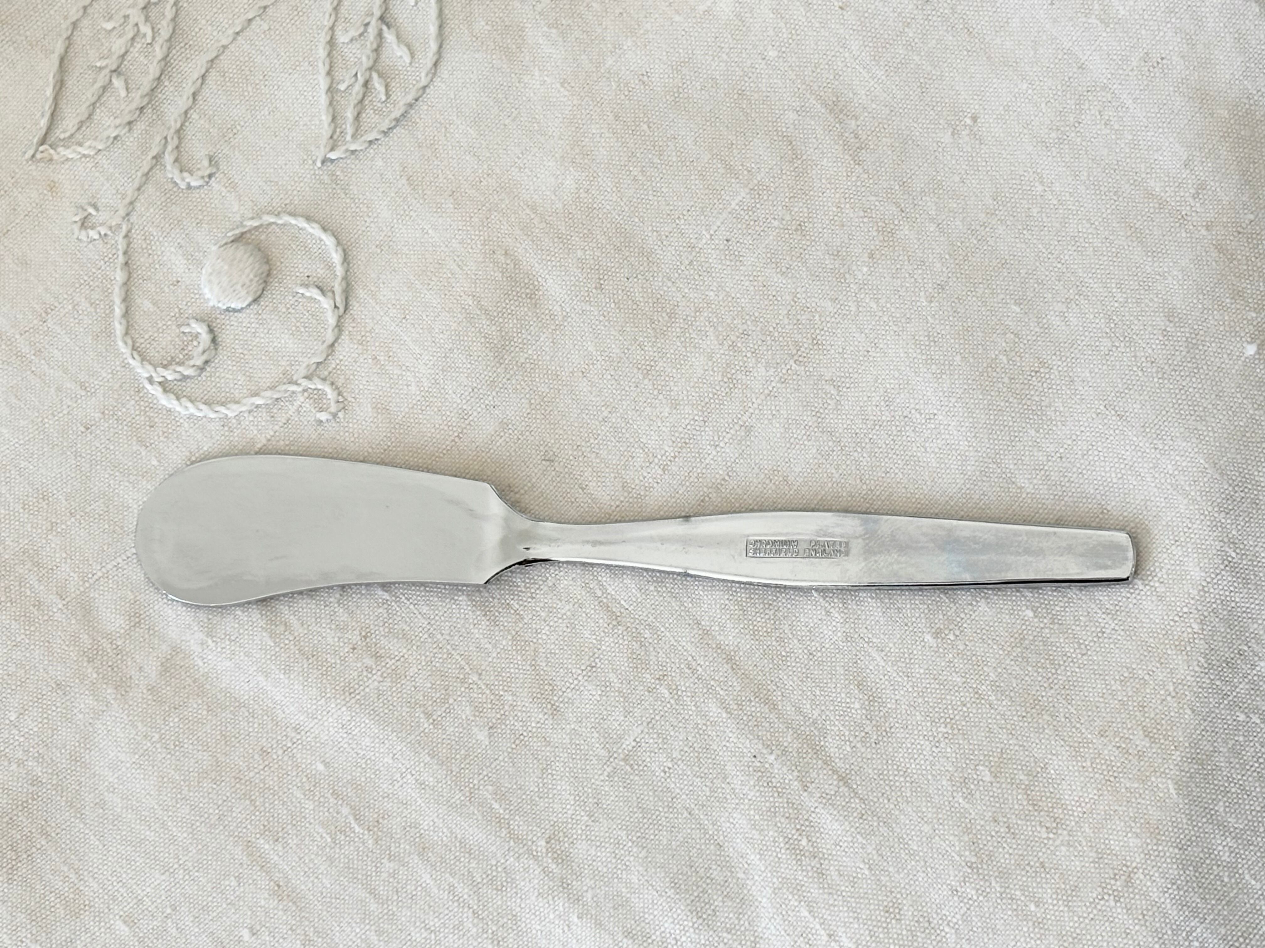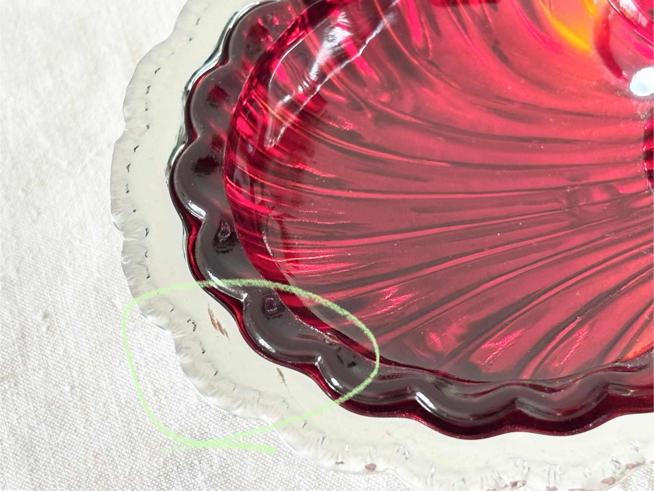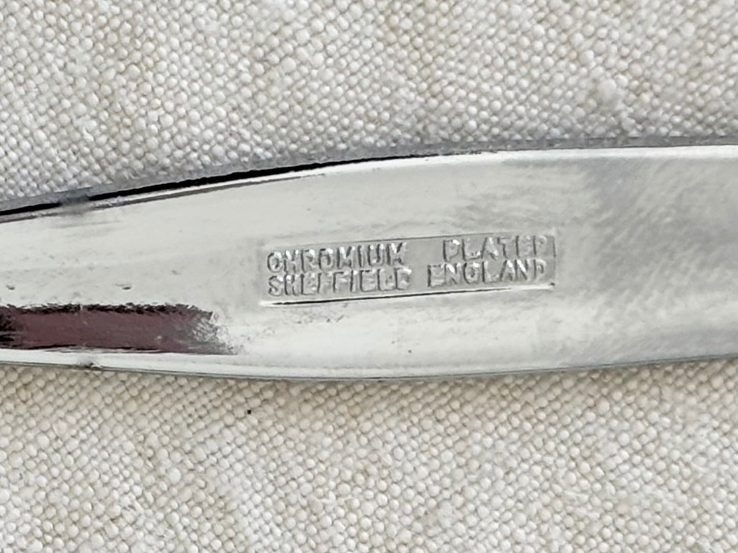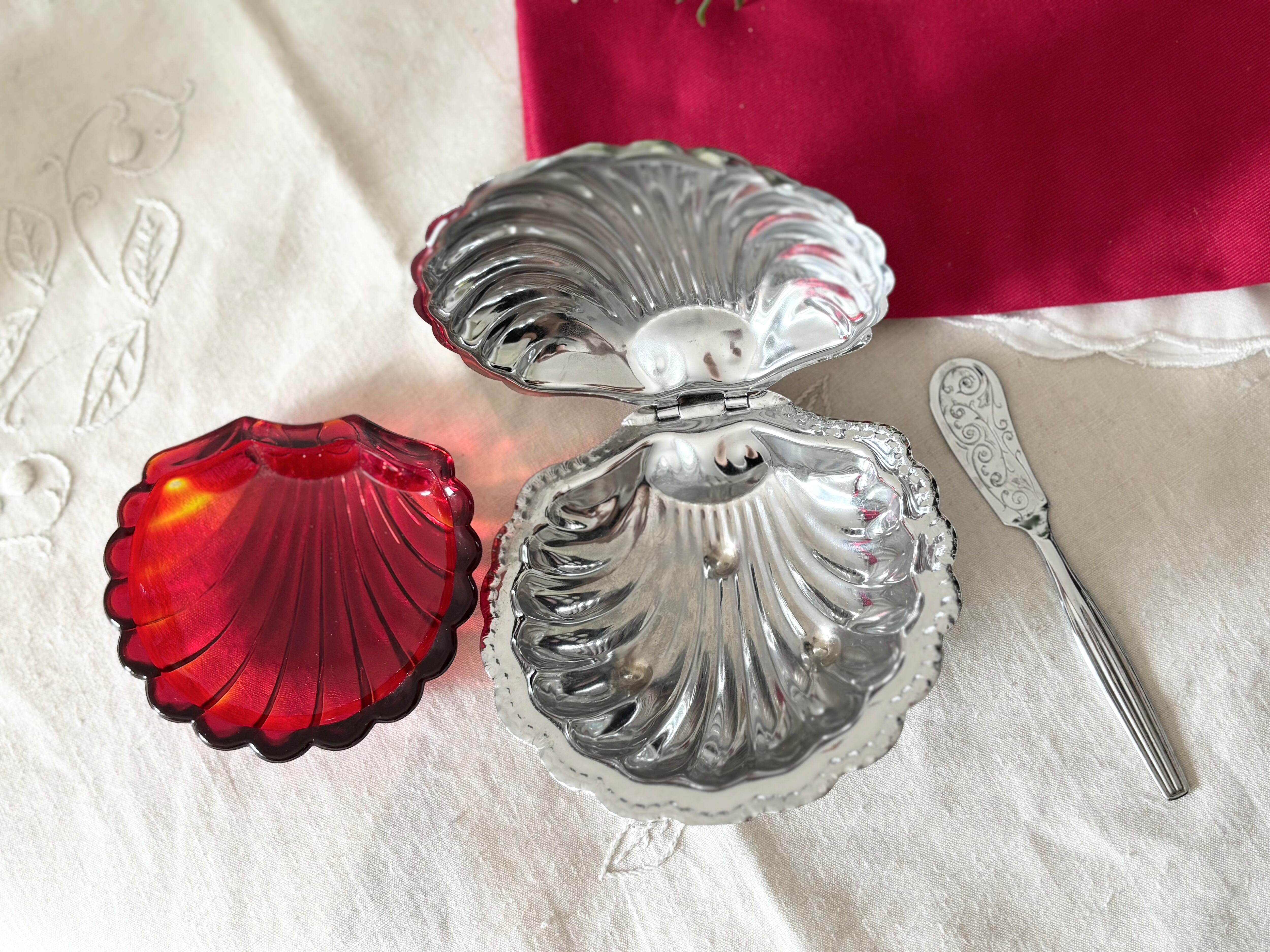 同型のリファレンスから、製作年代はおおよそ1950〜60年代頃と考えられます(当時流行したシルバー色の貝殻型ケース+赤いガラス皿の組み合わせ)。付属の小さなバターナイフはSHEFFIELD ENGLANDのもので、銀メッキ製です。