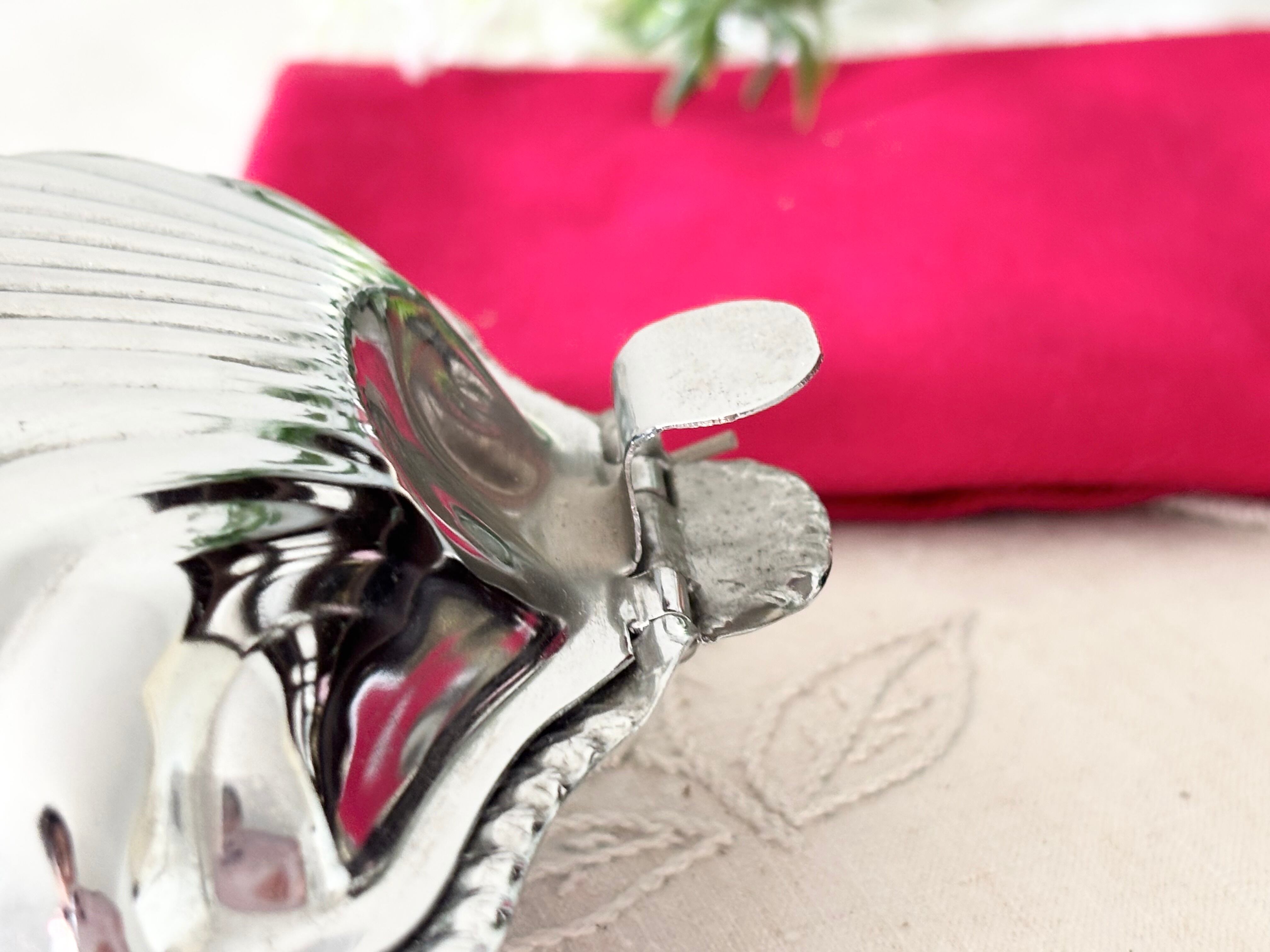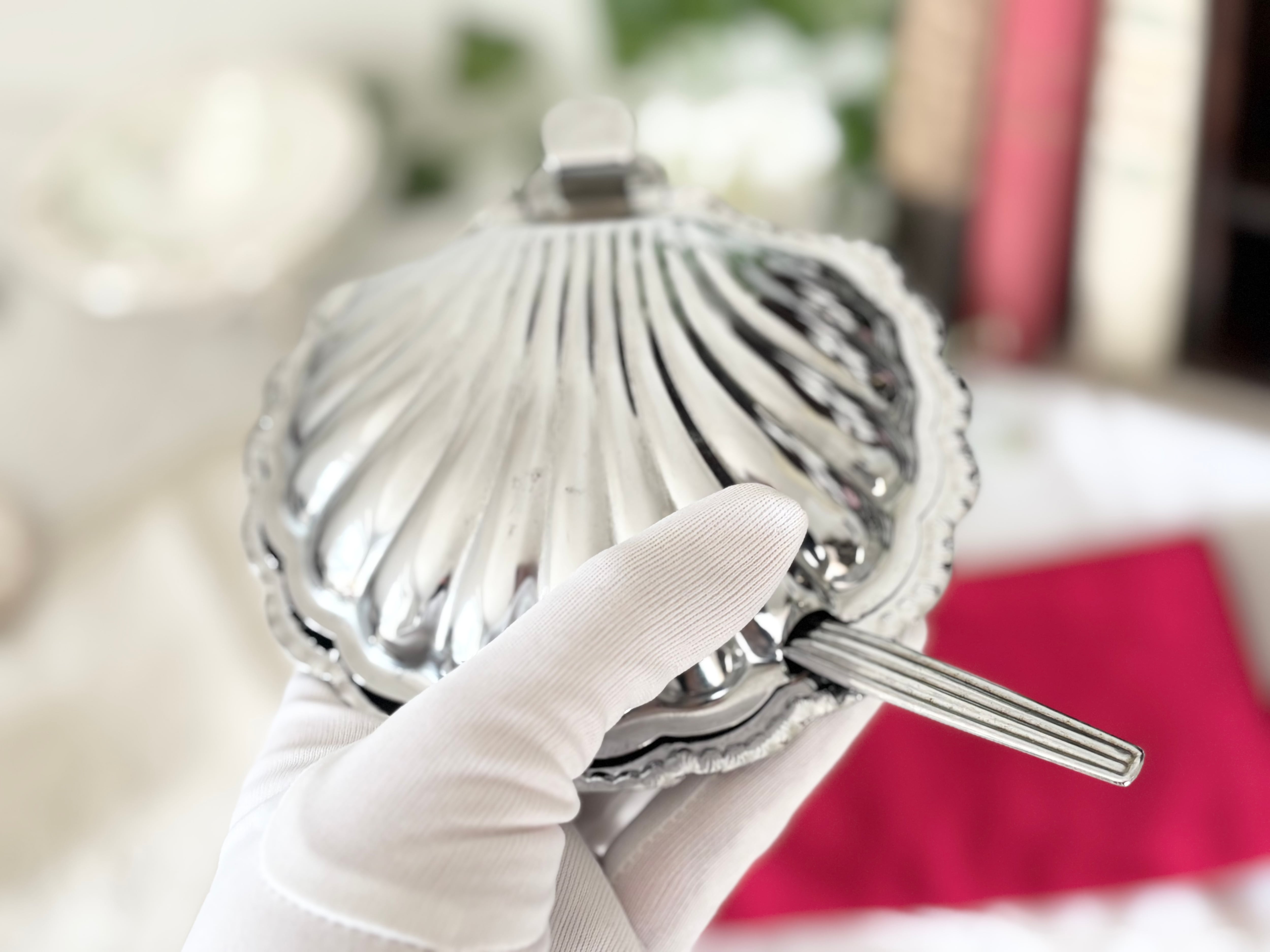ふっくらとした殻のレリーフ、ビーディング装飾の縁取り、パタリと閉じるヒンジの音……。古き良き時代のムードを食卓に添える、アンティークらしい味わいが魅力の一点です。